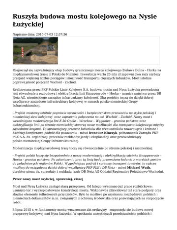Ruszyła budowa mostu kolejowego na Nysie Łużyckiej Napisano dnia: 2015-07-03 12:37:36 Rozpoczął się najważniejszy etap budowy granicznego mostu kolejowego Bielawa Dolna – Horka na międzynarodowej trasie z Polski do Niemiec. Inwestycja warta 23 mln zł zapewni dwa razy szybszy przejazd większej liczbie pociągów i możliwość transportu cięższych ładunków. Most istotnie poprawi jakość połączeń Wschód - Zachód. Realizowana przez PKP Polskie Linie Kolejowe S.A. budowa mostu nad Nysą Łużycką prowadzona jest równolegle z rozbudową i elektryfikacją linii Knappenrode – Horka – granica państwa przez DB Netz AG, niemieckiego zarządcę infrastruktury kolejowej. Oba projekty toczą się dzięki dobrej współpracy zarządców infrastruktury kolejowej w ramach polsko-niemieckiej Grupy Infrastrukturalnej. - Projekt mostowy istotnie poprawia sprawności i bezpieczeństwo przewozów na styku polskiej i niemieckiej sieci kolejowej oraz usprawnia połączenia na osi Wschód – Zachód. Nowy most i wcześniejsza modernizacja lini E 30 Opole – Wrocław – Węgliniec – granica państwa oraz elektryfikacja linii po stronie niemieckiej stworzą nowe możliwości dla transportu kolejowego między sąsiednimi krajami. To sprawniejszy przewóz ładunków dla przewoźników towarowych i krótsza i bardziej komfortowa podróż dla pasażerów - mówi Ireneusz Kluczyk, pełnomocnik Zarządu PKP PLK S.A. ds. organizacji procesów rozkładów jazdy i eksploatacji oraz przewodniczący polsko-niemieckiej Grupy Infrastrukturalnej. Modernizacja międzynarodowej trasy toczy się równocześnie po stronie polskiej i niemieckiej. - Projekt polski łączy się bezpośrednio z naszą modernizacją i elektryfikacją odcinka Knappenrode – Horka - granica państwa. Po zakończeniu prac tą linią będą przewożone ładunki z morskich portów do południowych regionów Polski. Wygodniejsza podróż i sprawny transport towarów, to sukces możliwy do osiągnięcia dzięki dobrej współpracy PKP PLK i DB Netz – mówi Michael Wuth, dyrektor pionu ds. sprzedaży i rozkładu jazdy DB Netz AG Oddział Regionalny Południowo-Wschodni. Przez nowy most szybciej, sprawniej, ciszej Most nad Nysą Łużycka zastąpi starą przeprawę. Od lutego wykonano już prace rozbiórkowe: usunięto tor i wyeksploatowane konstrukcje mostu. Wykonawca zlikwidował też stare podpory oraz zbędne elementy żelbetowych przyczółków. Było to możliwe po uzyskaniu niezbędnych polskich i niemieckich dokumentów m.in. związanych z ochroną środowiska oraz pozwalających na rozpoczęcie robót. 3 lipca 2015 r. w fundamenty mostu wmurowano akt erekcyjny - rozpoczęła się budowa nowej przeprawy kolejowej nad Nysą Łużycką. W spotkaniu uczestniczyli przedstawiciele polskich i niemieckich władz samorządowych oraz przedstawiciele polsko-niemieckiej Grupy Infrastrukturalnej, zarządców infrastruktury kolejowej PKP Polskie Linie Kolejowe S.A i DB Netz AG, wykonawcy. Długość mostu wyniesie blisko 160 metrów - o 23 metry więcej, niż poprzedniej przeprawy. Obiekt zapewni przejazd pociągów po dwóch torach, ponad dwukrotnie szybciej - nie 50 km/h lecz 120 km/h. Inwestor zwiększy również nośność obiektu, czyli składy będą mogły wozić cięższe ładunki. Tory na nowym moście, podobnie jak zmodernizowana linia E 30, zostaną zelektryfikowane. Sprawny i bezpieczny ruch pociągów pomiędzy granicznymi stacjami - Węglińcem i Horką zapewnią nowoczesne urządzenia automatyki i telekomunikacji. Zadbano również o ochronę środowiska. Konstrukcja toru zapewni cichy przejazd pociągu, a montaż zabezpieczeń ograniczy zanieczyszczenia wody odprowadzanej z mostu. Koszt realizowanego projektu „Modernizacja linii kolejowej E 30, etap II, odcinek Bielawa Dolna – Horka: budowa mostu przez Nysę Łużycką oraz elektryfikacja” wynosi około 23 mln zł, z czego prawie 17,5 mln zł pochodzi ze środków Funduszu Spójności w ramach Programu Operacyjnego Infrastruktura i Środowisko. Źródło: Mirosław Siemieniec, rzecznik prasowy PKP Polskie Linie Kolejowe
