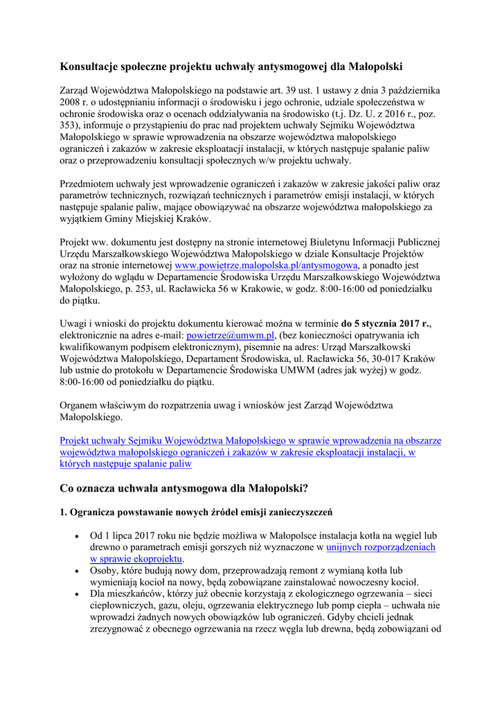 Konsultacje społeczne projektu uchwały antysmogowej dla Małopolski Zarząd Województwa Małopolskiego na podstawie art. 39 ust. 1 ustawy z dnia 3 października 2008 r. o udostępnianiu informacji o środowisku i jego ochronie, udziale społeczeństwa w ochronie środowiska oraz o ocenach oddziaływania na środowisko (t.j. Dz. U. z 2016 r., poz. 353), informuje o przystąpieniu do prac nad projektem uchwały Sejmiku Województwa Małopolskiego w sprawie wprowadzenia na obszarze województwa małopolskiego ograniczeń i zakazów w zakresie eksploatacji instalacji, w których następuje spalanie paliw oraz o przeprowadzeniu konsultacji społecznych w/w projektu uchwały. Przedmiotem uchwały jest wprowadzenie ograniczeń i zakazów w zakresie jakości paliw oraz parametrów technicznych, rozwiązań technicznych i parametrów emisji instalacji, w których następuje spalanie paliw, mające obowiązywać na obszarze województwa małopolskiego za wyjątkiem Gminy Miejskiej Kraków. Projekt ww. dokumentu jest dostępny na stronie internetowej Biuletynu Informacji Publicznej Urzędu Marszałkowskiego Województwa Małopolskiego w dziale Konsultacje Projektów oraz na stronie internetowej www.powietrze.malopolska.pl/antysmogowa, a ponadto jest wyłożony do wglądu w Departamencie Środowiska Urzędu Marszałkowskiego Województwa Małopolskiego, p. 253, ul. Racławicka 56 w Krakowie, w godz. 8:00-16:00 od poniedziałku do piątku. Uwagi i wnioski do projektu dokumentu kierować można w terminie do 5 stycznia 2017 r., elektronicznie na adres e-mail: [email protected], (bez konieczności opatrywania ich kwalifikowanym podpisem elektronicznym), pisemnie na adres: Urząd Marszałkowski Województwa Małopolskiego, Departament Środowiska, ul. Racławicka 56, 30-017 Kraków lub ustnie do protokołu w Departamencie Środowiska UMWM (adres jak wyżej) w godz. 8:00-16:00 od poniedziałku do piątku. Organem właściwym do rozpatrzenia uwag i wniosków jest Zarząd Województwa Małopolskiego. Projekt uchwały Sejmiku Województwa Małopolskiego w sprawie wprowadzenia na obszarze województwa małopolskiego ograniczeń i zakazów w zakresie eksploatacji instalacji, w których następuje spalanie paliw Co oznacza uchwała antysmogowa dla Małopolski? 1. Ogranicza powstawanie nowych źródeł emisji zanieczyszczeń Od 1 lipca 2017 roku nie będzie możliwa w Małopolsce instalacja kotła na węgiel lub drewno o parametrach emisji gorszych niż wyznaczone w unijnych rozporządzeniach w sprawie ekoprojektu. Osoby, które budują nowy dom, przeprowadzają remont z wymianą kotła lub wymieniają kocioł na nowy, będą zobowiązane zainstalować nowoczesny kocioł. Dla mieszkańców, którzy już obecnie korzystają z ekologicznego ogrzewania – sieci ciepłowniczych, gazu, oleju, ogrzewania elektrycznego lub pomp ciepła – uchwała nie wprowadzi żadnych nowych obowiązków lub ograniczeń. Gdyby chcieli jednak zrezygnować z obecnego ogrzewania na rzecz węgla lub drewna, będą zobowiązani od razu zainstalować nowoczesny kocioł spełniający wymagania ekoprojektu określone w unijnych rozporządzeniach. Czym różnią się kotły spełniające wymagania ekoprojektu od kotłów 5 klasy? W obu przypadkach maksymalna emisja pyłu z kotła przy jego pracy pełną mocą nie może być wyższa niż 40 mg/m³. Natomiast kotły zgodne z ekoprojektem gwarantują dotrzymanie tej samej emisji także w trakcie pracy przy niższym obciążeniu kotła. To ważne, gdyż kocioł rzadko pracuje na pełnej mocy, a przy niższym obciążeniu warunki spalania są gorsze, co powoduje wyższą emisję pyłu. Wymagania ekoprojektu ograniczają również emisję toksycznych tlenków azotu z kotła. Ważny jest fakt, że wymagania ekoprojektu zostały wprowadzone jednolicie dla całej Unii Europejskiej i od 2020 roku obejmą wszystkie kotły dopuszczone do sprzedaży na obszarze UE. Natomiast norma PN-EN 303-5:2012, która określa wymagania dla kotłów 3, 4 i 5 klasy jest normą dobrowolną, którą stosują tylko niektórzy producenci kotłów. Porównanie wymagań ekoprojektu i normy PN-EN 303-5:2012 2. Wyznacza długie okresy przejściowe dla obecnie użytkowanych kotłów na węgiel i drewno Do końca 2022 roku konieczna będzie wymiana kotłów na węgiel lub drewno, które nie spełniają żadnych norm emisyjnych. Mieszkańcy będą mieli 6 lat na wymianę tych kotłów. Obecnie istnieje możliwość skorzystania z dostępnych programów dofinansowania do wymiany kotłów ze środków Regionalnego Programu Operacyjnego Województwa Małopolskiego lub WFOŚiGW w Krakowie. W przyszłości – po zakończeniu programów dofinansowania – użytkownicy będą zobowiązani wymienić je we własnym zakresie. Do końca 2026 roku trzeba będzie wymienić kotły, które obecnie spełniają chociaż podstawowe wymagania emisyjne, czyli posiadają klasę 3, 4 lub 5 według normy PNEN 303-5:2012. Mieszkańcy będą mieli na ich wymianę 10 lat. To dłużej niż żywotność tych kotłów, która w praktyce oceniana jest zazwyczaj na 8-10 lat. 3. Wprowadza wymagania dla jakości stosowanych paliw, aby wyeliminować odpady węglowe i mokre drewno Od 1 lipca 2017 roku w całej Małopolsce zacznie obowiązywać zakaz stosowania mułów i flotów węglowych. Te frakcje to właściwie odpady węglowe – drobny pył węglowy o ziarnach do 1mm, który zawiera duże ilości wilgoci, popiołu i innych zanieczyszczeń decydujących o dużej emisji przy jego spalaniu. Wprowadzony zostanie zakaz spalania drewna i biomasy o wilgotności powyżej 20%. Oznacza to, że drewno przed spaleniem powinno być sezonowane – jego suszenie powinno trwać co najmniej dwa sezony. Suche drewno charakteryzuje się znacznie wyższą kalorycznością i niższą emisją zanieczyszczeń niż drzewo surowe. 4. Wprowadza obowiązek doposażenia kominków w urządzenia redukujące emisję Od 2019 roku nowo instalowane kominki (również tzw. ogrzewacze p