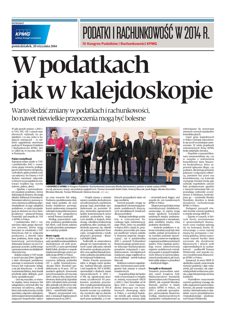 PODATKI I RACHUNKOWOŚĆ W 2014 R. PATRONAT poniedziałek, 20 stycznia 2014 IV Kongres Podatków i Rachunkowości KPMG W podatkach jak w kalejdoskopie Warto śledzić zmiany w podatkach i rachunkowości, bo nawet niewielkie przeoczenia mogą być bolesne W jaki sposób zmiany z 2013 r. w VAT, PIT, CIT i cenach transferowych wpłynęły na podatników i co nas czeka w kolejnych miesiącach — to niektóre zagadnienia omówione podczas IV Kongresu Podatków i Rachunkowości KPMG, który odbył się 14 stycznia 2014 r. w Warszawie. Pakiet modyfikacji Najwięcej zmian zaszło w VAT. 1 października 2013 r. rozszerzono grupę towarów podlegających odwrotnemu obciążeniu, czyli takich, gdzie podatek rozlicza nabywca. Do Ustawy o VAT dodano natomiast załącznik, w którym wyszczególniono tzw. towary wrażliwe (np. wyroby stalowe, paliwa, złoto). — Zgodnie z wprowadzonymi zasadami podatnicy, którzy dokonują ich dostawy, nie mogą składać deklaracji kwartalnych. Natomiast nabywcy ponoszą razem z dostawcą solidarną odpowiedzialność za jego zaległości podatkowe, w części przypadającej na dostawę na rzecz danego nabywcy — zaznaczył Tomasz Grunwald, szef zespołu ds. VAT w KPMG w Polsce. 1 października 2013 r. rozszerzono także grupę darczyńców żywności, którzy mogą korzystać ze zwolnienia z VAT. Dotychczas byli to wyłącznie producenci, a obecnie także inne podmioty, które mają dokumentację potwierdzającą dokonanie dostawy na rzecz organizacji pożytku publicznego z przeznaczeniem na działalność charytatywną. Kolejne zmiany w VAT weszły w życie 1 stycznia 2014 r. Zgodnie z nimi obowiązek podatkowy powstaje w momencie wydania towaru lub wykonania usługi, a nie jak dotychczas — w chwili wystawienia faktury. Inny kształt przybrała także definicja „podstawy opodatkowania”. — Jest nią wszystko, co stanowi zapłatę, którą dostawca lub usługodawca otrzymał albo ma otrzymać od nabywcy, usługobiorcy lub osoby trzeciej z tytułu sprzedaży, włącznie z dotacjami, subwencjami i innymi dopłatami mającymi bezpośredni wpływ EKSPERCI Z KPMG: IV Kongres Podatków i Rachunkowości otworzyła Monika Bartoszewicz, partner w dziale audytu KPMG (na zdj. pierwsza z lewej), zaś prelekcje wygłosili m.in. Tomasz Grunwald, Rafał Ciołek, Andrzej Marczak, Jacek Bajger, Monika Warmbier, Mirosław Matusik, Tomasz Wiśniewski i Bożena Graczyk. [FOT. ARC] na cenę towarów lub usług. Podstawa opodatkowania obejmuje także podatki, cła oraz koszty dodatkowe: prowizje, koszty opakowania, transportu i ubezpieczenia pobierane przez dostawcę lub usługodawcę — mówił Tomasz Grunwald. Według poprzednich zapisów, podstawą opodatkowania był obrót, czyli kwota należna z tytułu sprzedaży pomniejszona o należny podatek. Nowe reguły W 2014 r. zmieniły się także zasady opodatkowania podatkiem dochodowym od osób prawnych (CIT), o czym opowiedział Rafał Ciołek, dyrektor w zespole międzynarodowego prawa podatkowego KPMG w Polsce. — Ustawa z 8 listopada 2013 r. rozszerza definicję podatnika CIT o spółki komandytowo-akcyjne (SKA). Wysokość opodatkowania to 19 proc. CIT na zasadach ogólnych. Stosowanie nowych przepisów od 1 stycznia 2014 r. dotyczy SKA, których rok obrotowy skończył się 31 grudnia 2013 r. lub takich, które powstały albo zmieniły rok obrotowy między 12 grudnia 2013 r. a 1 stycznia 2014 r. — mówił Rafał Ciołek. Ekspert przypomniał również o zmianach legislacyjnych zaplanowanych na 2015 r. — Projekt ustawy o zmianie ustawy o podatku dochodowym od osób prawnych, nad którym pracuje rząd, przewiduje opodatkowanie na poziomie 19 proc. dochodów zagranicznych spółek kontrolowanych przez polskich podatników, mających siedziby w krajach, które stosują szkodliwą konkurencję podatkową albo uzyskują tzw. dochody pasywne, np. odsetki od pożyczek, należności licencyjne, wynagrodzenia z tytułu poręczeń i gwarancji — tłumaczył Rafał Ciołek. Podkreślił, że ustawodawca planuje też wprowadzenie nowych zasad zaliczania odsetek do kosztów uzyskania przychodów oraz ogólnej klauzuli przeciwko unikaniu opodatkowania do Ordynacji Podatkowej. Ważne kwestie poruszono także w drugiej części spotkania. Andrzej Marczak, partner i szef zespołu ds. PIT w KPMG, opowiedział o skutkach zmian wprowadzonych w 2013 r. w PIT, np. ograniczeniu stosowania ryczałtowych 50 proc. kosztów uzyskania przychodów z tytułu przeniesienia praw autorskich do kwoty 42 764 zł kosztów rocznie czy uzależnieniu wysokości ulgi na dziecko od liczby dzieci wychowywanych przez podatnika, a w nie- których przypadkach także od jego zarobków. Zwrócił ponadto uwagę na niezgodność z konstytucją przepisów podatkowych dotyczących nieodpłatnych świadczeń dla pracowników. — Brakuje jednolitego podejścia w orzecznictwie Naczelnego Sądu Administracyjnego (NSA), który na przykład w marcu 2013 r. uznał, że „przychodem pracownika jest sama już możliwość wzięcia udziału w firmowej imprezie integracyjnej”, zaś w październiku 2013 r. postawił Trybunałowi Konstytucyjnego pytanie prawne dotyczące konstytucyjności przepisów związanych z opodatkowaniem nieodpłatnych świadczeń, mając wątpliwość co do ich definicji — mówił Andrzej Marczak. Kolejnym ważnym zagadnieniem omówionym przez prelegentów były zmiany w cenach transferowych. — Za granicą dzieje się bardzo wiele w tym temacie w związku ze zmianą wytycznych OECD z 2010 r. Choć formalnie od 18 lipca 2013 r. nowe rozporządzenia dotyczące cen transferowych obowiązują także w Polsce, o rewolucji będziemy mówili, gdy zmiany będą wprowadzane na szerszą skalę — stwierdził Jacek Bajger, szef zespołu ds. cen transferowych KPMG w Polsce. Ekspert poruszył także temat restrukturyzacji działalności, zaznaczając, że organy mogą badać zgodność warunków ustalonych między podmiotami powiązanymi z warunkami, jakie 