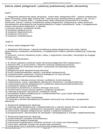 Okręgowa Izba Pielęgniarek i Położnych w Koszalinie Zakres zadań pielęgniarki i położnej podstawowej opieki zdrowotnej Część I 1. Pielęgniarka podstawowej opieki zdrowotnej, "zwana dalej "pielęgniarką POZ", i położna podstawowej opieki zdrowotnej, zwana dalej "położną POZ", wybrana przez świadczeniobiorcę zgodnie z art. 28 ust 1 ustawy z dnia 27 sierpnia 2004 r. o świadczeniach opieki zdrowotnej finansowanych ze środków publicznych, planuje i realizuje kompleksową opiekę pielęgniarską i pielęgnacyjną, opiekę położniczoneonatologiczno-ginekologiczną nad świadczeniobiorcą w miejscu zamieszkania i nauki, z uwzględnieniem miejsca wykonywania świadczenia, w zakresie: 1) promocji zdrowia i profilaktyki chorób; 2) świadczeń pielęgnacyjnych; 3) świadczeń diagnostycznych; 4) świadczeń leczniczych; 5) świadczeń rehabilitacyjnych. Część II A. Zakres zadań pielęgniarki POZ 1. Pielęgniarka POZ planuje i realizuje kompleksową opiekę pielęgniarską nad osobą, rodziną, społecznością w środowisku zamieszkania, z uwzględnieniem miejsca udzielenia świadczenia, obejmując opieką: 1) zdrowych i chorych niezależnie od płci i wieku, z wyłączeniem noworodka i niemowlęcia do drugiego miesiąca życia; 2) osoby niepełnosprawne. 2. W ramach udzielania świadczeń opieki zdrowotnej pielęgniarka POZ współpracuje z: 1) lekarzem POZ i w porozumieniu z lekarzem wykonuje świadczenia lecznicze; 2) pielęgniarką POZ środowiska nauczania i wychowania lub higienistką szkolną; 3) położną POZ; 4) pielęgniarką opieki długoterminowej domowej; 5) innymi świadczeniodawcami zgodnie z potrzebami podopiecznych; 6) przedstawicielami organizacji i instytucji działających na rzecz zdrowia; 7) rodziną (opiekunami) świadczeniobiorcy. 3. Świadczenia w zakresie promocji zdrowia i profilaktyki chorób obejmują: 1) rozpoznawanie, ocenę i zapobieganie zagrożeniom zdrowotnym u świadczeniobiorców; 2) rozpoznawanie potrzeb pielęgnacyjnych i problemów zdrowotnychświadczeniobiorców; 3) prowadzenie edukacji zdrowotnej; 4) prowadzenie poradnictwa w zakresie zdrowego stylu życia; 5) monitorowanie rozwoju dziecka zgodnie z odrębnymi przepisami; 6) realizację programów zdrowotnych i profilaktyki chorób; 7) prowadzenie działań profilaktycznych u świadczeniobiorców z grup ryzyka zdrowotnego; 8) organizację grup wsparcia; 9) profilaktykę chorób wieku rozwojowego; 10) edukację w zakresie obowiązkowych szczepień ochronnych oraz informacje o szczepieniach zalecanych. 4. Świadczenia pielęgnacyjne obejmują: 1) realizację opieki pielęgnacyjnej u świadczeniobiorców w różnych stanach zdrowia i choroby zgodnie z aktualną wiedzą medyczną i współczesnymi standardami opieki pielęgniarskiej; 2) wykonywanie zabiegów pielęgnacyjnych zgodnie z odrębnymi przepisami; 3) przygotowywanie i aktywizowanie do samoopieki i samopielęgnacji w chorobie i niepełnosprawności. 5. Świadczenia diagnostyczne obejmują: 1) przeprowadzanie wywiadów środowiskowych; 2) wykonywanie badania fizykalnego; 3) wykonywanie podstawowych pomiarów życiowych i ich ocenę oraz interpretację; 4) ocenę stanu ogólnego chorego oraz procesu jego zdrowienia; 5) ocenę jakości życia i wydolności psychofizycznej świadczeniobiorcy; http://oipip-koszalin.org/new Kreator PDF Utworzono 4 March, 2017, 07:15 Okręgowa Izba Pielęgniarek i Położnych w Koszalinie 6) wykrywanie odchyleń od normy rozwojowej; 7) wykonywanie testów diagnostycznych poza laboratorium w oparciu o zestawy i aparaturę przeznaczoną do wykonywania oznaczeń w miejscu zamieszkania świadczeniobiorcy; 8) ocenę i monitorowanie bólu; 9) ocenę wydolności pielęgnacyjno-opiekuńczej rodziny; 10) pobieranie materiału do badań diagnostycznych zgodnie z odrębnymi przepisami. 6. Świadczenia lecznicze, zgodnie z odrębnymi przepisami, obejmują: 1) udzielanie pierwszej pomocy w stanach zagrożenia życia i w nagłych zachorowaniach, w tym prowadzenie resuscytacji krążeniowo-oddechowej; 2) podawanie leków różnymi drogami i technikami zleconymi przez lekarza oraz zgodnie z odrębnymi przepisami, w tym wykonywanie iniekcji dożylnych, podskórnych, śródskórnych oraz wykonywanie wlewów dożylnych; 3) zakładanie opatrunków na rany, odleżyny, oparzenia; 4) cewnikowanie pęcherza u kobiet; 5) płukanie pęcherza; 6) wykonywanie wlewów / wlewek doodbytniczych; 7) wykonywanie zabiegów pielęgnacyjno-leczniczych w stomiach, przetokach i ranach trudno gojących się w porozumieniu z lekarzem; 8) zdejmowanie szwów; 9) wykonywanie inhalacji; 10) wykonywanie zabiegów z zastosowaniem ciepła i zimna; 11) stawianie baniek; 12) ustalanie diety w żywieniu przewlekle chorych; 13) dobór technik karmienia w zależności od stanu chorego; 14) doraźną modyfikację dawki leków przeciwbólowych w uzgodnieniu z lekarzem i zgodnie z wykazem leków do podawania, których uprawniona jest pielęgniarka. 7. Świadczenia rehabilitacyjne obejmują: 1) rehabilitację przyłóżkową w celu zapobiegania powikłaniom wynikającym z procesu chorobowego i długotrwałego unieruchomienia; 2) usprawnianie ruchowe; 3) drenaż ułożeniowy, prowadzenie gimnastyki oddechowej; 4) ćwiczenia ogólnousprawniające; 5) ułożenie i przemieszczanie chorego w łóżku. 8. Pielęgniarka POZ środowiska nauczania i wychowania planuje i realizuje opiekę pielęgnacyjną nad świadczeniobiorcami na terenie szkoły lub w jednostce, o której mowa w art. 2 pkt 5 ustawy z dnia 7 września 1991 r. o systemie oświaty (Dz. U. z 2004 r. Nr 256, poz. 2572, z późn. zm.3)), zgodnie z odrębnymi przepisami. B. Zakres zadań położnej POZ 1. Położna POZ realizuje kompleksową pielęgnacyjną opiekę położniczo-neonatologiczno - ginekologiczną obejmującą: 1) edukację w zakresie planowania rodziny; 2) opiekę w okresie ciąży, porodu i połogu; 3) opiekę nad kobietą, noworodkiem i niemowlęciem do ukończenia drugiego miesiąca