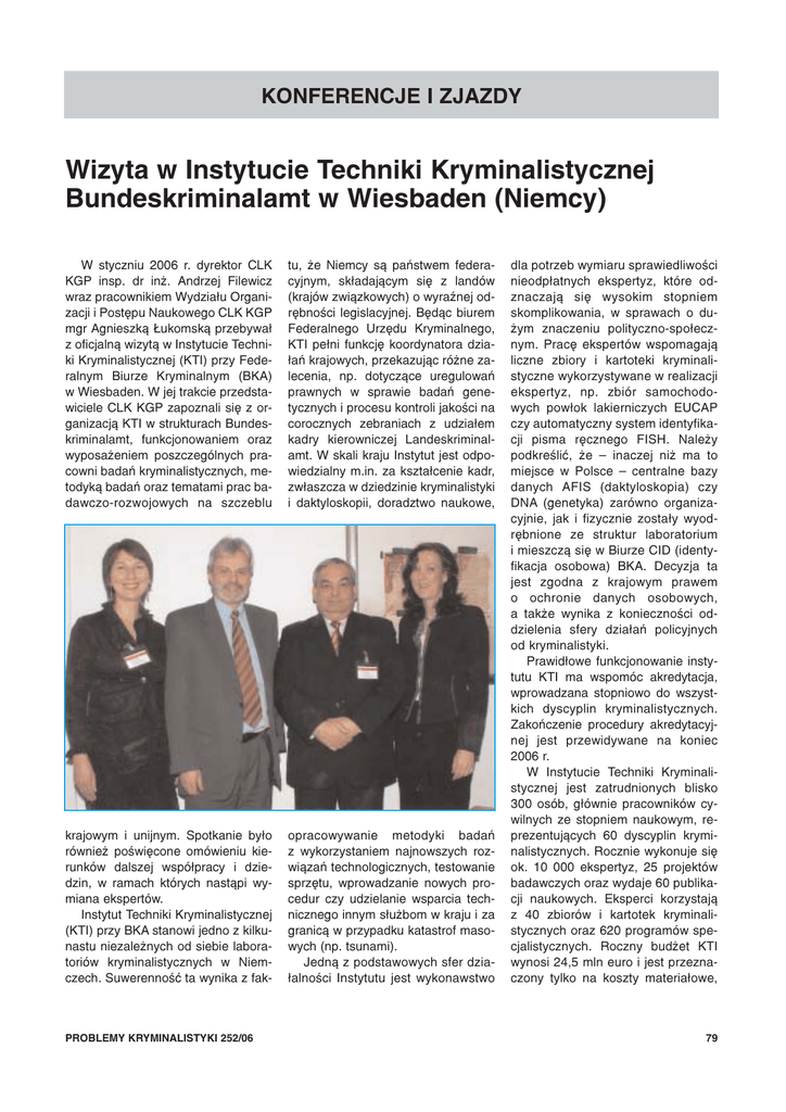 KONFERENCJE I ZJAZDY Wizyta w Instytucie Techniki Kryminalistycznej Bundeskriminalamt w Wiesbaden (Niemcy) W styczniu 2006 r. dyrektor CLK KGP insp. dr in¿. Andrzej Filewicz wraz pracownikiem Wydzia³u Organizacji i Postêpu Naukowego CLK KGP mgr Agnieszk¹ £ukomsk¹ przebywa³ z oficjaln¹ wizyt¹ w Instytucie Techniki Kryminalistycznej (KTI) przy Federalnym Biurze Kryminalnym (BKA) w Wiesbaden. W jej trakcie przedstawiciele CLK KGP zapoznali siê z organizacj¹ KTI w strukturach Bundeskriminalamt, funkcjonowaniem oraz wyposa¿eniem poszczególnych pracowni badañ kryminalistycznych, metodyk¹ badañ oraz tematami prac badawczo-rozwojowych na szczeblu tu, ¿e Niemcy s¹ pañstwem federacyjnym, sk³adaj¹cym siê z landów (krajów zwi¹zkowych) o wyraŸnej odrêbnoœci legislacyjnej. Bêd¹c biurem Federalnego Urzêdu Kryminalnego, KTI pe³ni funkcjê koordynatora dzia³añ krajowych, przekazuj¹c ró¿ne zalecenia, np. dotycz¹ce uregulowañ prawnych w sprawie badañ genetycznych i procesu kontroli jakoœci na corocznych zebraniach z udzia³em kadry kierowniczej Landeskriminalamt. W skali kraju Instytut jest odpowiedzialny m.in. za kszta³cenie kadr, zw³aszcza w dziedzinie kryminalistyki i daktyloskopii, doradztwo naukowe, krajowym i unijnym. Spotkanie by³o równie¿ poœwiêcone omówieniu kierunków dalszej wspó³pracy i dziedzin, w ramach których nast¹pi wymiana ekspertów. Instytut Techniki Kryminalistycznej (KTI) przy BKA stanowi jedno z kilkunastu niezale¿nych od siebie laboratoriów kryminalistycznych w Niemczech. Suwerennoœæ ta wynika z fak- opracowywanie metodyki badañ z wykorzystaniem najnowszych rozwi¹zañ technologicznych, testowanie sprzêtu, wprowadzanie nowych procedur czy udzielanie wsparcia technicznego innym s³u¿bom w kraju i za granic¹ w przypadku katastrof masowych (np. tsunami). Jedn¹ z podstawowych sfer dzia³alnoœci Instytutu jest wykonawstwo PROBLEMY KRYMINALISTYKI 252/06 dla potrzeb wymiaru sprawiedliwoœci nieodp³atnych ekspertyz, które odznaczaj¹ siê wysokim stopniem skomplikowania, w sprawach o du¿ym znaczeniu polityczno-spo³ecznym. Pracê ekspertów wspomagaj¹ liczne zbiory i kartoteki kryminalistyczne wykorzystywane w realizacji ekspertyz, np. zbiór samochodowych pow³ok lakierniczych EUCAP czy automatyczny system identyfikacji pisma rêcznego FISH. Nale¿y podkreœliæ, ¿e – inaczej ni¿ ma to miejsce w Polsce – centralne bazy danych AFIS (daktyloskopia) czy DNA (genetyka) zarówno organizacyjnie, jak i fizycznie zosta³y wyodrêbnione ze struktur laboratorium i mieszcz¹ siê w Biurze CID (identyfikacja osobowa) BKA. Decyzja ta jest zgodna z krajowym prawem o ochronie danych osobowych, a tak¿e wynika z koniecznoœci oddzielenia sfery dzia³añ policyjnych od kryminalistyki. Prawid³owe funkcjonowanie instytutu KTI ma wspomóc akredytacja, wprowadzana stopniowo do wszystkich dyscyplin kryminalistycznych. Zakoñczenie procedury akredytacyjnej jest przewidywane na koniec 2006 r. W Instytucie Techniki Kryminalistycznej jest zatrudnionych blisko 300 osób, g³ównie pracowników cywilnych ze stopniem naukowym, reprezentuj¹cych 60 dyscyplin kryminalistycznych. Rocznie wykonuje siê ok. 10 000 ekspertyz, 25 projektów badawczych oraz wydaje 60 publikacji naukowych. Eksperci korzystaj¹ z 40 zbiorów i kartotek kryminalistycznych oraz 620 programów specjalistycznych. Roczny bud¿et KTI wynosi 24,5 mln euro i jest przeznaczony tylko na koszty materia³owe, 79 KONFERENCJE I ZJAZDY sprzêtowe i analityczne, z wy³¹czeniem wydatków osobowych. W trakcie wizyty delegacja polska zapozna³a siê z nastêpuj¹cymi pracowniami: badañ szkie³ i lakierów, centraln¹ pracowni¹ chemii nieorganicznej oraz skaningowej mikroskopii elektronowej, badañ DNA, badañ pisma rêcznego, badañ noœników elektronicznych i cyfrowych, badañ pozosta³oœci powystrza³owych (GSR), oraz zespo³em ds. kontroli jakoœci. Eksperci niemieccy podkreœlili znaczenie sta³ego przekazywania próbek pow³ok lakierniczych do bazy danych lakierów samochodowych EUCAP przez kraje, które podpisa³y list intencyjny (m.in. Polskê). W dziedzinie badania szkie³ zaprezentowano now¹ metodê badawcz¹ do iloœciowego oznaczania pierwiastków w próbkach szkie³ typu float – LA-ICP-MS. Pioniersk¹ publikacjê naukow¹ na ten temat (projekt badawczy NITE Crime) przekazano CLK KGP. Obie strony – polska i niemiecka – omówi³y kierunki rozwoju badañ genetycznych w najbli¿szej przysz³oœci, koniecznoœæ opracowania metodyki 80 badañ œladów bardzo zdegradowych, po¿ytki p³yn¹ce ze wspó³pracy na szczeblu miêdzynarodowym w grupach EDNAP, ENFSI i SWAGDAM. Na proœbê strony polskiej eksperci BKA dok³adnie omówili procedurê identyfikacji pisma rêcznego za pomoc¹ zautomatyzowanego systemu FISH. System dzia³a na zasadzie podobnej do systemu AFIS: próbki pisma rêcznego w postaci dokumentu s¹ skanowane do komputera, a nastêpnie poddawane analizie przez operatora (zaznaczenie 7 cech charakterystycznych, dokonanie pomiarów znaków, k¹ta nachylenia itp.). Po dokonaniu tych czynnoœci system automatycznie dokonuje przeszukania zbiorów i wytypowania tzw. trafienia, czyli wzoru pisma rêcznego o najbardziej zbli¿onym algorytmie. Pozyskanie tego systemu i stworzenie polskiej bazy danych znacznie usprawni³oby pracê polskich ekspertów, zw³aszcza podczas identyfikacji autorów anonimów, listów z pogró¿kami, notatek z ostrze¿eniami o planowanych zamachach terrorystycznych. Podsumowuj¹c wizytê, skoncentrowano siê na tematyce wspólnych przedsiêwziêæ, np. Twinningu. Strony potwierdzi³y zainteresowanie dalszym rozwojem wszechstronnej wspó³pracy, zapewniaj¹c o wzajemnym wsparciu. Ustalono, ¿e wzajemne wizyty ekspertów s¹ konieczne nie tylko z uwagi na wymianê doœwiadczeñ i poznanie nowych metod, ale równie¿ na zmianê podejœcia do wykonywanych ekspertyz i podjêcie wspólnych wysi³ków zmierzaj¹cych do zapewnienia wiêkszego bezpiecze