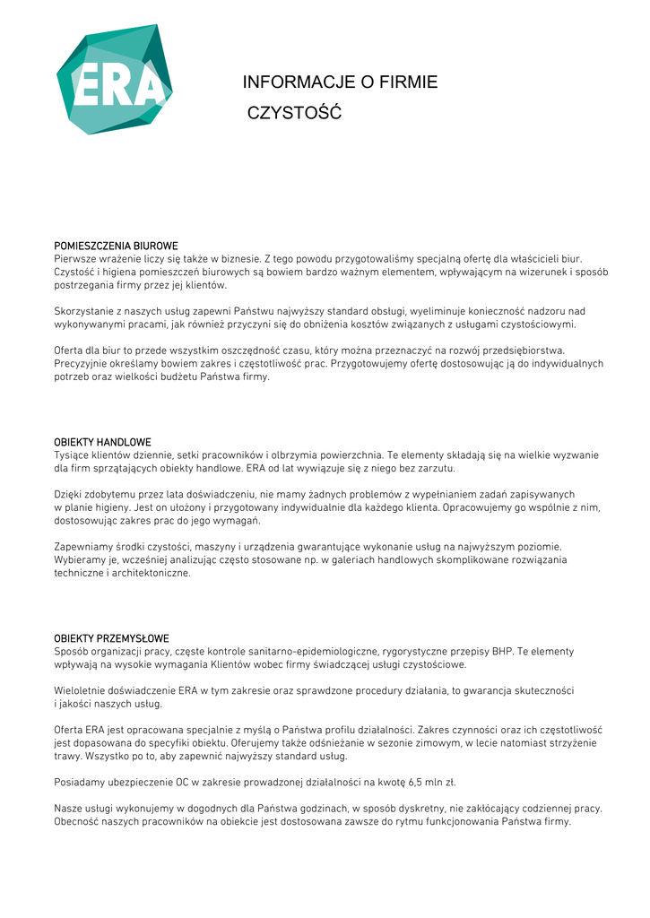 INFORMACJE O FIRMIE CZYSTOŚĆ POMIESZCZENIA BIUROWE Pierwsze wrażenie liczy się także w biznesie. Z tego powodu przygotowaliśmy specjalną ofertę dla właścicieli biur. Czystość i higiena pomieszczeń biurowych są bowiem bardzo ważnym elementem, wpływającym na wizerunek i sposób postrzegania firmy przez jej klientów. Skorzystanie z naszych usług zapewni Państwu najwyższy standard obsługi, wyeliminuje konieczność nadzoru nad wykonywanymi pracami, jak również przyczyni się do obniżenia kosztów związanych z usługami czystościowymi. Oferta dla biur to przede wszystkim oszczędność czasu, który można przeznaczyć na rozwój przedsiębiorstwa. Precyzyjnie określamy bowiem zakres i częstotliwość prac. Przygotowujemy ofertę dostosowując ją do indywidualnych potrzeb oraz wielkości budżetu Państwa firmy. OBIEKTY HANDLOWE Tysiące klientów dziennie, setki pracowników i olbrzymia powierzchnia. Te elementy składają się na wielkie wyzwanie dla firm sprzątających obiekty handlowe. ERA od lat wywiązuje się z niego bez zarzutu. Dzięki zdobytemu przez lata doświadczeniu, nie mamy żadnych problemów z wypełnianiem zadań zapisywanych w planie higieny. Jest on ułożony i przygotowany indywidualnie dla każdego klienta. Opracowujemy go wspólnie z nim, dostosowując zakres prac do jego wymagań. Zapewniamy środki czystości, maszyny i urządzenia gwarantujące wykonanie usług na najwyższym poziomie. Wybieramy je, wcześniej analizując często stosowane np. w galeriach handlowych skomplikowane rozwiązania techniczne i architektoniczne. OBIEKTY PRZEMYSŁOWE Sposób organizacji pracy, częste kontrole sanitarno-epidemiologiczne, rygorystyczne przepisy BHP. Te elementy wpływają na wysokie wymagania Klientów wobec firmy świadczącej usługi czystościowe. Wieloletnie doświadczenie ERA w tym zakresie oraz sprawdzone procedury działania, to gwarancja skuteczności i jakości naszych usług. Oferta ERA jest opracowana specjalnie z myślą o Państwa profilu działalności. Zakres czynności oraz ich częstotliwość jest dopasowana do specyfiki obiektu. Oferujemy także odśnieżanie w sezonie zimowym, w lecie natomiast strzyżenie trawy. Wszystko po to, aby zapewnić najwyższy standard usług. Posiadamy ubezpieczenie OC w zakresie prowadzonej działalności na kwotę 6,5 mln zł. Nasze usługi wykonujemy w dogodnych dla Państwa godzinach, w sposób dyskretny, nie zakłócający codziennej pracy. Obecność naszych pracowników na obiekcie jest dostosowana zawsze do rytmu funkcjonowania Państwa firmy. PLACÓWKI SŁUŻBY ZDROWIA Utrzymanie czystości w placówkach służby zdrowia to indywidualny proces. Nie może być porównywany do sprzątania np. biur czy obiektów przemysłowych. ERA wykonuje takie usługi od lat. By świadczyć usługi dla placówek służby zdrowia firma i jej pracownicy muszą spełniać szereg wymogów określonych w przepisach prawa. Kwestią kluczową jest specjalistyczna wiedza i odbycie szeregu szkoleń przez personel sprzątający. Odpowiednie kwalifikacje do wykonywania tych usług mają decydujący wpływ na jakość, co przekłada się na zdrowie pacjentów i pracowników obiektu. Dla każdej placówki opracowujemy indywidualną strategię higieny. Staranie dobrane środki do sprzątania i dezynfekcji zapobiegają rozprzestrzenianiu się drobnoustrojów chorobotwórczych w środowisku szpitalnym. Poprzez częste kontrole naszych technologów gwarantujemy zapewnienie należytej czystości, a także konserwacji obiektów. OSIEDLA MIESZKALNE Osiedle z alejkami spacerowymi, przestronnymi klatkami schodowymi oraz placami zabaw. To pragnienie wielu. Na nic jednak starania inwestorów czy zarządców nieruchomości, jeśli w tych miejscach nie będzie utrzymywana należyta czystość. Ją gwarantuje ERA. Komfort mieszkańców to nie tylko bezpieczeństwo. To również porządek i czystość ogólnodostępnych pomieszczeń oraz otaczających mieszkania terenów. Te jednak, w zależności od pomysłów architektów oraz wykorzystanych materiałów, znacząco się od siebie różnią. Dlatego ERA każde zlecenie traktuje indywidualnie, wprowadzając dostosowane do danego osiedla plany czystościowe. Starannie dobierane są środki czystości, aby były skuteczne, ale również bezpieczne dla otoczenia. Oferujemy także odśnieżanie w sezonie zimowym, w lecie natomiast strzyżenie trawy. Staramy się, aby czystość i porządek na obsługiwanych przez nas osiedlach, zachęcały mieszkańców do miłych spacerów. KOMPETENCJE Bezpieczna obsługa maszyn, stosowanie środków chemicznych zgodnie z HACCP, obszerna wiedza z zakresu BHP. To tylko kilka atutów naszych pracowników w sektorze czystościowym. Stosujemy sprawdzone systemy organizacji, które zapewniają efektywną pracę. Dzięki częstym kontrolom wewnętrznym, wszystkie założenia są wykonywane z zgodnie z ustalonym wcześniej planem higieny. Nasi pracownicy posiadają jednolite i oznakowane ubrania robocze, niezbędne środki ochrony osobistej, identyfikator oraz dokumentację służbową. Mają do dyspozycji m.in.: wózki dwuwiaderkowe, wózki serwisowe, odkurzacze na sucho, odkurzacze na sucho-mokro, szorowarki, polerki, maszyny szorująco-zbierające, maszyny szorująco-zbierające z operatorem siedzącym. Stosowane przez ERA środki czystości to linia profesjonalnych produktów, obejmująca środki do czyszczenia i konserwacji mebli, mycia i konserwacji podłóg, prania wykładzin dywanowych, mycia i dezynfekcji pomieszczeń sanitarnych, mycia przeszkleń, środki do czyszczenia i konserwacji powierzchni chromowanych, a także do zabezpieczania posadzek powłoką polimerową i wiele innych, mających zapewnić najwyższy standard usług. REFERENCJE Indywidualnie opracowane plany higieny, dostosowanie pracy do konkretnych potrzeb klienta oraz regularne kontrole technologów. To dzięki tym zaletom od 20 lat utrzymujemy czystość w setkach obiektów o róż