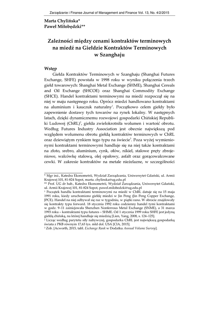 Zarządzanie i Finanse Journal of Management and Finance Vol. 13, No. 4/2/2015 Marta Chylińska* Paweł Miłobędzki** Zależności między cenami kontraktów terminowych na miedź na Giełdzie Kontraktów Terminowych w Szanghaju Wstęp Giełda Kontraktów Terminowych w Szanghaju (Shanghai Futures Exchange, SHFE) powstała w 1998 roku w wyniku połączenia trzech giełd towarowych: Shanghai Metal Exchange (SHME), Shanghai Cereals and Oil Exchange (SHCOE) oraz Shanghai Commodity Exchange (SHCE). Handel kontraktami terminowymi na miedź rozpoczął się na niej w maju następnego roku. Oprócz miedzi handlowano kontraktami na aluminium i kauczuk naturalny1. Początkowo celem giełdy było zapewnienie dostawy tych towarów na rynek lokalny. W następnych latach, dzięki dynamicznemu rozwojowi gospodarki Chińskiej Republiki Ludowej (ChRL)2, giełda zwielokrotniła wolumen i wartość obrotu. Według Futures Industry Association jest obecnie największą pod względem wolumenu obrotu giełdą kontraktów terminowych w ChRL oraz dziewiątym rynkiem tego typu na świecie3. Poza wyżej wymienionymi kontraktami terminowymi handluje się na niej także kontraktami na złoto, srebro, aluminium, cynk, ołów, nikiel, stalowe pręty zbrojeniowe, walcówkę stalową, olej opałowy, asfalt oraz gorącowalcowane cewki. W zakresie kontraktów na metale nieżelazne, w szczególności ___________________ * Mgr inż., Katedra Ekonometrii, Wydział Zarządzania, Uniwersytet Gdański, ul. Armii Krajowej 101, 81-824 Sopot, marta. [email protected] ** Prof. UG dr hab., Katedra Ekonometrii, Wydział Zarządzania, Uniwersytet Gdański, ul. Armii Krajowej 101, 81-824 Sopot, [email protected] 1 Początek handlu kontraktami terminowymi na miedź w ChRL datuje się na 15 maja 1991 roku, kiedy uruchomiono giełdę miedzi w Jin Peng (Jin Peng Copper Exchange, JPCE). Handel na niej odbywał się raz w tygodniu, w piątki rano. W obrocie znajdowały się kontrakty typu forward. 18 stycznia 1992 roku codzienny handel tymi kontraktami w godz. 9–11 zainicjowała Shenzhen Nonferrous Metal Exchange (SNME), a 31 marca 1993 roku – kontraktami typu futures – SHME. Od 1 stycznia 1999 roku SHFE jest jedyną giełdą chińską, na której handluje się miedzią [Lien, Yang, 2008, s. 124–125]. 2 Licząc według parytetu siły nabywczej, gospodarka ChRL jest największą gospodarką świata z PKB równym 17,63 tys. mld dol. USA [CIA, 2015]. 3 Zob. [Acworth, 2015, tabl. Exchange Rank w Dodatku Annual Volume Survey]. 6 Marta Chylińska, Paweł Miłobędzki kontraktów na miedź, której ChRL jest największym importerem i konsumentem [Smakowski i inni, 2014, s. 615–654], konkuruje z Londyńską Giełdą Metali (London Metal Exchange, LME) i Commodity Exchange of New York (COMEX) o miano miejsca stanowienia ich cen światowych [Li, Zhang, 2009; Hua i inni, 2010; Mou, 2014; Figuerola-Ferretti i inni, 2014]. Zależności między cenami kontraktów terminowych na miedź na tych rynkach były w ostatnich latach przedmiotem intensywnych badań. Li, Zhang [2009], a także Hua i inni [2010] wykazali, że ich ceny na SHFE i LME znajdują się w relacji równowagi długookresowej i wzajemnie na siebie oddziaływają. Oddziaływanie LME na SHFE jest silniejsze niż oddziaływanie SHFE na LME. Fung i inni [2010] stwierdzili występowanie podobnych zależności pomiędzy SHFE i COMEX. Z kolei Rutledge i inni [2013] oraz Yin, Han [2013] dowiedli skointegrowania cen kontraktów na SHFE, LME i COMEX. Zidentyfikowali dwukierunkową przyczynowość w rozumieniu Grangera między tymi rynkami, jej nasilenie się po kryzysie 2008 roku, a także dwukierunkowe, asymetryczne rozlewanie się zmienności (volatility spillovers). Stwierdzili przy tym silniejsze oddziaływanie obu rynków rozwiniętych na rynek chiński niż rynku chińskiego na rynki rozwinięte. Wreszcie Mou [2014] pokazał, że LME jest ciągle wiodącym rynkiem jeśli chodzi o stanowienie cen miedzi. Stan wiedzy odnośnie do mechanizmu stanowienia cen kontraktów terminowych na miedź na SHFE jest mniej aktualny i dotyczy okresu sprzed kryzysu 2008 roku. I tak Lien, Yang [2008] wykazali skointegrowanie ceny natychmiastowej i ceny terminowej miedzi, asymetrię ich powrotu do relacji równowagi długookresowej, wzrost warunkowej zmienności stopy zwrotu natychmiastowej i stopy terminowej w wyniku powiększania się dodatniej bazy cenowej (spreadów cen pomiędzy kontraktami o różnej zapadalności), a także to, iż wraz ze wzrostem ujemnej bazy nasila się nie tylko zmienność na rynku terminowym, ale także powiązanie obu rynków odzwierciedlane za pomocą współczynnika korelacji warunkowej. Natomiast Liu i inni [2008] odkryli występowanie dwukierunkowej przyczynowości w rozumieniu Grangera w średniej i wariancji dla obu rynków. Stwierdzili także, iż oddziaływanie rynku terminowego na rynek kasowy jest w każdym z tych wymiarów silniejsze. Celem artykułu jest dostarczenie aktualnej wiedzy na temat mechanizmu stanowienia cen kontraktów terminowych na miedź na SHFE. Zależności między cenami kontraktów terminowych na miedź… 7 Stawiamy w nim pytanie o możliwość arbitrażu między rynkami kontraktów na miedź o różnej zapadalności i działanie prawa jednej ceny po 2006 roku. Stosowny model pomiarowy cen specyfikujemy w oparciu o model premii za ryzyko [Watkins, McAleer, 2006]. Z uwagi na to, że ceny na rynkach towarowych są niestacjonarne i charakteryzują się znaczną zmiennością, jest on złożeniem wielowymiarowego modelu korekty błędem (VECM) [Johansen, 1995] i wielowymiarowego modelu warunkowej zmienności VCC-MGARCH [Tse, Tsui, 2002]. Model ten pozwala na łączną analizę dynamiki cen kontraktów, ich zmienności oraz warunkowych korelacji między rynkami cząstkowymi. Szacujemy go na podstawie szeregów czasowych cen rozliczeniowych kontraktów o zapadalności od 1 do 6 miesięcy oraz kursu wymiany waluty krajowej (juan) na dolara USA o czę
