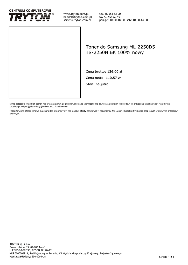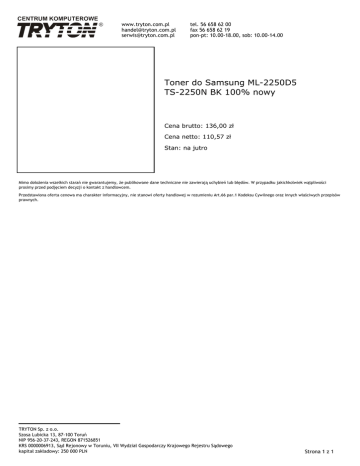 www.tryton.com.pl [email protected] [email protected] tel. 56 658 62 00 fax 56 658 62 19 pon-pt: 10.00-18.00, sob: 10.00-14.00 Toner do Samsung ML-2250D5 TS-2250N BK 100% nowy Cena brutto: 136,00 zł Cena netto: 110,57 zł Stan: na jutro Mimo dołożenia wszelkich starań nie gwarantujemy, że publikowane dane techniczne nie zawierają uchybień lub błędów. W przypadku jakichkolwiek wątpliwości prosimy przed podjęciem decyzji o kontakt z handlowcem. Przedstawiona oferta cenowa ma charakter informacyjny, nie stanowi oferty handlowej w rozumieniu Art.66 par.1 Kodeksu Cywilnego oraz innych właściwych przepisów prawnych. TRYTON Sp. z o.o. Szosa Lubicka 13, 87-100 Toruń NIP 956-20-37-243, REGON 871526851 KRS 0000006913, Sąd Rejonowy w Toruniu, VII Wydział Gospodarczy Krajowego Rejestru Sądowego kapitał zakładowy: 250 000 PLN Strona 1 z 1