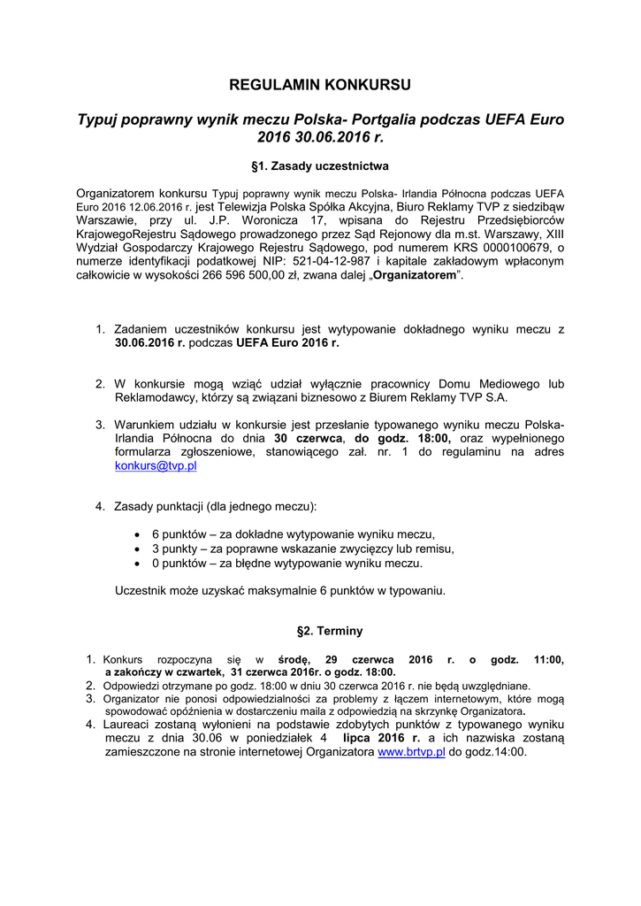 REGULAMIN KONKURSU Typuj poprawny wynik meczu Polska- Portgalia podczas UEFA Euro 2016 30.06.2016 r. §1. Zasady uczestnictwa Organizatorem konkursu Typuj poprawny wynik meczu Polska- Irlandia Północna podczas UEFA Euro 2016 12.06.2016 r. jest Telewizja Polska Spółka Akcyjna, Biuro Reklamy TVP z siedzibąw Warszawie, przy ul. J.P. Woronicza 17, wpisana do Rejestru Przedsiębiorców KrajowegoRejestru Sądowego prowadzonego przez Sąd Rejonowy dla m.st. Warszawy, XIII Wydział Gospodarczy Krajowego Rejestru Sądowego, pod numerem KRS 0000100679, o numerze identyfikacji podatkowej NIP: 521-04-12-987 i kapitale zakładowym wpłaconym całkowicie w wysokości 266 596 500,00 zł, zwana dalej „Organizatorem”. 1. Zadaniem uczestników konkursu jest wytypowanie dokładnego wyniku meczu z 30.06.2016 r. podczas UEFA Euro 2016 r. 2. W konkursie mogą wziąć udział wyłącznie pracownicy Domu Mediowego lub Reklamodawcy, którzy są związani biznesowo z Biurem Reklamy TVP S.A. 3. Warunkiem udziału w konkursie jest przesłanie typowanego wyniku meczu PolskaIrlandia Północna do dnia 30 czerwca, do godz. 18:00, oraz wypełnionego formularza zgłoszeniowe, stanowiącego zał. nr. 1 do regulaminu na adres [email protected] 4. Zasady punktacji (dla jednego meczu): 6 punktów – za dokładne wytypowanie wyniku meczu, 3 punkty – za poprawne wskazanie zwycięzcy lub remisu, 0 punktów – za błędne wytypowanie wyniku meczu. Uczestnik może uzyskać maksymalnie 6 punktów w typowaniu. §2. Terminy rozpoczyna się w środę, 29 czerwca 2016 r. o godz. 11:00, a zakończy w czwartek, 31 czerwca 2016r. o godz. 18:00. 2. Odpowiedzi otrzymane po godz. 18:00 w dniu 30 czerwca 2016 r. nie będą uwzględniane. 3. Organizator nie ponosi odpowiedzialności za problemy z łączem internetowym, które mogą spowodować opóźnienia w dostarczeniu maila z odpowiedzią na skrzynkę Organizatora. 1. Konkurs 4. Laureaci zostaną wyłonieni na podstawie zdobytych punktów z typowanego wyniku meczu z dnia 30.06 w poniedziałek 4 lipca 2016 r. a ich nazwiska zostaną zamieszczone na stronie internetowej Organizatora www.brtvp.pl do godz.14:00. §3. Nagrody 1. W konkursie do wygrania są: miejsce I – Ekspres Soda Stream Polska Source Metal miejsce II – Oficjalna Piłka UEFA Euro 2016 Adidas Fracas miejsce III – Oficjalna Piłka UEFA Euro 2016 Adidas Fracas 2. W przypadku gdy dwie lub więcej osób zdobędą taką samą, zwycięską liczbę punktów o zwycięstwie decyduje kolejność zgłoszenia ( godzina). 3. Przekazanie nagród przez Organizatora nastąpi w dniu 4 lipca 2016 r. Nagrody zostaną dostarczone do siedziby firmy, w której pracuje dany laureat. 4. Organizator oświadcza, że nie ma możliwości zamiany nagród na inne nagrody, jak również nie istnieje możliwość żądania przez zwycięzcę konkursu otrzymania równowartości pieniężnej nagrody. §4. Ochrona Danych Osobowych Uczestnicy konkursu akceptując regulamin wyrażają zgodę na przetwarzanie ich danych osobowych w celu realizacji i rozstrzygnięcia konkursu oraz wydania nagród zgodnie z Ustawą z dnia 29 sierpnia 1997 r. (Dz.U.2002.101.926) o ochronie danych osobowych. §.5 Postanowienia końcowe 1. Zgłoszenie do konkursu jest jednoznaczne z zapoznaniem się i akceptacją regulaminu. 2. Do interpretacji niniejszego regulaminu uprawniony jest jedynie Organizator. 3. Regulamin konkursu dostępny jest na stronie internetowej (www.brtvp.pl) oraz w siedzibie Telewizji Polskiej S.A. Biura Reklamy TVP S.A. w Warszawie przy ul. Woronicza 17, w Zespole ds. Analiz i Zarządzania Czasem Reklamowym. 4. Organizator zastrzega sobie prawo zmiany Regulaminu do dnia jego rozpoczęcia i zobowiązuje się do natychmiastowego opublikowania zmienionego Regulaminu w miejscach, w których uprzednio opublikował Regulamin konkursu. 5. Organizator zastrzega sobie prawo do zmiany terminu konkursu, jego przerwania lub zawieszenia z ważnych przyczyn, o czym powiadomi niezwłocznie na stronie www.brtvp.pl 6. Osoby biorące udział w konkursie wyrażają zgodę na publikację ich wizerunku w prasie i wydawnictwach lokalnych, ogólnopolskich a także na stronie internetowej www.brtvp.pl i innych mediach.