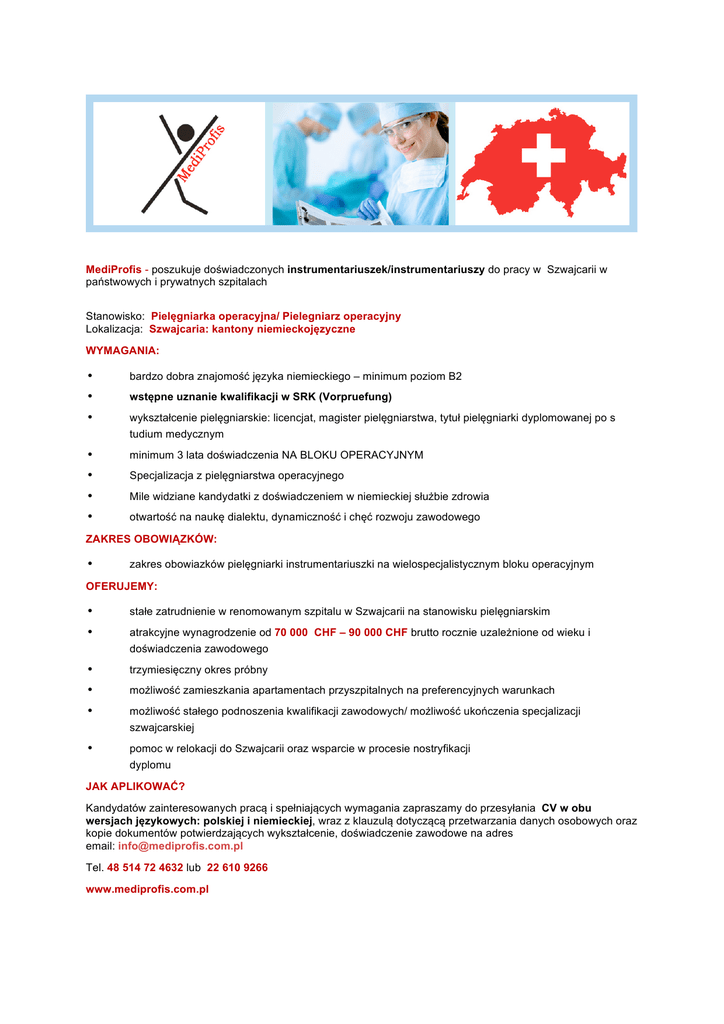MediProfis - poszukuje doświadczonych instrumentariuszek/instrumentariuszy do pracy w Szwajcarii w państwowych i prywatnych szpitalach Stanowisko: Pielęgniarka operacyjna/ Pielegniarz operacyjny Lokalizacja: Szwajcaria: kantony niemieckojęzyczne WYMAGANIA: • bardzo dobra znajomość języka niemieckiego – minimum poziom B2 • wstępne uznanie kwalifikacji w SRK (Vorpruefung) • wykształcenie pielęgniarskie: licencjat, magister pielęgniarstwa, tytuł pielęgniarki dyplomowanej po s tudium medycznym • minimum 3 lata doświadczenia NA BLOKU OPERACYJNYM • Specjalizacja z pielęgniarstwa operacyjnego • Mile widziane kandydatki z doświadczeniem w niemieckiej służbie zdrowia • otwartość na naukę dialektu, dynamiczność i chęć rozwoju zawodowego ZAKRES OBOWIĄZKÓW: • zakres obowiazków pielęgniarki instrumentariuszki na wielospecjalistycznym bloku operacyjnym OFERUJEMY: • stałe zatrudnienie w renomowanym szpitalu w Szwajcarii na stanowisku pielęgniarskim • atrakcyjne wynagrodzenie od 70 000 CHF – 90 000 CHF brutto rocznie uzależnione od wieku i doświadczenia zawodowego • trzymiesięczny okres próbny • możliwość zamieszkania apartamentach przyszpitalnych na preferencyjnych warunkach • możliwość stałego podnoszenia kwalifikacji zawodowych/ możliwość ukończenia specjalizacji szwajcarskiej • pomoc w relokacji do Szwajcarii oraz wsparcie w procesie nostryfikacji dyplomu JAK APLIKOWAĆ? Kandydatów zainteresowanych pracą i spełniających wymagania zapraszamy do przesyłania CV w obu wersjach językowych: polskiej i niemieckiej, wraz z klauzulą dotyczącą przetwarzania danych osobowych oraz kopie dokumentów potwierdzających wykształcenie, doświadczenie zawodowe na adres email: [email protected] Tel. 48 514 72 4632 lub 22 610 9266 www.mediprofis.com.pl