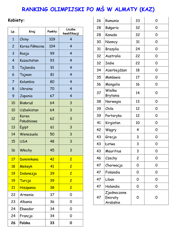 RANKING OLIMPIJSKI PO MŚ W ALMATY (KAZ) Kobiety: Lp. Kraj Punkty Liczba kwalifikacji 1 Chiny 109 4 2 Korea Północna 104 4 3 Rosja 99 4 4 Kazachstan 93 4 5 Tajlandia 91 4 6 Tajwan 81 4 7 Kolumbia 80 4 8 Ukraina 70 4 26 Rumunia 33 0 28 Bułgaria 32 0 28 Kanada 32 0 30 Niemcy 31 0 31 Brazylia 24 0 32 Australia 22 0 32 Indie 22 0 34 Azerbejdżan 18 0 35 Mołdawia 17 0 36 Mongolia 16 0 37 Wielka Brytania 14 0 9 Japonia 67 4 10 Białoruś 64 3 38 Norwegia 13 0 10 Uzbekistan 64 3 39 Chile 12 0 12 Korea Południowa 62 3 39 Portoryko 12 0 41 Kirgistan 10 0 13 Egipt 61 3 42 Węgry 4 0 14 Wenezuela 50 3 43 Grecja 3 0 15 USA 48 3 43 Łotwa 3 0 16 Włochy 45 3 43 Mauritius 3 0 17 Dominikana 42 2 46 Czechy 2 0 18 Meksyk 41 2 47 Chorwacja 0 0 19 Indonezja 39 2 47 Finlandia 0 0 19 Turcja 39 2 47 Liban 0 0 21 Hiszpania 38 2 47 Holandia 0 0 22 Armenia 37 0 47 0 0 23 Albania 36 0 Zjednoczone Emiraty Arabskie 24 Ekwador 34 0 24 Francja 34 0 26 Polska 33 0 Mężczyźni: Lp. Kraj Punkty Liczba kwalifikacji 30 Brazylia 28 0 31 Rumunia 26 0 32 Azerbejdżan 23 0 33 Estonia 22 0 33 Grecja 22 0 35 Kuba 21 0 36 Słowacja 17 0 37 Łotwa 16 0 38 Wenezuela 15 0 39 Austria 14 0 39 Włochy 14 0 39 Malezja 14 0 42 Turkmenistan 11 0 43 Kanada 10 0 43 Izrael 10 0 45 Turcja 8 0 46 Ekwador 7 0 46 Kirgistan 7 0 1 Chiny 143 6 2 Kazachstan 139 6 2 Korea Północna 139 6 4 Rosja 138 6 5 Białoruś 121 6 6 Iran 119 6 7 Egipt 118 5 8 Indonezja 105 5 9 Uzbekistan 102 5 10 Mołdawia 94 5 11 Bułgaria 85 5 12 Armenia 81 5 13 Kolumbia 69 4 13 Polska 69 4 15 Niemcy 63 4 16 Korea Południowa 62 4 48 Belgia 6 0 17 Tajlandia 60 4 49 Algieria 5 0 18 Hiszpania 53 4 49 Indie 5 0 19 Albania 52 3 51 Finlandia 1 0 20 Francja 50 3 52 Argentyna 0 0 21 Tajwan 47 3 52 Chorwacja 0 0 22 Wietnam 46 3 52 Cypr 0 0 23 Arabia Saudyjska 42 3 52 Czechy 0 0 24 Węgry 41 3 52 Dania 0 0 25 USA 41 0 52 0 0 26 Ukraina 40 0 Wielka Brytania 52 Chile 0 0 27 Litwa 38 0 52 Irlandia 0 0 28 Gruzja 33 0 52 Libia 0 0 28 Japonia 33 0 52 Mongolia 0 0 52 Uganda 0 0