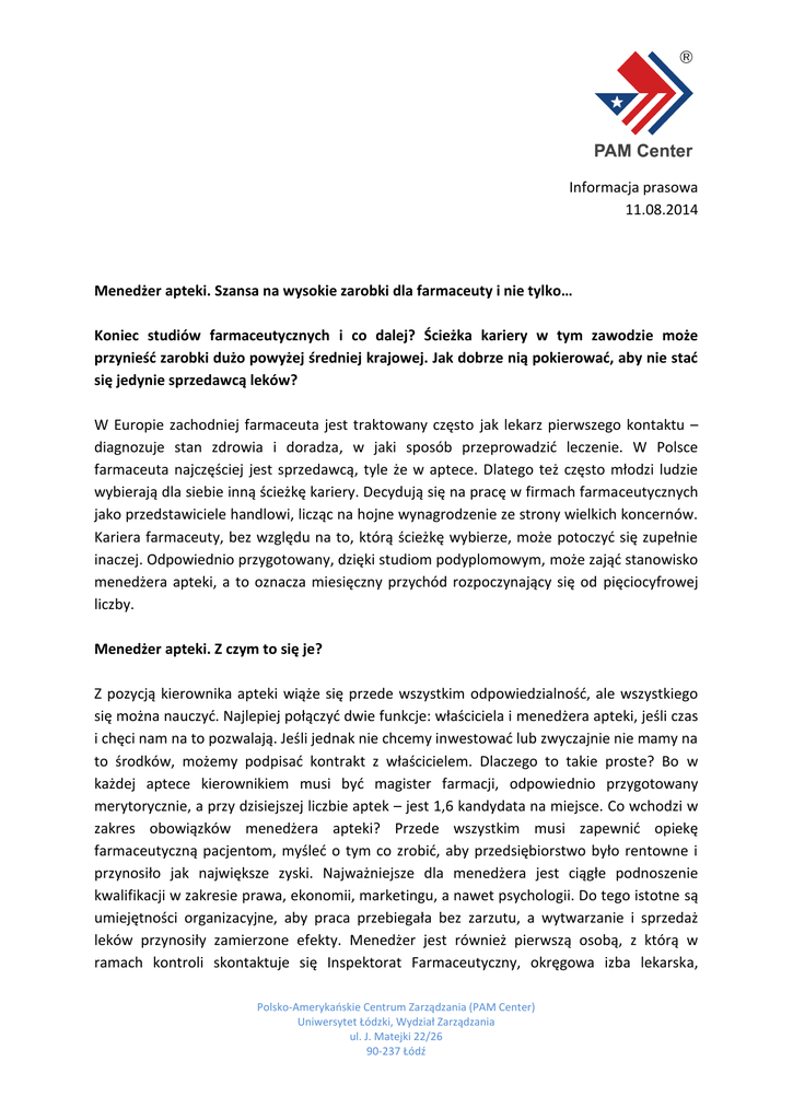 Informacja prasowa 11.08.2014 Menedżer apteki. Szansa na wysokie zarobki dla farmaceuty i nie tylko… Koniec studiów farmaceutycznych i co dalej? Ścieżka kariery w tym zawodzie może przynieść zarobki dużo powyżej średniej krajowej. Jak dobrze nią pokierować, aby nie stać się jedynie sprzedawcą leków? W Europie zachodniej farmaceuta jest traktowany często jak lekarz pierwszego kontaktu – diagnozuje stan zdrowia i doradza, w jaki sposób przeprowadzić leczenie. W Polsce farmaceuta najczęściej jest sprzedawcą, tyle że w aptece. Dlatego też często młodzi ludzie wybierają dla siebie inną ścieżkę kariery. Decydują się na pracę w firmach farmaceutycznych jako przedstawiciele handlowi, licząc na hojne wynagrodzenie ze strony wielkich koncernów. Kariera farmaceuty, bez względu na to, którą ścieżkę wybierze, może potoczyć się zupełnie inaczej. Odpowiednio przygotowany, dzięki studiom podyplomowym, może zająć stanowisko menedżera apteki, a to oznacza miesięczny przychód rozpoczynający się od pięciocyfrowej liczby. Menedżer apteki. Z czym to się je? Z pozycją kierownika apteki wiąże się przede wszystkim odpowiedzialność, ale wszystkiego się można nauczyć. Najlepiej połączyć dwie funkcje: właściciela i menedżera apteki, jeśli czas i chęci nam na to pozwalają. Jeśli jednak nie chcemy inwestować lub zwyczajnie nie mamy na to środków, możemy podpisać kontrakt z właścicielem. Dlaczego to takie proste? Bo w każdej aptece kierownikiem musi być magister farmacji, odpowiednio przygotowany merytorycznie, a przy dzisiejszej liczbie aptek – jest 1,6 kandydata na miejsce. Co wchodzi w zakres obowiązków menedżera apteki? Przede wszystkim musi zapewnić opiekę farmaceutyczną pacjentom, myśleć o tym co zrobić, aby przedsiębiorstwo było rentowne i przynosiło jak największe zyski. Najważniejsze dla menedżera jest ciągłe podnoszenie kwalifikacji w zakresie prawa, ekonomii, marketingu, a nawet psychologii. Do tego istotne są umiejętności organizacyjne, aby praca przebiegała bez zarzutu, a wytwarzanie i sprzedaż leków przynosiły zamierzone efekty. Menedżer jest również pierwszą osobą, z którą w ramach kontroli skontaktuje się Inspektorat Farmaceutyczny, okręgowa izba lekarska, Polsko-Amerykańskie Centrum Zarządzania (PAM Center) Uniwersytet Łódzki, Wydział Zarządzania ul. J. Matejki 22/26 90-237 Łódź samorząd aptekarski i NFZ. Dlatego szeroka wiedza z zakresu prawa farmaceutycznego jest więcej niż mile widziana podczas rozmowy kwalifikacyjnej. Co oferują uczelnie? Rynek aptekarski jest rynkiem wysoce konkurencyjnym, toteż im większa wiedza na tematy bieżące tym większa szansa na sukces. Dobrze przygotowane kierunki proponują słuchaczom nie tylko zajęcia, które kształtują umiejętności twarde, ale również tzw. „miękkie”, czyli budowanie relacji z otoczeniem lub zarządzanie personelem. Ważna jest również organizacja studiów. Aby zajęcia przyciągały uwagę nie mogą mieć tylko formy wykładów. Rachunkowość i narzędzia informatyczne w zarządzaniu to tytuł jednego z naszych bloków tematycznych – tłumaczy Angelika Chyła, dyrektor Polsko - Amerykańskiego Centrum Zarządzania w Łodzi oferującego nowatorskie studia podyplomowe „Zarządzanie apteką” – Aby uatrakcyjnić przyswajanie wiedzy przez naszych studentów, postanowiliśmy oprócz warsztatów część godzin poświęcić na ekonomiczną grę symulacyjną online. W ten sposób nauka ma o wiele lepsze efekty, a uczestnicy rywalizując ze sobą mają możliwość praktycznej weryfikacji podejmowanych decyzji operacyjnych – dodaje. Wśród zajęć, które przydadzą się przyszłemu menedżerowi apteki można wymienić: Strategiczne i marketingowe zarządzanie apteką, Aspekty prawne zarządzania, Merchandising apteczny, Ustawodawstwo farmaceutyczne, Finanse i podatki oraz Prawo pracy. Z pewnością praca menedżera apteki jest pracą pełną wyzwań, ale i obowiązków. Odpowiedzialność jest duża, ale duża jest również satysfakcja z niezależności, zarobków, sięgających ponad 10 000 zł oraz kompetencji, dzięki którym żadna późniejsza praca nie będzie miała przed potencjalnym menedżerem apteki tajemnic. Kontakt dla mediów: Agnieszka Mikołajczyk Account Executive | HealthThink +48 790 891 880 [email protected] Polsko-Amerykańskie Centrum Zarządzania (PAM Center) Uniwersytet Łódzki, Wydział Zarządzania ul. J. Matejki 22/26 90-237 Łódź