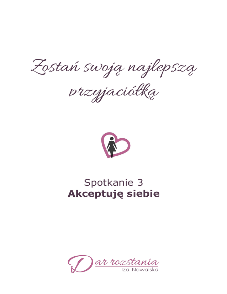 Spotkanie 3 Akceptuję siebie Czy jest coś, co chciałabyś w sobie zmienić? Czy jest coś, co powoduje, że nie czujesz się ze sobą dobrze? Żyjemy w czasach, gdzie wciąż się od nas wymaga by być lepszą, sprawniejszą, fajniejszą, na czasie. Kiedy dotyka nas kryzys, wszystkie nasze niedoskonałości atakują nas ze zdwojoną siłą. Nasz wewnętrzny krytyk szaleje. Czas na zaakceptowanie siebie taką, jaka jesteś. To podstawowy element budowy stabilnego poczucia własnej wartości. Zapraszam Cię do lektury i do ćwiczeń. Wierzę, że dasz sobie radę. Dar rozstania | Iza Nowalska Kurs: Zostań swoją najlepszą przyjaciółką Czym jest akceptacja siebie? Samoakceptacja to stosunek do samej siebie, wyrażający się w tym, co dla siebie robię. JESTEM PO SWOJEJ STRONIE wybieram to, co jest dla mnie dobre, co jest w zgodzie ze mną, troszczę się o siebie, traktuję siebie z szacunkiem i oczekuję tego od innych CHCĘ DOŚWIADCZAĆ SIEBIE jestem gotowa doświadczać wszystkich swoich myśli, uczuć, pragnień, bycia taką, jaka jestem TRAKTUJĘ SIEBIE ZE WSPÓŁCZUCIEM okazuję współczujące zainteresowanie dla motywów, które mną kierowały, chcę zrozumieć dlaczego na tamten moment moje zachowanie wydawało mi się pożądane Dar rozstania | Iza Nowalska Kurs: Zostań swoją najlepszą przyjaciółką Kiedy znajdujesz się w sytuacji rozstania Kiedy dotyka nas rozstanie pojawia się poczucie wstydu, porażki. Marzymy o wyrzuceniu z głowy tych wszystkich myśli, wyłączeniu uczuć. Jedynym pragnieniem może stać się chęć powrotu do tego, co było kiedyś. Trudno jest zaakceptować siebie, gdy mamy poczucie, że ktoś z nas zrezygnował. Nasz wewnętrzny krytyk szaleje, wytyka nam wszystkie nasze błędy, niedociągnięcia. Nienawidzę tego, co się obecnie we mnie dzieje. Jestem żałosna z tą ciągłą potrzebą płaczu, z nie wiadomo jakiego powodu. Nikt mnie więcej nie pokocha. Gdybym tylko schudła, bardziej o siebie dbała, gdybym była bardziej seksowna, to by mnie nie zostawił. Nienawidzę siebie. Nie chcę myśleć, nie chcę czuć. Jestem beznadziejna. Zrobię wszystko, żeby odciąć się od tego bólu. Kolejny raz pozwalam mu poniżać mnie. Wstydzę się tego, że mój związek się rozpadał. Byłam idiotką, że nie widziałam, co się dzieje, jak mnie zdradza. Wszyscy się ze mnie śmieją. Jak ja mogłam wejść w związek z kimś tak beznadziejnym. Gdzie ja miałam oczy? Dar rozstania | Iza Nowalska Kurs: Zostań swoją najlepszą przyjaciółką ZATRZYMAJ SIĘ NA CHWILĘ Dar rozstania | Iza Nowalska Kurs: Zostań swoją najlepszą przyjaciółką Eksperyment nr 1 Zapraszam Cię do pewnego eksperymentu. Stań przed lustrem. Spójrz sobie głęboko w oczy. To Ty. Obejrzyj swoją twarz, swoje ciało, każdą jego część. Jeśli masz na to zgodę, wykonaj to zadanie nago. Staraj się rejestrować emocje, które się w Tobie pojawiają, kiedy patrzysz na różne części Twojego ciała. Może być Ci trudno patrzeć na te części siebie, których nie akceptujesz, na te, których nie lubisz. Może pojawić się w Tobie chęć ucieczki, ból, chęć przerwania eksperymentu. Postaraj się jednak wytrwać, niech emocje i myśli przepływają. Oddychaj głęboko. Powiedz sobie: „Akceptuję siebie w pełni, akceptuję wraz ze wszystkimi niedoskonałościami. Taka jestem.” Powtarzaj to zdanie kilka razy. Postaraj się poczuć jego moc. Pamiętaj, że akceptować, oznacza przyjąć fakt, że taka jesteś, tak wyglądasz, tak wygląda Twoje ciało. Akceptować, nie oznacza lubić. Akceptować, to znaczy przyjmować fakty. Postaraj się wykonywać to zadanie codziennie przez najbliższy tydzień. Poświęć na to chociaż parę minut dziennie. Zapisz swoje spostrzeżenia, myśli i emocje, które pojawiają się w trakcie i po ……………………………………………………………………………………………………………………………………… …………………………………………………………………………………………………………………………………….. ……………………………………………………………………………………………………………………………………… …………………………………………………………………………………………………………………………………….. ……………………………………………………………………………………………………………………………………… …………………………………………………………………………………………………………………………………….. ……………………………………………………………………………………………………………………………………… …………………………………………………………………………………………………………………………………….. ……………………………………………………………………………………………………………………………………… …………………………………………………………………………………………………………………………………….. ……………………………………………………………………………………………………………………………………… ……………………………………………………………………………………………………………………………………… …………………………………………………………………………………………………………………………………….. ……………………………………………………………………………………………………………………………………… ……………