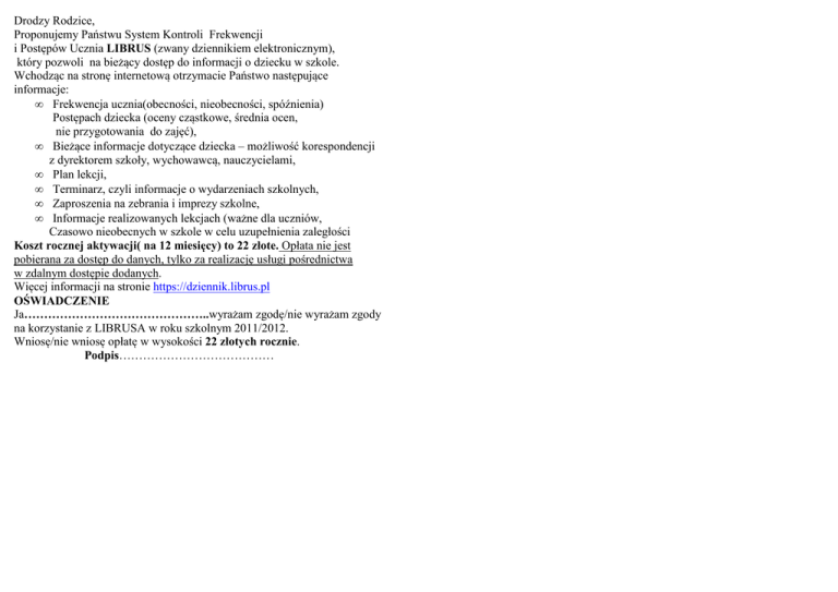 Drodzy Rodzice, Proponujemy Państwu System Kontroli Frekwencji i Postępów Ucznia LIBRUS (zwany dziennikiem elektronicznym), który pozwoli na bieżący dostęp do informacji o dziecku w szkole. Wchodząc na stronę internetową otrzymacie Państwo następujące informacje: • Frekwencja ucznia(obecności, nieobecności, spóźnienia) Postępach dziecka (oceny cząstkowe, średnia ocen, nie przygotowania do zajęć), • Bieżące informacje dotyczące dziecka – możliwość korespondencji z dyrektorem szkoły, wychowawcą, nauczycielami, • Plan lekcji, • Terminarz, czyli informacje o wydarzeniach szkolnych, • Zaproszenia na zebrania i imprezy szkolne, • Informacje realizowanych lekcjach (ważne dla uczniów, Czasowo nieobecnych w szkole w celu uzupełnienia zaległości Koszt rocznej aktywacji( na 12 miesięcy) to 22 złote. Opłata nie jest pobierana za dostęp do danych, tylko za realizację usługi pośrednictwa w zdalnym dostępie dodanych. Więcej informacji na stronie https://dziennik.librus.pl OŚWIADCZENIE Ja………………………………………..wyrażam zgodę/nie wyrażam zgody na korzystanie z LIBRUSA w roku szkolnym 2011/2012. Wniosę/nie wniosę opłatę w wysokości 22 złotych rocznie. Podpis…………………………………