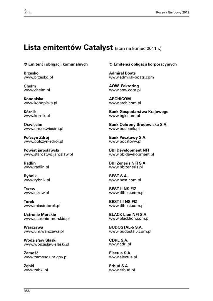 Rocznik Giełdowy 2012 Lista emitentów Catalyst (stan na koniec 2011 r.) Emitenci obligacji komunalnych Emitenci obligacji korporacyjnych Brzesko www.brzesko.pl Admiral Boats www.admiral-boats.com Chełm www.chelm.pl AOW Faktoring www.aow.com.pl Konopiska www.konopiska.pl ARCHICOM www.archicom.pl Kórnik www.kornik.pl Bank Gospodarstwa Krajowego www.bgk.com.pl Oświęcim www.um.oswiecim.pl Bank Ochrony Środowiska S.A. www.bosbank.pl Połczyn Zdrój www.polczyn-zdroj.pl Bank Pocztowy S.A. www.pocztowy.pl Powiat jarosławski www.starostwo.jarosław.pl BBI Development NFI www.bbidevelopment.pl Radlin www.radlin.pl BBI Zeneris NFI S.A. www.bbizeneris.pl Rybnik www.rybnik.pl BEST S.A. www.best.com.pl Tczew www.tczew.pl BEST II NS FIZ www.tfibest.com.pl Turek www.miastoturek.pl BEST III NS FIZ www.tfibest.com.pl Ustronie Morskie www.ustronie-morskie.pl BLACK Lion NFI S.A. www.blacklion.com.pl Warszawa www.um.warszawa.pl BUDOSTAL-5 S.A. www.budostal5.com.pl Wodzisław Śląski www.wodzislaw-slaski.pl CDRL S.A. www.cdrl.pl Zamość www.zamosc.um.gov.pl Electus S.A. www.electus.pl Ząbki www.zabki.pl Erbud S.A. www.erbud.pl 356 Rynek CATALYST Europejski Fundusz Hipoteczny www.efh.com.pl NAVI GROUP S.A. www.navi-group.sa Europejski Bank Inwestycyjny www.eib.org NFI Magna Polonia S.A. www.magnapolonia.com.pl FAST FINANCE S.A. www.fastfinance.pl ORGANIKA www.organika.pl FERRATUM CAPITAL POLAND S.A. ORZEŁ S.A. www.orzelsa.com; www.salon-opon.com FERRO S.A. www.ferro.pl GANT Development www.gant.pl Getin Noble Bank S.A. www.getinnoblebank.pl OSHEE POLSKA www.oshee.eu PCC Rokita S.A. www.pcc.rokita.pl PCZ S.A. www.pczsa.pl Ghelamco Invest www.ghelamco.be PKO Finance AB IIF S.A. www.iif.pl POLKOMTEL FINANCE AB (PUBL) www.polkomtel.com IPF INVESTMENT POLSKA www.ipf.org.uk POLSPORT GROUP www.pol-sport.com Kredyt Inkaso S.A. www.kredytinkaso.pl Pragma Factoring S.A. www.pragmafactoring.pl KRUK S.A. www.kruksa.pl PRAGMA INKASO S.A. www.pragmainkaso.pl LC Corp S.A. www.lcc.pl PRIME CAR MANAGEMENT www.masterlease.pl MAK DOM www.makdom.pl RANK PROGRESS S.A. www.rankprogress.pl MARVIPOL S.A. www.marvipol.pl REMEDIS www.remedis.eu MCI Management www.mci.pl ROBYG www.robyg.pl Mera S.A. www.mera.pl RODAN SYSTEMS S.P. www.rodan.pl MEW S.A. www.mew.pl RUBICON PARTNERS NFI www.ronson.pl Mo-BRUK S.A. www.mobruk.pl RONSON EUROPE www.rubiconpartners.pl Multimedia Polska S.A. www.multimedia.pl Scan Development SCO-PAK S.A. www.scopak.com.pl 357 Rocznik Giełdowy 2012 Siódemka www.siodemka.com BS Skierniewice www.bsskierniewice.pl SOLVECO www.solveco.pl BS-BBS Darłowo www.bbsdarlowo.pl TRAKCJA-Tiltra S.A. www.trakcja.com BS-ESBANK www.esbank.pl Trust S.A. www.trust.pl BS-GBS BANK BARLINEK www.gbsbank.pl VEDIA S.A. www.vedia.pl BS-HEXABANK www.hexabank.pl Warimpex Finanz- und Beteiligungs AG www.warimpex.at BS-KBS Kraków www.kbsbank.com.pl Widok Energia S.A. www.widokenergia.pl BS-MBS Łomianki www.mbsbank.pl Widok Energia Sp. z o.o. www.widokenergia.pl BS-OK BANK Knurów www.okbank.pl WIKANA S.A. www.wikana.pl BS-PBS Ciechanów www.pbsciechanow.pl ZPS KRZĘTLE www.krzetle.pl BS-PBS Sanok www.pbsbank.pl BS-PMBS Zabłudów www.pmbank.pl Emitenci obligacji spółdzielczych BPS Warszawa www.bankbps.pl BS-SK Bank Wołomin www.sbrzr.pl BS Biała Rawska www.bsbr.pl BS Limanowa www.bs.limanowa.pl BS Ostrów Mazowiecka www.bsostowmaz.pl BS Piaseczno www.bspiaseczno.pl BS Płońsk www.bsplonsk.pl 358 BS-SBR Szepietowo www.sbrbank.pl BS-WBS BANK WARSZAWA www.bank-wbs.pl Emitenci listów zastawnych PEKAO Bank Hipoteczny www.pekaobh.pl BRE Bank Hipoteczny www.rhb.com.pl