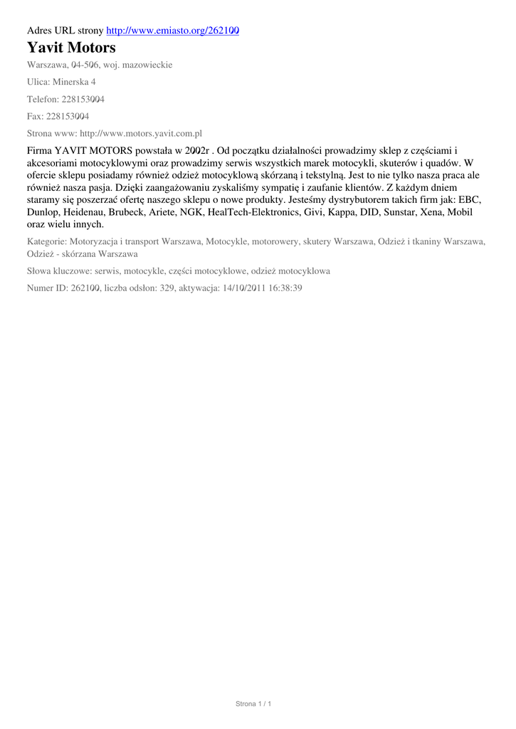 Adres URL strony http://www.emiasto.org/262100 Yavit Motors Warszawa, 04-506, woj. mazowieckie Ulica: Minerska 4 Telefon: 228153004 Fax: 228153004 Strona www: http://www.motors.yavit.com.pl Firma YAVIT MOTORS powstała w 2002r . Od początku działalności prowadzimy sklep z częściami i akcesoriami motocyklowymi oraz prowadzimy serwis wszystkich marek motocykli, skuterów i quadów. W ofercie sklepu posiadamy również odzież motocyklową skórzaną i tekstylną. Jest to nie tylko nasza praca ale również nasza pasja. Dzięki zaangażowaniu zyskaliśmy sympatię i zaufanie klientów. Z każdym dniem staramy się poszerzać ofertę naszego sklepu o nowe produkty. Jesteśmy dystrybutorem takich firm jak: EBC, Dunlop, Heidenau, Brubeck, Ariete, NGK, HealTech-Elektronics, Givi, Kappa, DID, Sunstar, Xena, Mobil oraz wielu innych. Kategorie: Motoryzacja i transport Warszawa, Motocykle, motorowery, skutery Warszawa, Odzież i tkaniny Warszawa, Odzież - skórzana Warszawa Słowa kluczowe: serwis, motocykle, części motocyklowe, odzież motocyklowa Numer ID: 262100, liczba odsłon: 329, aktywacja: 14/10/2011 16:38:39 Strona 1 / 1