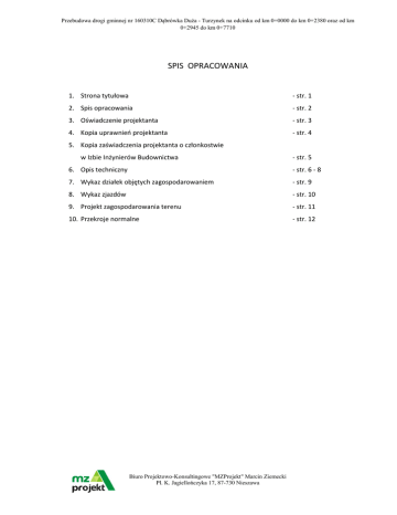 Przebudowa drogi gminnej nr 160310C Dąbrówka Duża - Turzynek na odcinku od km 0+0000 do km 0+2380 oraz od km 0+2945 do km 0+7710 SPIS OPRACOWANIA 1. Strona tytułowa - str. 1 2. Spis opracowania - str. 2 3. Oświadczenie projektanta - str. 3 4. Kopia uprawnień projektanta - str. 4 5. Kopia zaświadczenia projektanta o członkostwie w Izbie Inżynierów Budownictwa - str. 5 6. Opis techniczny - str. 6 - 8 7. Wykaz działek objętych zagospodarowaniem - str. 9 8. Wykaz zjazdów - str. 10 9. Projekt zagospodarowania terenu - str. 11 10. Przekroje normalne - str. 12 Biuro Projektowo-Konsultingowe "MZProjekt" Marcin Ziemecki Pl. K. Jagiellończyka 17, 87-730 Nieszawa Przebudowa drogi gminnej nr 160310C Dąbrówka Duża - Turzynek na odcinku od km 0+0000 do km 0+2380 oraz od km 0+2945 do km 0+7710 WYKAZ DZIAŁEK OBJĘTYCH ZAGOSPODAROWANIEM 1. Działka nr 23 - właściciel - Gmina Raciążek 2. Działka nr 45 - właściciel - Gmina Raciążek 3. Działka nr 165/4 - właściciel - Gmina Raciążek Biuro Projektowo-Konsultingowe "MZProjekt" Marcin Ziemecki Pl. K. Jagiellończyka 17, 87-730 Nieszawa Przebudowa drogi gminnej nr 160310C Dąbrówka Duża - Turzynek na odcinku od km 0+0000 do km 0+2380 oraz od km 0+2945 do km 0+7710 WYKAZ ZJAZDÓW 1. km 0+004,7 - strona L 2. km 0+047,5 - strona P 3. km 0+081,5 - strona L 4. km 0+134,5 - strona P 5. km 0+196 - strona L 6. km 0+219 - strona P 7. km 0+324,6 - strona L 8. km 0+368,74 - strona L 9. km 0+377,5 - strona P 10. km 0+427 - strona L 11. km 0+447 - strona L 12. km 0+470 - strona P 13. km 0+522 - strona P 14. km 0+525 - strona L 15. km 0+566 - strona L 16. km 0+573 - strona P 17. km 0+616 - strona P 18. km 0+674 - strona P 19. km 0+696,7 - strona P 20. km 0+759 - strona L Biuro Projektowo-Konsultingowe "MZProjekt" Marcin Ziemecki Pl. K. Jagiellończyka 17, 87-730 Nieszawa Przebudowa drogi gminnej nr 160310C Dąbrówka Duża - Turzynek na odcinku od km 0+0000 do km 0+2380 oraz od km 0+2945 do km 0+7710 OŚWIADCZENIE PROJEKTANTA Oświadczam, że zgodnie z art. 20 ust. 4 Ustawy z dnia 7 lipca 1994r. Prawo budowlane (tj. Dz. U. Nr 207 z 2003r. poz. 2016 z późń. zm.) opracowanie projektu dla zadania: "Przebudowa drogi gminnej nr 160310C Dąbrówka Duża - Turzynek na odcinku od km 0+0000 do km 0+2380 oraz od km 0+2945 do km 0+7710" jest zgodnie z umową, obowiązującymi przepisami oraz zasadami wiedzy technicznej. Projektant: inż. Wojciech Kluz Biuro Projektowo-Konsultingowe "MZProjekt" Marcin Ziemecki Pl. K. Jagiellończyka 17, 87-730 Nieszawa Przebudowa drogi gminnej nr 160310C Dąbrówka Duża - Turzynek na odcinku od km 0+0000 do km 0+2380 oraz od km 0+2945 do km 0+7710 OPIS TECHNICZNY DO PROJEKTU BUDOWLANEGO pn. Przebudowa drogi gminnej nr 160310C Dąbrówka Duża - Turzynek na odcinku o długości 0,7145 km, od km 0+0000 do km 0+2380 oraz od km 0+2945 do km 0+7710 1. Podstawa opracowania - Mapa do celów projektowych w skali 1:500 - Uzgodnienia z Inwestorem - Rozpoznanie trasy projektowanego odcinka w terenie przez projektanta - Ustawa Prawo Budowlane (Dz. U. Nr 243 poz. 1623 z dnia 7 lipca 1994r. z późniejszymi zmianami), - Ustawa o Drogach Publicznych (Dz. U. z 2013r. poz. 260) - Rozporządzenie Ministra Transportu i Gospodarki Morskiej z dnia 2 marca 1999r. w sprawie warunków technicznych, jakim powinny odpowiadać drogi publicznej i ich usytuowanie (Dz. U. 43 poz. 430) 2. Przedmiot i zakres opracowania Przedmiotem opracowania jest dokumentacja projektowa, wykonana na zlecenie Gminy Raciążek dla przedsięwzięcia polegającego na przebudowie drogi gminnej nr 160310C w miejscowości Turzynek. Zakres opracowania obejmuje: - wykonanie frezowania istniejącej nawierzchni bitumicznej na odcinku od km 0+2945 do km 0+7710, - przygotowanie i wzmocnienie istniejącej podbudowy, - ułożenie warstwy wiążącej grubości 4 cm, - ułożenie warstwy ścieralnej grubości 3 cm, - wykonanie nawierzchni zjazdów, - uformowanie i plantowanie z nadaniem normatywnego spadku obustronnych poboczy gruntowych. 3. Stan istniejący Droga gminna nr 160310C Dąbrówka Duża - Turzynek, której budowa na odcinkach od km 0+0000 do km 0+2380 oraz od km 0+2945 do km 0+7710 jest tematem opracowania zlokalizowana jest na terenie gminy Raciążek w miejscowości Turzynek. Istniejąca jezdnia posiada na odcinku od km 0+0000 do km 0+2380 nawierzchnię z kruszywa łamanego, natomiast na odcinku od km 0+2945 do km 0+7710 nawierzchnię utwardzoną bitumiczną. Szerokość jezdni na całym projektowanym odcinku wynosi ~4,5m. Otoczenie drogi stanowią grunty rolne z luźną zabudową gospodarską. W granicach pasa drogowego lub bezpośrednio przy nim występują: napowietrzne linie energetyczne, podziemne linie telekomunikacyjne i podziemne linie wodociągowe. Uzbrojenie techniczne występujące w granicach pasa drogowego nie koliduje z planowanymi robotami związanymi z przebudową drogi. Biuro Projektowo-Konsultingowe "MZProjekt" Marcin Ziemecki Pl. K. Jagiellończyka 17, 87-730 Nieszawa Przebudowa drogi gminnej nr 160310C Dąbrówka Duża - Turzynek na odcinku od km 0+0000 do km 0+2380 oraz od km 0+2945 do km 0+7710 4. Rozwiązania projektowe Projektuje się wykonanie przebudowy nawierzchni jezdni poprzez przygotowanie i wzmocnienie istniejącej podbudowy, ułożenie warstwy wiążącej grubości 4 cm, oraz warstwy ścieralnej grubości 3 cm na całej długości przebudowywanego odcinka drogi. Uzupełnieniem robót będzie uformowanie i plantowanie z nadaniem normatywnego spadku obustronnych poboczy gruntowych o szerokości 0,75 m. Początek i koniec projektowanego odcinka należy dowiązać wysokościowo do wysokości istniejącej nawierzchni bitumicznej. Całość robót związanych z przebudową drogi gminnej nr 160310C wykonana zostanie w granicach istniejącego pasa drogowego tej drogi (działki o numerach geodezyjnych 23, 45, 165/4). Parametry techniczne: - Kategoria drogi: L - Prędkość projektowa: 30 km/h - Długość łączna: 0,7145 km - Szerokość nawi