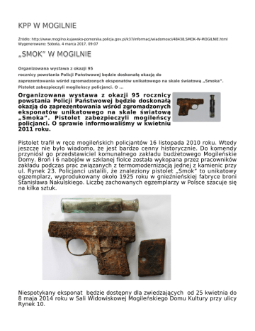 KPP W MOGILNIE Źródło: http://www.mogilno.kujawsko-pomorska.policja.gov.pl/k37/informacj/wiadomosci/48438,SMOK-W-MOGILNIE.html Wygenerowano: Sobota, 4 marca 2017, 09:07 „SMOK” W MOGILNIE Organizowana wystawa z okazji 95 rocznicy powstania Policji Państwowej będzie doskonałą okazją do zaprezentowania wśród zgromadzonych eksponatów unikatowego na skale światową „Smoka”. Pistolet zabezpieczyli mogileńscy policjanci. O ... Organizowana wystawa z okazji 95 rocznicy powstania Policji Państwowej będzie doskonałą okazją do zaprezentowania wśród zgromadzonych eksponatów unikatowego na skale światową „Smoka”. Pistolet zabezpieczyli mogileńscy policjanci. O sprawie informowaliśmy w kwietniu 2011 roku. Pistolet trafił w ręce mogileńskich policjantów 16 listopada 2010 roku. Wtedy jeszcze nie było wiadomo, że jest bardzo cenny historycznie. Do komendy przyniósł go przedstawiciel komunalnego zakładu budżetowego Mogileńskie Domy. Broń i 6 nabojów w szklanej fiolce została wykopana przez pracowników zakładu podczas prac związanych z termomodernizacją jednej z kamienic przy ul. Rynek 23. Policjanci ustalili, że znaleziony pistolet „Smok” to unikatowy egzemplarz, wyprodukowany około 1925 roku w gnieźnieńskiej fabryce broni Stanisława Nakulskiego. Liczbę zachowanych egzemplarzy w Polsce szacuje się na kilka sztuk. Niespotykany eksponat będzie dostępny dla zwiedzających od 25 kwietnia do 8 maja 2014 roku w Sali Widowiskowej Mogileńskiego Domu Kultury przy ulicy Rynek 10. Autor: kppmogilno Publikacja: kppmogilno Ocena: 0/5 (0) Tweetnij