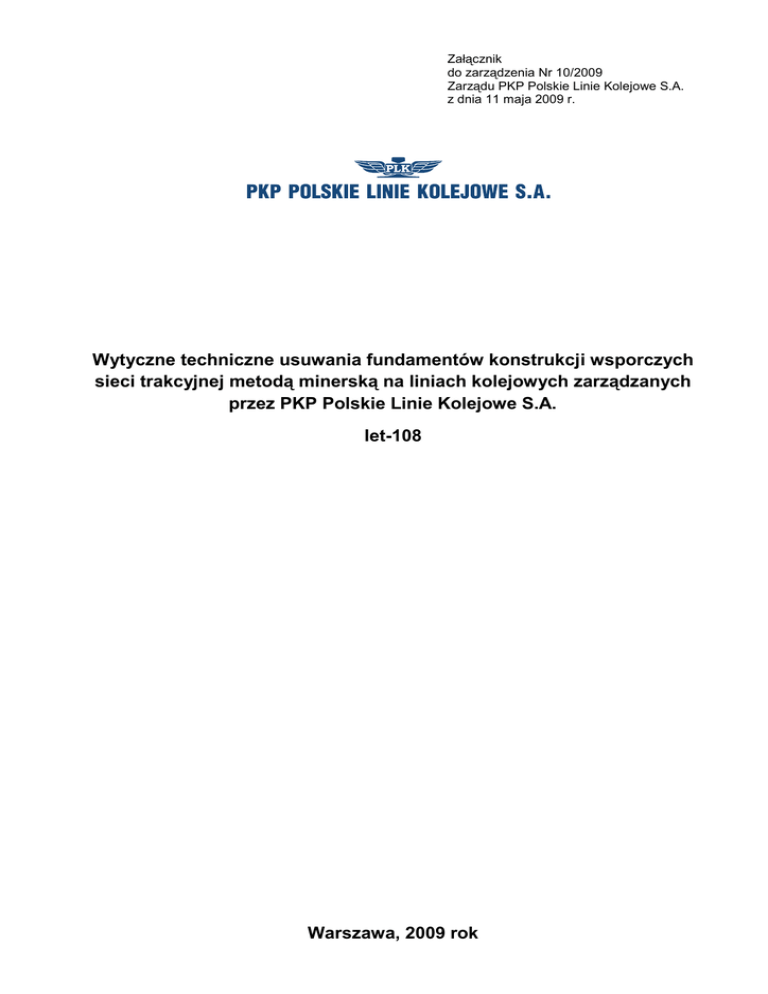 Załącznik do zarządzenia Nr 10/2009 Zarządu PKP Polskie Linie Kolejowe S.A. z dnia 11 maja 2009 r. Wytyczne techniczne usuwania fundamentów konstrukcji wsporczych sieci trakcyjnej metodą minerską na liniach kolejowych zarządzanych przez PKP Polskie Linie Kolejowe S.A. Iet-108 Warszawa, 2009 rok Właściciel: PKP Polskie Linie Kolejowe S.A. Wydawca: PKP Polskie Linie Kolejowe S.A. Centrala Biuro Energetyki ul. Targowa 74, 03-734 Warszawa tel. 022 47 336 50 www.plk-sa.pl, e-mail: [email protected] Wszelkie prawa zastrzeżone. Modyfikacja, wprowadzanie do obrotu, publikacja, kopiowanie i dystrybucja w celach komercyjnych, całości lub części instrukcji, bez uprzedniej zgody PKP Polskie Linie Kolejowe S.A. – są zabronione PKP POLSKIE LINIE KOLEJOWE S.A. Wytyczne techniczne określają możliwości stosowania metody minerskiej przy likwidacji fundamentów konstrukcji wsporczych sieci trakcyjnej. §1. Stosowanie technologii wyburzania fundamentów konstrukcji wsporczych sieci trakcyjnej metodą minerską na liniach zarządzanych przez PKP Polskie Linie Kolejowe S.A. wymaga uzyskania zgody Spółki PKP Polskie Linie Kolejowe S.A. zwanej dalej zarządcą. Zgoda taka wydawana jest przez zarządcę na podstawie pozytywnej opinii jednostek naukowo badawczych, określających stopień oddziaływania metody na elementy infrastruktury technicznej linii kolejowych. Firma ubiegająca się o uzyskanie zlecenia na roboty, na liniach zarządzanych przez PKP PLK S.A., „metodą minerską” według określonej technologii wyburzania powinna: 1. udokumentować posiadanie przez pracowników prowadzących prace wyburzeniowe uprawnień do projektowania i kierowania robotami budowlanymi z użyciem materiałów wybuchowych, 2. opracować technologię wyburzania fundamentów metodą minerską bezpieczną dla całej infrastruktury linii kolejowych i zawrzeć ją w jednolitym dokumencie (dokumentacji strzałowej), 3. w porozumieniu z PKP PLK S.A. Biurem Energetyki uzgodnić poligony doświadczalne dla przeprowadzenia badań oddziaływania metody minerskiej na infrastrukturę techniczną linii kolejowych. Wyniki badań powinny uwzględnić badania w różnych warunkach gruntowych, w tym również nawodnienie gruntów oraz warunki lokalizacyjne wyburzanych fundamentów (teren płaski, nasyp, przekop) i usytuowanie wobec nich: toru, urządzeń odwadniających, kabli, itd. Dopuszcza się przedstawienie wyników badań wykonanych na poligonach doświadczalnych niebędących w zarządzaniu PKP PLK S.A., a uwzględniające powyższe uwarunkowania, 4. udokumentować stopień oddziaływania – ingerencji stosowanej technologii wyburzania na inne urządzenia infrastruktury, przez przedstawienie wyników badań i pomiarów wykonanych przez jednostkę naukowo – badawczą specjalizującą się w zagadnieniach związanych z wyburzeniami, znającą specyfikę zagadnień kolejowych w zakresie oddziaływania opracowanej technologii na infrastrukturę linii kolejowych oraz przedłożyć pozytywną opinię dotyczącą wpływu stosowania technologii na zmiany wytrzymałościowe gruntu wokół wyburzanego fundamentu. 5. Zakres badań powinien uwzględniać: analizę sił przekazywanych poprzez elementy rozkruszonego fundamentu na podtorze i nawierzchnię kolejową, wpływ wyburzania fundamentu metodą minerską na parametry techniczne kontrolowanego podtorza, tym samym na stateczność nasypów i bezpieczeństwo ruchu, wpływ wyburzania i powierzchniowych, na konstrukcje ciągów odwodnieniowych wgłębnych 3 stan na dzień 1 grudnia 2009 r. PKP POLSKIE LINIE KOLEJOWE S.A. wpływ oddziaływania metody na kable energetyczne, urządzeń sterowania ruchem kolejowym, teletechniczne i inne, znajdujące się w bezpośrednim sąsiedztwie wyburzanego fundamentu. Badania powinny jednoznacznie potwierdzić nienaruszanie elementów infrastruktury kolejowej, zwłaszcza kabli w bezpośrednim sąsiedztwie fundamentu oraz zawierać ocenę sposobu ich zabezpieczenia przed oddziaływaniem fali wyburzeniowej. Konieczne jest wykonanie pomiarów parametrów technicznych kabli przed i po wyburzeniu fundamentu w warunkach nawilgocenia gruntu. §2. Zasady stosowania technologii wyburzania fundamentów konstrukcji wsporczych sieci trakcyjnej metodą minerską. Stosowanie metody odbywa się w oparciu o zgodę zarządcy wydaną w oparciu o uwarunkowania wyszczególnione w § 1 niniejszych Wytycznych technicznych …. W celu wyeliminowania zagrożeń związanych z oddziaływaniem metody minerskiej na obiekty zlokalizowane w pobliżu wyburzanych fundamentów konstrukcji wsporczych sieci trakcyjnej, prace minerskie powinny być prowadzone etapami. Etap I - projektowanie W ramach realizacji etapu I należy spełnić następujące warunki: 1. uzyskać informacje od właścicieli infrastruktury i zarządców terenu o aktualnym przebiegu linii kablowych i instalacji przechodzących w rejonie wyburzanych fundamentów, 2. zapoznać się z aktualnym podkładem geodezyjnym terenu, na którym będą prowadzone prace wyburzeniowe oraz porównać go z informacjami otrzymanymi od zarządcy infrastruktury, 3. przeprowadzić przy współudziale przedstawicieli zarządcy wizję lokalną miejsca wykonywania wyburzeń metodą minerską. W oględzinach miejsca wyburzeń powinni uczestniczyć przedstawiciele zarządcy infrastruktury reprezentujący poszczególne branże, którzy wskażą rzeczywistą lokalizację urządzeń infrastruktury podziemnej i zaznaczą miejsca kolizji. W ramach prowadzonych oględzin należy określić: rodzaj fundamentów przeznaczonych do wyburzenia, sposób posadowienia w podtorzu, rodzaj i stan gruntu ( w tym jego nawodnienie), odległość od toru, końca nasypów, kabli, kanałów kablowych, przebieg uzbrojenia fundamentów, podziemnego w obrębie wskazanych do wyburzenia ustalić drogi dojazdu lub ewentualnie określić odcinki robót konieczne do realizacji z drezyny (określić zamknięcia torowe), sporządzić wykaz fundamentów d