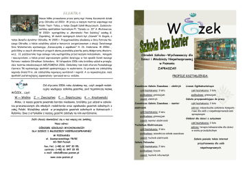 ELEKTRA Nasze kółko prowadzone przez panią mgr Hannę Kaczmarek działa W przy Ośrodku od 2001r. W pracy w naszym teatrze wspomaga nas Polski Teatr Tańca, a także Zespół Szkół Muzycznych. Zadebiutowaliśmy spektaklem teatralnym Pt. ”Dziady cz. .II” A. Mickiewicza. W 2002r. wystąpiliśmy w „Moralności Pani Dulskiej” według G. Zapolskiej. W dwóch następnych latach był „Ożenek” N. Gogola, a zek także Benefis dyrektor Ośrodka. W 2005 r. Przygotowaliśmy akademię w Dniu Patrona Naszego Ośrodka, a także wzięliśmy udział w koncercie zorganizowanym z okazji Światowego Dnia Wolontariatu wystawiając „Dziewczynkę z zapałkami” H. Ch. Andersena. W 2006r. , gościliśmy w swych skromnych progach słynną poznańską pisarkę panią Małgorzatę Musierowicz. 13. października tego samego roku wystąpiliśmy przed naszymi koleżankami, kolegami i nauczycielami, a także przed zaproszonymi gośćmi świętując w ten sposób Dzień naszego Patrona i nadanie Ośrodkowi Sztandaru. W listopadzie 2006 roku braliśmy udział w przeglądzie teatrów młodzieżowych MELPOMENA 2006. Oddaliśmy tam hołd ofiarom Poznańskiego Ośrodek Szkolno—Wychowawczy dla Dzieci i Młodzieży Niepełnosprawnej w Poznaniu ZAPRASZA!!! Czerwca ’56 wystawiając spektakl upamiętniający to wydarzenie. Co prawda nie zdobyliśmy nagrody Grand Prix, ale zdobyliśmy najwięcej wyróżnień i nagród. A co najważniejsze, nasz PROFILE KSZTAŁCENIA: spektakl został najlepiej zapamiętany i poruszył serca widzów. W zek Od stycznia 2006 roku działamy my, czyli zespół redakcyjny wydający szkolną gazetkę, pod tajemniczą nazwą WÓZEK... czyli: W — Wielkie Z — Zwycięstwo E — Empatycznej K — Kreatywności Mimo, iż nasza gazeta powstała bardzo niedawno, braliśmy już udział w szkoleniu przeznaczonym dla młodych redaktorów oraz opiekunów gazetek szkolnych z całej Polski. Wzięliśmy udział w przeglądzie gazetek szkolnych w Katowicach i Rybniku. Dwa z artykułów z naszej gazetki zdobyły na nim wyróżnienie. Jeśli chcesz dowiedzieć się o nas więcej nie zwlekaj. Nasz adres: OŚRODEK SZKOLNO-WYCHOWAWCZY DLA DZIECI I MŁODZIEZY NIEPEŁNOSPRAWNEJ W POZNANIU ul. Szamarzewskiego 78/82 60-569 Poznań fax./tel. (+48) 61 847 30 95; centrala: (+48) 61 847 20 95 e-mail: [email protected] www.sosw.poznan.pl Zasadnicza Szkoła Zawodowa - elektryk Liceum Ogólnokształcące cykl kształcenia: 3 lata cykl kształcenia: 3 lata podbudowa: gimnazjum podbudowa: gimnazjum zawód: elektryk Szkoła przysposabiająca do pracy Zasadnicza Szkoła Zawodowa - monter cykl kształcenia: 3 lata elektronik zakres: indywidualne szkolenie komputerowe dla osób z niepełnosprawnościami sprzężonymi N a g ł ó w e k a r t y k u ł u d o d a t k o w e g o cykl kształcenia: 3 lata podbudowa: gimnazjum zawód: monter elektronik Technikum Elektroniczne cykl kształcenia: 3 lata podbudowa: zasadnicza szkoła zawodowa zawód: technik elektronik Szkoła Policealna cykl kształcenia: 2 lata podbudowa: liceum zawód: technik informatyk Oddział dla dzieci z autyzmem cykl kształcenia: 3 lata zakres: terapia behawioralna dla dzieci w wieku przedszkolnym Szkoła posiada także internat przystosowany dla osób niepełnosprawnych. „Praca nad sobą ważna rzecz...” Sekcja bilardu Sekcja siatkówki na siedząco Sekcja siatkówki na siedząco istnieje od siedmiu lat. Drużyna wielokrotnie stawała na najwyższym podium Mistrzostw Polski. Z tej poznańskiej drużyny, którą stworzył pan magister Roman Pięta wielu zawodników zostało powołanych do reprezentacji P o l s k i n a ś w i e c i e . Osiągnięcia: Sekcja bilardu istnieje od grudnia 2003 roku, a juz w 2004 roku zdobyliśmy 3 medale Mistrzostw Polski: Brąz w 9-bil w parach drużynowych, Brąz w 9-bil i Srebro w 8-bil. Każdy ma szanse wziąć udział w treningach. Dzięki bilardowi możemy ćwiczyć koncentrację, celność. Bilard jest sportem dla młodzieży która nie lubi lub nie może uprawiać sportów siłowych. Treningi odbywają się w klubie Hades, internacie oraz szkole. Mistrz Polski w latach 1999, 2000, 2003, 2004, 2005. Kółko informatyczne Zdobywca Pucharu Polski w latach 2003. Wicemistrz Polski w 2001, 2002, 2006 roku. Kółko informatyczne zaprasza uczniów którzy interesują się komputerami i wszystkim co jest z nimi związane. Raz w tygodniu można skorzystać z jednaj z trzech sal informatycznych, a także pomocy i rad nauczyciela informatyki. Piąte miejsce w mistrzostwach świata juniorów, z udziałem zawodników z naszego klubu sportowego. Sekcja koszykówki na wózkach Drużyna koszykówki na wózkach istnieje dziesięć lat. W tym okresie nasi reprezentanci wielokrotnie stawali na najwyższym podium Mistrzostw Polski. W sporcie niepełnosprawnych koszykówka na wózkach uważana jest za dyscyplinę najbardziej widowiskowa. Chociaż nie jest ona tak popularna jak koszykówka ludzi zdrowych, czy tez NBA - jest dyscypliną naprawdę emocjonującą, a co najważniejsze dająca jej uczestnikom wiele satysfakcji. Osiągnięcia: Mistrz Polski i Zdobywca Pucharu Polski w latach 1995-2000, Wielokrotny Medalista Mistrzostw Polski 1994-2002, Możliwość korzystania z komputerów mają również mieszkańcy internatu. Znajduje się w nim bowiem sala komputerowa z dostępem do Internetu. Usprawnienie fizyczne Celem naszego Ośrodka jest nie tylko podnoszenie sprawności intelektualnej, ale również fizycznej. Dlatego każdy, kto tylko ma ochotę może wziąć udział w zajęciach, które pomagają w zdobywaniu sprawności, co w przypadku osób niepełnosprawnych jest szczególnie ważne.