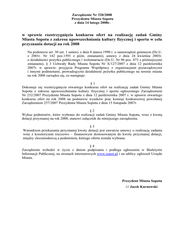 Zarządzenie Nr 320/2008 Prezydenta Miasta Sopotu z dnia 14 lutego 2008r. w sprawie rozstrzygnięcia konkursu ofert na realizację zadań Gminy Miasta Sopotu z zakresu upowszechniania kultury fizycznej i sportu w celu przyznania dotacji na rok 2008 Na podstawie art. 30 ust. 1 ustawy z dnia 8 marca 1990 r. o samorządzie gminnym (Dz.U. z 2001r. Nr 142 poz.1591 z późn. zmianami), ustawy z dnia 24 kwietnia 2003r. o działalności poŜytku publicznego i wolontariacie (Dz.U. Nr 96 poz. 873 z późniejszymi zmianami), § 3 Uchwały Rady Miasta Sopotu Nr X/127/2007 z dnia 12 października 2007r. w sprawie: przyjęcia Programu Współpracy z organizacjami pozarządowymi i innymi podmiotami, prowadzącymi działalność poŜytku publicznego na terenie miasta na rok 2008 zarządza się, co następuje: §1 Dokonuje się rozstrzygnięcia otwartego konkursu ofert na realizację zadań Gminy Miasta Sopotu z zakresu upowszechniania kultury fizycznej i sportu ogłoszonego Zarządzeniem Nr 232/2007 Prezydenta Miasta Sopotu z dnia 12 października 2007 r. w sprawie otwartego konkursu ofert na rok 2008 na podstawie wyników prac komisji konkursowej powołanej Zarządzeniem 257/2007 Prezydenta Miasta Sopotu z dnia 15 listopada 2007r. §2 Wykaz podmiotów, które wybrano do realizacji zadań Gminy Miasta Sopotu, wraz z kwotą dotacji przyznanej na rok 2008, stanowi załącznik do niniejszego zarządzenia. §3 Warunkiem przekazania przyznanej kwoty dotacji jest zawarcie umowy o realizację zadania wraz z kosztorysem rzeczowo – finansowym dostosowanym do kwoty przyznanej dotacji, między zleceniodawcą a podmiotem, którego oferta została wybrana. §4 Zarządzenie wchodzi w Ŝycie z dniem podpisania i podlega ogłoszeniu w Biuletynie Informacji Publicznej, na stronach internetowych www.sopot.pl i na tablicy ogłoszeń Urzędu Miasta. Prezydent Miasta Sopotu /-/ Jacek Karnowski Załącznik do Zarządzenia Nr 320/2008 Prezydenta Miasta Sopotu z dnia 14 lutego 2008r. DOTACJE PRZYZNANE W RAMACH OTWARTEGO KONKURSU OFERT DLA ORGANIZACJI POZARZĄDOWYCH w DZIEDZINIE UPOWSZECHNIANIE KULTURY FIZYCZNEJ I SPORTU NA 2008 r. I TURA Dział 926 Rozdział 92605 §2820 lp. Nazwa organizacji Nazwa zadania Decyzja Prezydenta 1. Sopocki Klub Lekkoatletyczny 1. 1 Program „Razem do Aten” 65.000 2. 2 XI Grand Prix Sopotu im. Janusza Sidły 60.000 3. 3 XXI Tyczka na Molo 7.000 4. 4 XVII Festyn z okazji Międzynarodowego dnia dziecka 3.000 5. 5 VIII Festiwal Sztafet Szkół Sopockich 2. Sopockie Stowarzyszenie Sportowe Automobilklub Orski 6.000 SUMA: 141.000 7.1 XI Międzynarodowe Górskie Samochodowe Mistrzostwa Polski – Lotos GRAND PRIX SOPOT 2008 25.000 8.2 Szkolenie sportowe i szkolenie w zakresie bezpiecznej jazdy samochodem 7.000 9.3 Rajdowy samochodowy Puchar Prezydenta Sopotu 1.000 SUMA: 3. Uczniowski Klub Sportowy „NAVIGO” 10.1 Szkolenie Ŝeglarskie dzieci i młodzieŜy na katamaranach 11.2 Regaty katamaranów z cyklu „Trzy Mola” Sopot 2008” Sopocki Klub Jeździecki 10.000 1.500 12.3 Morskie Mistrzostwa Polski Katamaranów Sopot 2008 3.500 13.4 Regaty Sopot Katamaran Cup 2008 o Puchar Prezydenta Miasta Sopotu 5.000 SUMA: 4. 33.000 20.000 14.1 CSI*** – Międzynarodowe Zawody w Skokach, festyn rodzinny dla mieszkańców Sopotu 25.000 15.2 CIC***, CIC**, CIC* – Międzynarodowe Zawody we Wszechstronnym Konkursie Konia Wierzchowego 5.000 16.3 Halowy Puchar Polski w ujeŜdŜaniu 5.000 17.4 Ogólnopolskie Zawody we Wszechstronnym Konkursie Konia Wierzchowego w klasach L, CNC*, CNC** 5.000 18.5 Szkolenie jeździeckie całoroczne dla juniorów młodszych, juniorów, młodych jeźdźców w dyscyplinie skoków, WKKW i ujeŜdŜania 10.000 SUMA: 5. 6. Miejski Klub Sportowy „Ogniwo” Stowarzyszenie Polskie Rugby 7 21.1 Regionalny Turniej Dzieci i MłodzieŜy w Rugby – kwiecień 2008 22.2 Regionalny Turniej Dzieci i MłodzieŜy w Rugby – wrzesień 2008 23.3 IV Międzynarodowy Turniej Młodzików Rugby 7 im. Waldemara Zajczonki 2.000 24.4 Ogólnopolski Turniej Dzieci i MłodzieŜy im. Mieczysława Opieki 25.5 Międzynarodowy Turniej Kwalifikacyjny do Pucharu Świata i Mistrzostw Europy Rugby 7 „Hodura Sopot Sevens” 3.000 26.6 Szkolenie dzieci i młodzieŜy w kategoriach wiekowych od 10 do 19 lat SUMA: 95.000 27.1 Międzynarodowy Turniej Rugby 7 kadetów „Puchar Bałtyku” 28.2 Międzywojewódzkie Mistrzostwa Młodzików Rugby 7 SUMA: 7. Sopocki Klub śeglarski Uczniowski Klub Sportowy „SIÓDEMKA” 2.000 2.000 5.000 109.000 4.000 2.000 6.000 29.1 Starty w imprezach głównych oraz starty kontrolne zawodników SKś Hestia Sopot 35.000 30.2 Okres przygotowawczy zawodników SKś Hestia Sopot 30.000 31.3 Mistrzostwa Świata w śeglarskiej klasie TECHNO 293 20.000 32.4 Mistrzostwa Europy w klasie Formuła Windsurfing 20.000 33.5 śeglarskie Lato w Sopocie 10.000 SUMA: 8. 50.000 115.000 34.1 „Europa – to znaczy być razem” 2.000 35.2 „W Zdrowym Ciele Zdrowy Duch” 30.000 SUMA: 32.000 9. Sopockie Towarzystwo Tenisowe 37.1 Upowszechnianie kultury fizycznej i sportu – tenis ziemny 5.000 10. MłodzieŜowe Towarzystwo 38.1 „Ruch rzeźbi umysł i ciało” 5.000 Sportowe „Junior” 39.2 „Sopockie lekkoatletyczne talenty Olimpijskie” 15.000 SUMA: 20.000 11. Stowarzyszenie Kultury Fizycznej Podwórkowa DruŜyna Piłkarska „Karlikowo Sopot 40.1 Szkolenie dzieci i młodzieŜy w dyscyplinie piłka noŜna oraz wychowanie dzieci i młodzieŜy przez sport 4.000 12. Stowarzyszenie Piłkarskie „Jantar Sopot” 41.1 Upowszechnianie kultury fizycznej i sportu wśród dzieci i młodzieŜy 10.000 13. Sopocki Klub Tenisowy 43.2 „Talentiada Sopocka” program szkolenia gry w tenisa dla dzieci do lat 12 15.000 44.3 Turniej im. Braci Korneluków (do lat 16) 5.000 SUMA: 14. 15. Sopockie Stowarzyszenie Kulturystyki i Rekreacji Sopot Curling Klub Wa ku’ta 20.000 46.1 Szkolenie, ubiór sportowy, imprezy sportoworekreacyjne w sopockich szkołach i wyjazd na zawody w zakresie kulturystyki i sportów siłowych 9