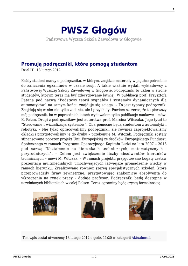 1 PWSZ Głogów Państwowa Wyższa Szkoła Zawodowa w Głogowie Promują podręczniki, które pomogą studentom Dział IT · 13 lutego 2012 Każdy student marzy o podręczniku, w którym. znajdzie materiały w pigułce potrzebne do zaliczenia egzaminów w czasie sesji. A takie właśnie wydali wykładowcy z Państwowej Wyższej Szkoły Zawodowej w Głogowie. Podręczniki to ukłon w stronę studentów, którym teraz ma być zdecydowanie łatwiej. W publikacji prof. Krzysztofa Patana pod nazwą “Podstawy teorii sygnałów i systemów dynamicznych dla automatyków” na samym końcu znajduje się ściąga. – To jest typowy podręcznik. Znajdują się w nim nie tylko zadania, ale i przykłady. Powiem szczerze, że to pierwszy mój podręcznik, bo w poprzednich latach wydawałem tylko publikacje naukowe – mówi K. Patan. Drugi z podręczników jest autorstwa prof. Marcina Witczaka. Jego tytuł to “Sterowanie i wizualizacja systemów”. Oba pomocne będą studentom z automatyki i robotyki. – Nie tylko opracowaliśmy podręczniki, ale również zaprojektowaliśmy okładki i przygotowaliśmy je do druku – przekonuje M. Witczak. Podręczniki zostały sfinansowane poprzez projekt Unii Europejskiej ze środków Europejskiego Funduszu Społecznego w ramach Programu Operacyjnego Kapitału Ludzi na lata 2007 – 2013 pod nazwą “Kształcenie na kierunkach technicznych, matematycznych i przyrodniczych”. – Celem jest zwiększenie liczby absolwentów kierunków technicznych – mówi M. Witczak. – W ramach projektu przygotowano bogaty zestaw prezentacji multimedialnych umożliwiających łatwiejsze gromadzenie wiedzy w ramach kierunku. Zrealizowano również szereg specjalistycznych szkoleń, które przeprowadziły firmy zewnętrzne, przygotowując znakomicie absolwenta do wkroczenia na rynek pracy – dodaje profesor. Podręczniki będą dostępne w uczelnianych bibliotekach w całej Polsce. Teraz egzaminy będą czystą formalnością. Ten wpis został utworzony 13 lutego 2012 o godz. 11:20 w kategorii Aktualności. PWSZ Głogów -1/2- 17.04.2016 2 PWSZ Głogów -2/2- 17.04.2016