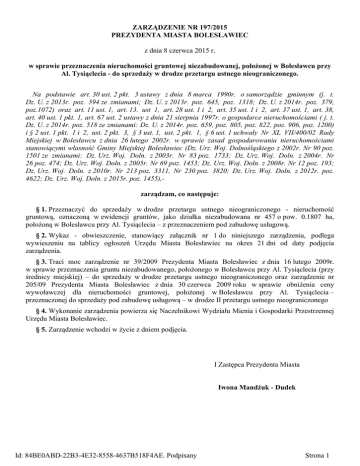 ZARZĄDZENIE NR 197/2015 PREZYDENTA MIASTA BOLESŁAWIEC z dnia 8 czerwca 2015 r. w sprawie przeznaczenia nieruchomości gruntowej niezabudowanej, położonej w Bolesławcu przy Al. Tysiąclecia - do sprzedaży w drodze przetargu ustnego nieograniczonego. Na podstawie art. 30 ust. 2 pkt. 3 ustawy z dnia 8 marca 1990r. o samorządzie gminnym (j. t. Dz. U. z 2013r. poz. 594 ze zmianami; Dz. U. z 2013r. poz. 645, poz. 1318; Dz. U. z 2014r. poz. 379, poz.1072) oraz art. 11 ust. 1, art. 13. ust 1, art. 28 ust. 1 i 2, art. 35 ust. 1 i 2, art. 37 ust. 1, art. 38, art. 40 ust. 1 pkt. 1, art. 67 ust. 2 ustawy z dnia 21 sierpnia 1997r. o gospodarce nieruchomościami ( j. t. Dz. U. z 2014r. poz. 518 ze zmianami: Dz. U. z 2014r. poz. 659, poz. 805, poz. 822, poz. 906, poz. 1200) i § 2 ust. 1 pkt. 1 i 2, ust. 2 pkt. 3, § 3 ust. 1, ust. 2 pkt. 1, § 6 ust. 1 uchwały Nr XL VII/400/02 Rady Miejskiej w Bolesławcu z dnia 26 lutego 2002r. w sprawie zasad gospodarowania nieruchomościami stanowiącymi własność Gminy Miejskiej Bolesławiec (Dz. Urz. Woj. Dolnośląskiego z 2002r. Nr 90 poz. 1501 ze zmianami: Dz. Urz. Woj. Doln. z 2003r. Nr 83 poz. 1733; Dz. Urz. Woj. Doln. z 2004r. Nr 26 poz. 474; Dz. Urz. Woj. Doln. z 2005r. Nr 69 poz. 1453; Dz. Urz. Woj. Doln. z 2008r. Nr 12 poz. 193; Dz. Urz. Woj. Doln. z 2010r. Nr 213 poz. 3311, Nr 230 poz. 3820; Dz. Urz. Woj. Doln. z 2012r. poz. 4622; Dz. Urz. Woj. Doln. z 2015r. poz. 1455),zarządzam, co następuje: § 1. Przeznaczyć do sprzedaży w drodze przetargu ustnego nieograniczonego - nieruchomość gruntową, oznaczoną w ewidencji gruntów, jako działka niezabudowana nr 457 o pow. 0.1807 ha, położoną w Bolesławcu przy Al. Tysiąclecia – z przeznaczeniem pod zabudowę usługową. § 2. Wykaz - obwieszczenie, stanowiący załącznik nr 1 do niniejszego zarządzenia, podlega wywieszeniu na tablicy ogłoszeń Urzędu Miasta Bolesławiec na okres 21 dni od daty podjęcia zarządzenia. § 3. Traci moc zarządzenie nr 39/2009 Prezydenta Miasta Bolesławiec z dnia 16 lutego 2009r. w sprawie przeznaczenia gruntu niezabudowanego, położonego w Bolesławcu przy Al. Tysiąclecia (przy średnicy miejskiej) – do sprzedaży w drodze przetargu ustnego nieograniczonego oraz zarządzenie nr 205/09 Prezydenta Miasta Bolesławiec z dnia 30 czerwca 2009 roku w sprawie obniżenia ceny wywoławczej dla nieruchomości gruntowej, położonej w Bolesławcu przy Al. Tysiąclecia – przeznaczonej do sprzedaży pod zabudowę usługową – w drodze II przetargu ustnego nieograniczonego § 4. Wykonanie zarządzenia powierza się Naczelnikowi Wydziału Mienia i Gospodarki Przestrzennej Urzędu Miasta Bolesławiec. § 5. Zarządzenie wchodzi w życie z dniem podjęcia. I Zastępca Prezydenta Miasta Iwona Mandżuk - Dudek Id: 84BE0ABD-22B3-4E32-8558-4637B518F4AE. Podpisany Strona 1 Załącznik Nr 1 do Zarządzenia Nr 197/2015 Prezydenta Miasta Bolesławiec z dnia 8 czerwca 2015 r. WYKAZ – OBWIESZCZENIE nieruchomości gruntowej niezabudowanej, przewidzianej do sprzedaży w drodze przetargu ustnego nieograniczonego – z przeznaczeniem pod zabudowę usługową 1. Al. Tysiąclecia - działka niezabudowana nr 457 o pow. 0.1807 ha, AM 05, obręb 10, o użytku RIVa. Cena gruntu (brutto) wynosi – 225.000 zł – wywoławcza do przetargu W cenę gruntu wliczony jest należny podatek od towarów i usług, według obowiązującej stawki podatku VAT. Cena osiągnięta w przetargu, płatna będzie w całości przed zawarciem umowy notarialnej, łącznie z podatkiem VAT. 2. Nieruchomość położona jest we wschodniej części miasta Bolesławiec, bezpośrednio przy granicy administracyjnej z miejscowością Kruszyn. Dojazd do działki będzie odbywał się z ronda drogą gruntową na zapleczu stacji paliw. Teren działki porośnięty trawami i samosiejkami krzewów. W najbliższym sąsiedztwie znajdują się: stacja paliw oraz droga krajowa nr 94 (obwodnica miasta). Po południowej stronie ulicy Tysiąclecia zabudowa o charakterze przemysłowym i handlowo – usługowym. W miejscowym planie zagospodarowania przestrzennego miasta Bolesławca, uchwalonym przez Radę Miasta w Bolesławcu, uchwałą nr VI/43/07 z dnia 14 marca 2007 roku - działka przeznaczona jest pod tereny usług – symbol z planu C-U20. Przeznaczenie podstawowe – usługi. Parametry i wskaźniki kształtowania zabudowy oraz zagospodarowania terenu. 1. obowiązuje zabudowa w układzie wolnostojącym, przy czym dopuszcza się zabudowę na granicy działki, 2. wysokość zabudowy wynosi nie więcej niż dwie kondygnacje nadziemne, 3. maksymalny wskaźnik zabudowy działki wynosi 0.70, 4. minimalny wskaźnik powierzchni biologicznie czynnej działki ustala się na 10%. Dojazd do działki. Działka położona jest bezpośrednio przy obwodnicy miasta, stanowiącej odcinek drogi krajowej nr 94. Brak jednak zjazdu z drogi krajowej i zgodnie z ustaleniami obowiązującymi w miejscowy planie zagospodarowania przestrzennego wyklucza się bezpośrednią obsługę komunikacyjną terenu z ulicy głównej ruchu przyspieszonego; dopuszcza się włączenie terenu do układu komunikacyjnego terenów przyległych: obecnie dojazd do działki możliwy jedynie wąską drogą polną (działka ewidencyjna nr 534/3 obręb Kruszyn, stanowiąca własność Gminy Bolesławiec. 3. Przez teren działki przebiega sieć kanalizacyjna, sieć elektroenergetyczna średniego napięcia oraz sieć teletechniczna. Nabywca nieruchomości zobowiązany będzie do uzgodnienia z właścicielami sieci, ewentualnych zmian ich przebiegu, rozbudowy czy usunięcia i finansowania tych robót, przy uwzględnieniu obowiązujących przepisów prawa. W przypadku, gdy Nabywca nie będzie domagać się zmiany przebiegu sieci, albo gdy będzie się tego domagać, a nie uzgodni z właścicielem sieci, warunków finansowych zmiany przebiegu, rozbudowy czy usunięcia, to będzie miał obowiązek uzgodnić z każdym właścicielem sieci, zasady korzystania z tej części g