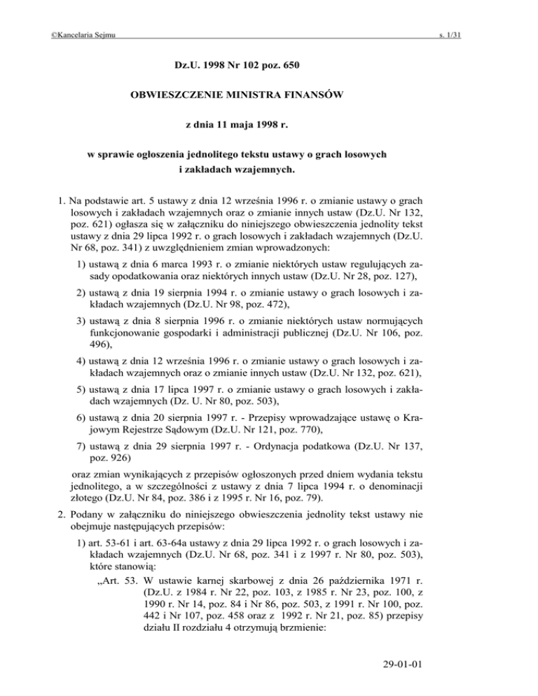 ©Kancelaria Sejmu s. 1/31 Dz.U. 1998 Nr 102 poz. 650 OBWIESZCZENIE MINISTRA FINANSÓW z dnia 11 maja 1998 r. w sprawie ogłoszenia jednolitego tekstu ustawy o grach losowych i zakładach wzajemnych. 1. Na podstawie art. 5 ustawy z dnia 12 września 1996 r. o zmianie ustawy o grach losowych i zakładach wzajemnych oraz o zmianie innych ustaw (Dz.U. Nr 132, poz. 621) ogłasza się w załączniku do niniejszego obwieszczenia jednolity tekst ustawy z dnia 29 lipca 1992 r. o grach losowych i zakładach wzajemnych (Dz.U. Nr 68, poz. 341) z uwzględnieniem zmian wprowadzonych: 1) ustawą z dnia 6 marca 1993 r. o zmianie niektórych ustaw regulujących zasady opodatkowania oraz niektórych innych ustaw (Dz.U. Nr 28, poz. 127), 2) ustawą z dnia 19 sierpnia 1994 r. o zmianie ustawy o grach losowych i zakładach wzajemnych (Dz.U. Nr 98, poz. 472), 3) ustawą z dnia 8 sierpnia 1996 r. o zmianie niektórych ustaw normujących funkcjonowanie gospodarki i administracji publicznej (Dz.U. Nr 106, poz. 496), 4) ustawą z dnia 12 września 1996 r. o zmianie ustawy o grach losowych i zakładach wzajemnych oraz o zmianie innych ustaw (Dz.U. Nr 132, poz. 621), 5) ustawą z dnia 17 lipca 1997 r. o zmianie ustawy o grach losowych i zakładach wzajemnych (Dz. U. Nr 80, poz. 503), 6) ustawą z dnia 20 sierpnia 1997 r. - Przepisy wprowadzające ustawę o Krajowym Rejestrze Sądowym (Dz.U. Nr 121, poz. 770), 7) ustawą z dnia 29 sierpnia 1997 r. - Ordynacja podatkowa (Dz.U. Nr 137, poz. 926) oraz zmian wynikających z przepisów ogłoszonych przed dniem wydania tekstu jednolitego, a w szczególności z ustawy z dnia 7 lipca 1994 r. o denominacji złotego (Dz.U. Nr 84, poz. 386 i z 1995 r. Nr 16, poz. 79). 2. Podany w załączniku do niniejszego obwieszczenia jednolity tekst ustawy nie obejmuje następujących przepisów: 1) art. 53-61 i art. 63-64a ustawy z dnia 29 lipca 1992 r. o grach losowych i zakładach wzajemnych (Dz.U. Nr 68, poz. 341 i z 1997 r. Nr 80, poz. 503), które stanowią: „Art. 53. W ustawie karnej skarbowej z dnia 26 października 1971 r. (Dz.U. z 1984 r. Nr 22, poz. 103, z 1985 r. Nr 23, poz. 100, z 1990 r. Nr 14, poz. 84 i Nr 86, poz. 503, z 1991 r. Nr 100, poz. 442 i Nr 107, poz. 458 oraz z 1992 r. Nr 21, poz. 85) przepisy działu II rozdziału 4 otrzymują brzmienie: 29-01-01 ©Kancelaria Sejmu s. 2/31 „Rozdział 4 Przestępstwa w zakresie gier losowych i zakładów wzajemnych Art. 117. § 1. Kto prowadzi działalność w zakresie gier losowych lub zakładów wzajemnych bez wymaganego zezwolenia lub w działalności takiej pośredniczy - podlega karze pozbawienia wolności do lat 3 lub grzywny do 1.500.000.000 zł albo obu tym karom łącznie. § 2. W wypadku określonym w § 1 podlegają przepadkowi stanowiące przedmiot przestępstwa skarbowego dokumenty i urządzenia gry losowej lub zakładu wzajemnego oraz wygrane, które na podstawie tych dokumentów przypadają grającym, a także pieniądze uzyskane ze sprzedaży udziału w grze i wpłaconych stawek. Art. 118. Kto urządza bez wymaganego zezwolenia loterię fantową lub grę bingo fantowe, podlega karze grzywny do 100.000.000 złotych. Art. 119. § 1. Kto uczestniczy w grach losowych i zakładach wzajemnych urządzanych bez wymaganego zezwolenia, podlega karze grzywny do 50.000.000 złotych. § 2. Art. 117 § 2 stosuje się odpowiednio. Art. 120. Kto urządza grę losową lub zakład wzajemny niezgodnie z przepisami o grach losowych i zakładach wzajemnych lub z regulaminem gry lub zakładu wzajemnego, podlega karze grzywny do 500.000.000 złotych. Art. 121. Kto nie będąc do tego uprawniony z chęci osiągnięcia korzyści majątkowej trudni się sprzedażą losów lub innych dowodów udziału w grze losowej lub zakładzie wzajemnym, podlega karze ograniczenia wolności lub grzywny do 20.000.000 złotych albo obu tym karom łącznie”. Art. 54. W ustawie z dnia 15 lutego 1992 r. o podatku dochodowym od osób prawnych oraz o zmianie niektórych ustaw regulujących zasady opodatkowania (Dz.U. Nr 21, poz. 86 i Nr 40, poz. 174) w art. 17 w ust. 1 dodaje się pkt 16 w brzmieniu: „16) dochody z tytułu prowadzenia loterii fantowych i gry bingo fantowe na podstawie zezwolenia wydanego na mocy odrębnych przepisów.” Art. 55. W ustawie z dnia 26 lipca 1991 r. o podatku dochodowym od osób fizycznych (Dz.U. Nr 80, poz. 350 i Nr 100, poz. 442 oraz z 1992 r. Nr 21, poz. 86) w art. 21 w ust. 1 wprowadza się następujące zmiany: 1) pkt 6 otrzymuje brzmienie: „6) wygrane w grach losowych i zakładach wzajemnych urządzanych przez uprawniony podmiot,” 29-01-01 ©Kancelaria Sejmu s. 3/31 2) w pkt 36 na końcu kropkę zastępuje się przecinkiem i dodaje pkt 37 w brzmieniu: „37) dochody z tytułu urządzania loterii fantowych i gry bingo fantowe na podstawie zezwolenia wydanego na mocy odrębnych przepisów.” Art. 56. W ustawie z dnia 29 grudnia 1982 r. o urzędzie Ministra Finansów oraz urzędach i izbach skarbowych (Dz.U. Nr 45, poz. 289, z 1985 r. Nr 12, poz. 50, z 1987 r. Nr 3, poz. 18 i Nr 33, poz. 180, z 1988 r. Nr 16, poz. 112 i Nr 19, poz. 132, z 1990 r. Nr 14, poz. 88 oraz z 1991 r. Nr 94, poz. 421 i Nr 100, poz. 442) w art. 2 pkt 17 otrzymuje brzmienie: „17) sprawowanie nadzoru i kontroli nad działalnością podmiotów urządzających i prowadzących gry losowe i zakłady wzajemne,”. Art. 57. 1. Zezwolenia udzielone na podstawie ustawy z dnia 20 maja 1976 r. o grach losowych i totalizatorach (Dz.U. Nr 19, poz. 122 i z 1982 r. Nr 7, poz. 54) wygasają w terminach określonych w ust. 2, z tym że do warunków urządzania i zasad prowadzenia działalności określonej w tych zezwoleniach stosuje się przepisy niniejszej ustawy. 2. Zezwolenia, o których mowa w ust. 1, wygasają: 1) zezwolenia udzielone spółkom z udziałem zagranicznym - z dniem wejścia w życie ustawy, 2) zezwolenia udzielone spółkom z wyłącznym udziałem osób krajowych - w terminie 12 miesięcy licząc od dnia wejścia w życie ustawy, 3) zez