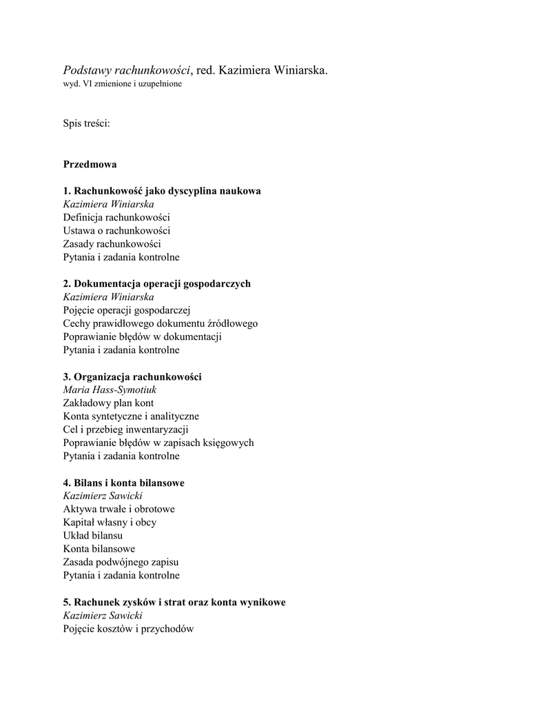 Podstawy rachunkowości, red. Kazimiera Winiarska. wyd. VI zmienione i uzupełnione Spis treści: Przedmowa 1. Rachunkowość jako dyscyplina naukowa Kazimiera Winiarska Definicja rachunkowości Ustawa o rachunkowości Zasady rachunkowości Pytania i zadania kontrolne 2. Dokumentacja operacji gospodarczych Kazimiera Winiarska Pojęcie operacji gospodarczej Cechy prawidłowego dokumentu źródłowego Poprawianie błędów w dokumentacji Pytania i zadania kontrolne 3. Organizacja rachunkowości Maria Hass-Symotiuk Zakładowy plan kont Konta syntetyczne i analityczne Cel i przebieg inwentaryzacji Poprawianie błędów w zapisach księgowych Pytania i zadania kontrolne 4. Bilans i konta bilansowe Kazimierz Sawicki Aktywa trwałe i obrotowe Kapitał własny i obcy Układ bilansu Konta bilansowe Zasada podwójnego zapisu Pytania i zadania kontrolne 5. Rachunek zysków i strat oraz konta wynikowe Kazimierz Sawicki Pojęcie kosztów i przychodów Konta wynikowe Ewidencja kosztów i przychodów Warianty ustalania wyniku finansowego Pytania i zadania kontrolne 6. Księgi rachunkowe Maria Hass-Symotiuk Pojęcie ksiąg rachunkowych Zasady prowadzenia ksiąg Techniki prowadzenia ksiąg Pytania i zadania kontrolne 7. Środki pieniężne Waldemar Gos Środki pieniężne w kasie i na rachunkach bankowych Inne środki pieniężne Pytania i zadania kontrolne 8. Rozrachunki Waldemar Gos Należności krótkoterminowe i długoterminowe Zobowiązania krótkoterminowe i długoterminowe Ewidencja rozrachunków Pytania i zadania kontrolne 9. Materiały Tomasz Kufel Pojęcie materiałów Ewidencja zakupu materiałów. Ewidencja zużycia materiałów Pytania i zadania kontrolne 10. Towary Anna Zbaraszewska Pojęcie towarów Warianty wyceny towarów Ewidencja towarów w hurcie Ewidencja towarów w detalu Pytania i zadania kontrolne 11. Rzeczowe aktywa trwałe oraz wartości niematerialne i prawne Ksenia Czubakowska Środki trwałe Środki trwałe w budowie Wartości niematerialne i prawne Pytania i zadania kontrolne 12. Inwestycje Anna Buczkowska Pojęcie inwestycji Inwestycje długoterminowe Inwestycje krótkoterminowe Pytania i zadania kontrolne 13. Rachunek kosztów Teresa Kiziukiewicz Rozliczenia międzyokresowe kosztów Fazy rozliczania kosztów Metody kalkulacji Pytania i zadania kontrolne 14. Produkty pracy Anna Buczkowska Produkty gotowe i półfabrykaty Usługi wykonane Ewidencja produktów pracy Pytania i zadania kontrolne 15. Kapitały własne, rezerwy i fundusze specjalne Ksenia Czubakowska Kapitały własne Rezerwy na zobowiązania Fundusze specjalne Rozliczenia międzyokresowe przychodów Podział wyniku finansowego Pytania i zadania kontrolne 16. Sprawozdawczość finansowa Teresa Kiziukiewicz Zasady sporządzania sprawozdania finansowego Podstawowe sprawozdania finansowe Badanie i zatwierdzanie sprawozdań finansowych Pytania i zadania kontrolne Literatura Spis ilustracji Spis tabel Indeks