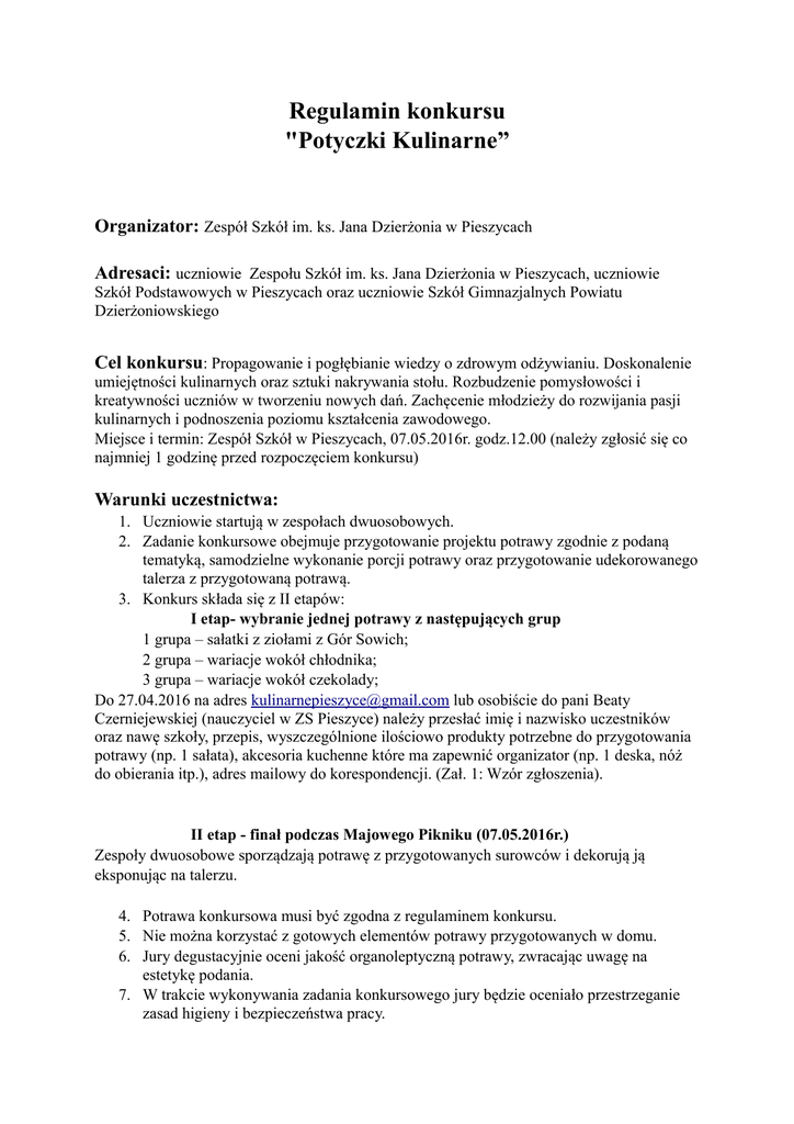 Regulamin konkursu "Potyczki Kulinarne” Organizator: Zespół Szkół im. ks. Jana Dzierżonia w Pieszycach Adresaci: uczniowie Zespołu Szkół im. ks. Jana Dzierżonia w Pieszycach, uczniowie Szkół Podstawowych w Pieszycach oraz uczniowie Szkół Gimnazjalnych Powiatu Dzierżoniowskiego Cel konkursu: Propagowanie i pogłębianie wiedzy o zdrowym odżywianiu. Doskonalenie umiejętności kulinarnych oraz sztuki nakrywania stołu. Rozbudzenie pomysłowości i kreatywności uczniów w tworzeniu nowych dań. Zachęcenie młodzieży do rozwijania pasji kulinarnych i podnoszenia poziomu kształcenia zawodowego. Miejsce i termin: Zespół Szkół w Pieszycach, 07.05.2016r. godz.12.00 (należy zgłosić się co najmniej 1 godzinę przed rozpoczęciem konkursu) Warunki uczestnictwa: 1. Uczniowie startują w zespołach dwuosobowych. 2. Zadanie konkursowe obejmuje przygotowanie projektu potrawy zgodnie z podaną tematyką, samodzielne wykonanie porcji potrawy oraz przygotowanie udekorowanego talerza z przygotowaną potrawą. 3. Konkurs składa się z II etapów: I etap- wybranie jednej potrawy z następujących grup 1 grupa – sałatki z ziołami z Gór Sowich; 2 grupa – wariacje wokół chłodnika; 3 grupa – wariacje wokół czekolady; Do 27.04.2016 na adres [email protected] lub osobiście do pani Beaty Czerniejewskiej (nauczyciel w ZS Pieszyce) należy przesłać imię i nazwisko uczestników oraz nawę szkoły, przepis, wyszczególnione ilościowo produkty potrzebne do przygotowania potrawy (np. 1 sałata), akcesoria kuchenne które ma zapewnić organizator (np. 1 deska, nóż do obierania itp.), adres mailowy do korespondencji. (Zał. 1: Wzór zgłoszenia). II etap - finał podczas Majowego Pikniku (07.05.2016r.) Zespoły dwuosobowe sporządzają potrawę z przygotowanych surowców i dekorują ją eksponując na talerzu. 4. Potrawa konkursowa musi być zgodna z regulaminem konkursu. 5. Nie można korzystać z gotowych elementów potrawy przygotowanych w domu. 6. Jury degustacyjnie oceni jakość organoleptyczną potrawy, zwracając uwagę na estetykę podania. 7. W trakcie wykonywania zadania konkursowego jury będzie oceniało przestrzeganie zasad higieny i bezpieczeństwa pracy. 8. Surowce podstawowe , przyprawy, folie aluminiowe, spożywcze i ręczniki jednorazowe zapewnia szkoła 9. Uczniowie są zobowiązani do posiadania odzieży ochronnej (fartuch, nakrycie głowy, rękawiczki) oraz związania włosów 10. . Od godziny 9.00 w dniu konkursu tj. 07.05.2016 dla uczestników konkursu będzie udostępniona szkolna kuchnia w celu wstępnego przygotowania półproduktów (np. podsmażenie mięsa lub usmażenie naleśników itp.) 11. Czas wykonania potrawy konkursowej nie może przekroczyć 60 minut dla II etapu – finału konkursu. Przekroczenie czasu skutkuje punktami karnymi (5 punktów karnych za każde 10 minut). W uzasadnionych przypadkach jury może przedłużyć czas wykonania potrawy 12. Zastawę stołową oraz wszelkie dekoracje stołu uczniowie organizują we własnym zakresie, 13. Za udział w konkursie każdy uczeń otrzymuje nagrodę a laureaci nagrody niespodzianki Gościem Honorowym w trakcie trwania konkursu będzie Pani Ewa Wachowicz Członkowie jury oceniają: a) Wygląd potrawy (0-5 punktów) b) Smak potrawy (0-5 punktów) c) Proces technologiczny ( 0-5 punktów) d) Znajomość zasad bhp i ich przestrzeganie (0-5 punktów) e) Podanie potrawy i dekorowanie stołu (0-10 punktów) Główny organizator: Beata Czerniejewska Zał.1 Zgłoszenie na konkurs Potyczki Kulinarne: 1. .Imię i Nazwisko uczestnika: 2. Nazwa szkoły: 3. Przepis: 4. Produkty potrzebne do przygotowania potrawy: 5. Niezbędne akcesoria kuchenne: 6. Adres mailowy do korespondencji: