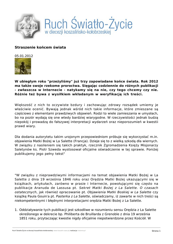 Straszenie końcem świata 05.01.2012 W ubiegłym roku "przeżyliśmy" już trzy zapowiadane końce świata. Rok 2012 ma także swoje rzekome proroctwa. Sięgając codziennie do różnych publikacji - zwłaszcza w Internecie - natykamy się na nie, czy tego chcemy czy nie. Różnie też bywa z wysiłkiem wkładanym w weryfikację ich treści. Większość z nich to oczywiste bzdury i zachowując zdrowy rozsądek umiemy je właściwie ocenić. Bywają jednak wśród nich takie informacje, które zmieszane są częściowo z elementami prawdziwych objawień. Rodzi to wiele zamieszania w umysłach, bo na pozór wydają się one wtedy bardziej wiarygodne. W rzeczywistości jednak budzą niepokój i prowadzą do fałszywej interpretacji wydarzeń oraz nieporozumień w kwestii prawd wiary. Dla dodania autorytetu takim urojonym przepowiedniom próbuje się wykorzystać m.in. objawienia Matki Bożej w La Salette (Francja). Dzieje się to z wielką szkodą dla wiernych. W związku z nasileniem się takich praktyk, rzecznik Zgromadzenia Księży Misjonarzy Saletynów ks. Piotr Szweda wystosował oficjalne oświadczenie w tej sprawie. Poniżej publikujemy jego pełny tekst" "W związku z nieprawdziwymi informacjami na temat objawienia Matki Bożej w La Salette z dnia 19 września 1846 roku oraz Orędzia Matki Bożej ukazującymi się w książkach, artykułach, zarówno w prasie i Internecie, powołującymi się często na publikacje Aranuda de Lassusa pt. Sekret Matki Bożej z La Salette. O czasach ostatecznych, jak również opracowanie pt. Objawienia Matki Boskiej w La Salette czy książkę Paula Gouin’a pt. Pasterka z La Salette, oświadczamy, iż zawarte w nich treści są niekompetentnymi i błędnymi interpretacjami orędzia Matki Bożej z La Salette. 1. Oddziaływanie tych publikacji jest szkodliwe w rozumieniu sensu Orędzia z La Salette określonego w dekrecie bp. Philiberta de Bruillarda z Grenoble z dnia 19 września 1851 roku, przytaczając kwestie nigdy oficjalnie niepotwierdzone przez Kościół. W Ruch Światło-Życie w diecezji koszalińsko-kołobrzeskiej: www.koszalin.oaza.pl; realizacja: kokoma.pl Strona 1 sposób szczególny dotyczy to sprawy treści tajemnicy saletyńskiej jaką otrzymała Melania Calvat. Późniejsze jej pisma i opublikowana treść tzw. tajemnicy saletyńskiej w żadnej swej części nie stanowią Orędzia Matki Bożej z La Salette. Interpretują je jedynie w sposób sensacyjny, synkretyczny, rzucający perspektywę niemającą nic wspólnego z Orędziem Matki Bożej. Ośrodkami generującymi tego typu interpretacje jest grupa melanistów (nazwa powstała od imienia Melanii Calvat) działająca także w Polsce. 2. Na polskim rynku księgarskim można znaleźć wiele merytorycznych, zgodnych z nauką Kościoła, opracowań dotyczących objawienia Matki Bożej w La Salette. Również dzięki działającemu Wydawnictwu La Salette polski czytelnik może nabyć rzetelne i wyczerpujące publikacje na temat La Salette m.in.: La Salette, opis zjawienia i sens Orędzia; J. Jaouen MS, La Salette – dar Chrystusa dla Kościoła; J. Stern MS, Maksymin i Melania – pasterze z La Salette; E. Ritz MS, Orędzie Maryi z La Salette czy też filmy DVD jak np.: Tajemnica La Salette. 3. Należy w tym miejscu przypomnieć Nauczanie Soboru Watykańskiego II i Listu Apostolskiego Marialis cultus, papieża Pawła VI w nr 74: żeby w kulcie maryjnym unikano niepotrzebnej łatwowierności (Lumen Gentium, 67); należy eliminować wszystko, co jest wyraźnie fałszywe, albo legendarne (Marialis cultus, 38). 4. Depozytariuszami i wyznaczonymi przez Kościół stróżami autentycznej interpretacji objawienia Matki Bożej w La Salette jest powstałe na prawie papieskim Zgromadzenie Księży Misjonarzy Saletynów, a także Zgromadzenie Sióstr Matki Bożej z La Salette". Ruch Światło-Życie w diecezji koszalińsko-kołobrzeskiej: www.koszalin.oaza.pl; realizacja: kokoma.pl Strona 2