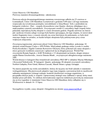 Unior Mazovia 12H Marathon Pierwszy maraton dwunastogodzinny zakończony Pierwsza edycja dwunastogodzinnego maratonu rowerowego odbyła się 23 czerwca w Łomiankach. Unior 12H Marathon wystartował o godzinie 9.00 rano i od tego momentu rozpoczęła się rywalizacja pomiędzy zawodnikami w klasyfikacji Solo z podziałem na kategorie wiekowe , Duo – zespoły dwuosobowe oraz Quarto- drużyny składające się z maksymalnie czterech zawodników. Zwycięzcami zostali Ci zawodnicy bądź zespoły które pokonały największą liczbę okrążeń w czasie dwunastu godzin. Pogoda zarówno na starcie jak i podczas trwania całego wyścigu była bardzo sprzyjająca, do tego stopnia, że nawet dość mokre fragmenty trasy z czasem stawały się coraz łatwiejsze do pokonania, co było dość znaczące mając na uwadze, ze każde kolejne okrążenia były pokonywane przy coraz większym zmęczeniu. Zwycięzcą tegorocznej pierwszej edycji Unior Mazovia 12H Marathon pokonując 18 okrążeń został Kacper Cacko z APS Polska. Miał jednak godnego siebie rywala w osobie Piotra Kozdryka ( Algida Centrum Rowerowe Olsztyn), który pokonał tyle samo okrążeń z nieco gorszym wynikiem czasowym i uplasował się na drugiej pozycji. Wśród Pań zwyciężyła Renata Supryk z AGR Welodrom z 15 okrążeniami na koncie, drugie miejsce zajęła Hanna Grochowska , trzecie Danuta Blank , zwyciężczyni ubiegłorocznego maratonu 24H. Wśród drużyn w kategorii Duo triumfowali zawodnicy PKO BP w składzie Maciej Mikołajun i Krzysztof Sobolewski. W kategorii Quarto pokonując 20 okrążeń zwyciężyli zawodnicy Norbert Gałązka, Piotr Góral, Bartosz Łuczak, Marek Stram z grupy Gerappa. Na starcie pojawiło się wielu zawodników, którzy do tej pory nie brali udziału w maratonie wielogodzinnym. Dla pierwszych adeptów tego typu ścigania z pewnością była to możliwość nabrania umiejętności różnego rodzaju: kontroli możliwości swojego organizmu, w przypadku drużyn jazdy w zespole i opracowanej strategii oraz zadbania o sprzęt, który musi działać przez pół doby. Te zdobyte doświadczenie zapewne niektórym pozwolą na zmierzenie się za trzy tygodnie w maratonie Unior Mazovia 24H Marathon, który odbędzie się w Wieliszewie w dniach 14- 15 lipca. Szczegółowe wyniki, czasy okrążeń i fotogaleria na stronie www.mazovia24h.pl