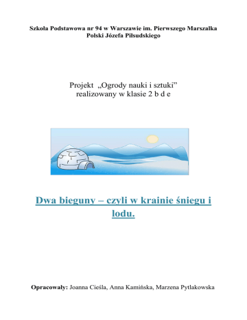 Szkoła Podstawowa nr 94 w Warszawie im. Pierwszego Marszalka Polski Józefa Piłsudskiego Projekt „Ogrody nauki i sztuki” realizowany w klasie 2 b d e Dwa bieguny – czyli w krainie śniegu i lodu. Opracowały: Joanna Cieśla, Anna Kamińska, Marzena Pytlakowska Założenia realizacji projektu: Celem niniejszego projektu jest poszerzenie i wzbogacenie treści programowych o zagadnienia z zakresu edukacji społecznej, a także wspieranie oraz krzewienie wiedzy z zakresu edukacji przyrodniczej (podstawa programowa 5/6). Tytuł projektu stanowi jeden z głównych punktów rocznego planu pracy klas II b, II d oraz IIe w Szkole Podstawowej nr 94 im. I Marszałka Polski Józefa Piłsudskiego na bieżący rok szkolny i jest zgodny z obowiązującą podstawą programową z dnia 30 maja 2014r. Wprowadzenie: Dziecko już od najmłodszych lat lubi przebywać w otoczeniu przyrody. Świat przyrody jest dla niego czymś bardzo bliskim, to w nim czuje się ono dobrze i bezpiecznie. Edukacja przyrodnicza to także elementy wychowania zdrowotnego, zasady bezpieczeństwa i rozwój kompetencji społecznych. Środowisko przyrodnicze pobudza naturalną ciekawość dziecka, jego aktywność i chęć doświadczania. Edukacja przyrodnicza uczy dzieci zachwycać się światem, by rozwijać gotowość do poznawania go, odkrywania, jaki jest. Ta umiejętność odkrywania świata, formułowania zasad rządzących w tym świecie może prowadzić do kształtowania umiejętności życia w nim. To, co dla nas dorosłych jest codziennością i oczywistością, dla małego dziecka jest nowe, pożądane, budzi ciekawość i zachwyt. Dotyczy to zarówno świata fizycznego, jak i świata społecznego. Dziecko codziennie odkrywa coraz więcej tajemnic, dlatego my dorośli powinniśmy tę naturalną ciekawość świata rozbudzać i pozwalać ją zaspokajać. Zainteresowanie naszych wychowanków otaczających ich światem widać niemalże na każdym kroku. Próby poszukiwania przez nich odpowiedzi na nurtujące ich pytania: „Dlaczego na biegunie jest tak zimno?”, „Czy Eskimosi rzeczywiście witają się pocierając się nosami?” i wiele innych skłoniły nas do podjęcia pracy nad takowym tematem projektu. Niniejszy projekt ma na celu wykształcenie u naszych wychowanków wrażliwości na piękno oraz bogactwo przyrody, a także wspierać ich wszechstronny rozwój. Przyrodę można nazwać sprzymierzeńcem w wychowaniu dziecka, gdyż wychodzi naprzeciw nieomal wszystkim jego potrzebom, sprzyja harmonijnemu rozwojowi, dostarcza głębokich przeżyć i budzi zainteresowanie wszystkim, co się porusza, żyje, zmienia. Istotnym celem projektu jest również kształtowanie u dzieci hartu ducha, wyrabianie silnej woli i wytrwałości w dążeniu do celu. Realizacja projektu: Cele ogólne poznanie warunków atmosferycznych , fauny i flory oraz działalności człowieka na Antarktydzie i Arktyce, aktywizowanie mowy i myślenia dzieci, rozwijanie ekspresji plastycznej, ruchowej i werbalnej dzieci, kształtowanie umiejętności pracy zespołowej. Cele szczegółowe Dziecko : określa położenie bieguna północnego i południowego na globusie, zna położenie na kuli ziemskiej Antarktydy i Arktyki, rozpoznaje i nazywa kilka gatunków zwierząt żyjących na biegunach, potrafi odczytać i zaznaczyć temperaturę powietrza na termometrze, poznaje słownictwo związane z fauną i florą kół podbiegunowych. Formy pracy: praca grupowa Metody pracy: warsztatowe pogadanki objaśnianie pokaz ćwiczenia praktyczne Termin realizacji projektu: Rok szkolny 2015/2016 Realizacja zadań: Lp. 1. Zadanie Zapoznanie z biegunem północnym - Arktyką Sposób realizacji Poznanie cech charakterystycznych, fauny i flory, warunków klimatycznych rejonu. Termin realizacji W ciągu roku. Poznanie życia Eskimosów dawniej i dziś: Praca z fragmentami lektury Cz. Centkiewicza „Anaruk – chłopiec z Grenlandii”. Udział w lekcji muzealnej – Muzeum Etnograficzne „Sztuka przetrwania – życie Eskimosów dawniej i dziś". Udział w lekcji muzealnej w Muzeum Łowiectwa i Jeździectwa – „Środowisko a wygląd zwierząt”. Wykonywanie przez dzieci prac plastycznych. 2. Zapoznanie z biegunem Praca z lekturą „Zaczarowana zagroda” południowym - Antarktydą Cz. i A. Centkiewiczów. Poznanie cech charakterystycznych, fauny i flory, warunków klimatycznych rejonu. Poznanie polskiej działalności naukowej i podróżniczej na biegunach. W ciągu roku. 3. Poznanie układu słonecznego, biegunów magnetycznych oraz zjawisk związanych ze światłem słonecznym. Warsztaty „Małe Mądrale”: poznanie właściwości śniegu, bieguny magnetyczne. Styczeń – marzec 2016 Udział w seansie mobilnego planetarium „ Nasze niebo”: poznanie i obserwowanie pozornej wędrówki Słońca po niebie, poznanie gwiazdozbiorów okołobiegunowych, „oglądanie nieba” z okolic biegunów północnego i południowego, poznanie zjawiska zorzy polarnej, zapoznanie z informacjami czym jest dzień i noc polarna. Warsztaty „Układ Słoneczny” Wykonywanie przez dzieci prac plastycznych. 4. Podsumowanie pracy nad projektem. Wyeksponowanie zgromadzonych prac. W ciągu całego roku. maj 2016 Efektem pracy nad projektem ma być zdobycie i poszerzenie wiedzy uczniów na temat świata przyrody biegunów południowego i północnego, a także prezentacja wytworów pracy uczniów podczas Gali Projektów Ogrody Nauki i Sztuki.