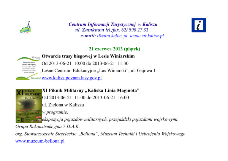 Centrum Informacji Turystycznej w Kaliszu ul. Zamkowa tel./fax. 62/ 598 27 31 e-mail: [email protected] www.cit.kalisz.pl 21 czerwca 2013 (piątek) Otwarcie trasy biegowej w Lesie Winiarskim Od 2013-06-21 10:00 do 2013-06-21 11:30 Leśne Centrum Edukacyjne „Las Winiarski”, ul. Gajowa 1 www.kalisz.poznan.lasy.gov.pl XI Piknik Militarny „Kaliska Linia Maginota” Od 2013-06-21 11:00 do 2013-06-21 16:00 ul. Zielona w Kaliszu w programie: ekspozycja pojazdów militarnych, przejażdżki pojazdami wojskowymi, Grupa Rekonstrukcyjna 7 D.A.K. org. Stowarzyszenie Strzeleckie „Bellona”, Muzeum Techniki i Uzbrojenia Wojskowego www.muzeum-bellona.pl Zawody Pływackie UKS 9 OSRiR Kalisz Od 2013-06-21 15:00 do 2013-06-21 18:45 Kryta Pływalnia OSRiR, ul. Łódzka 29 org. UKS 9 OSRiR Kalisz www.uks9kalisz.pl Spektakl: „Mayday” Od 2013-06-21 19:00 do 2013-06-21 21:00 Duża Scena Teatru im. W. Bogusławskiego, Plac W. Bogusławskiego 1 reż: Igor Michalski w rolach głównych: Zbigniew Antoniewicz, Szymon Mysłakowski, Agnieszka Dulęba- Kasza Bilety w cenie:39 PLN (N-), 29 PLN (U-) www.teatr.kalisz.pl VII Festiwal Muzyczny Południowej Wielkopolski Koncert Inauguracyjny Zakończenie sezonu artystycznego 2012/2013 Od 2013-06-21 19:30 do 2013-06-21 21:00 Sala Koncertowa Filharmonii Kaliskiej Aula im. Prof. Jerzego Rubińskiego WPA-UAM, ul. Nowy Świat 28-30 program i wykonawcy: W. A. Mozart- Uwertura do opery „Wesele Figara” A. Vivaldi- Koncert na czworo skrzypiec h-moll op. 3 nr 10 RV 58 (Jakub Śmigielski, Kamila Gryska, Izabela Garyantesiewicz, Paweł Kulczycki, Andrzej H. Bączyk- basso continuo) W. A. Mozart- Symfonia koncertująca na skrzypce i altówkę Es-dur KV 364 (Dorian Pawełczak- skrzypce, Monika Mazur- altówka) E. Chausson- Poemat na skrzypce i orkiestrę Es-dur op. 25 (Jacek Fabiniak- skrzypce) Orkiestra Symfoniczna Filharmonii Kaliskiej Adam Klocek- dyrygent Wstęp wolny www.filharmoniakaliska.pl Koncert: Kubiszew „Rachunek jest prosty” Od 2013-06-21 20:00 do 2013-06-21 22:00 Klub Studencki „Pod Muzami”, al. Wolności 27 Bilety w cenie: 10 PLN (przedsprzedaż), 15 PLN (w dniu koncertu) www.ambernight.pl Impreza: „Keep calm and listen to raggae” Od 2013-06-21 21:00 do 2013-06-22 04:00 Pub „BeKa”, ul. Piekarska 13 Wejście w cenie: 5 PLN www.pubbeka.pl 22 czerwca 2013 (sobota) Festyn Rodzinny „Zdrowo i kolorowo w 15-tce” oraz Biała Sobota Od 2013-06-22 11:00 do 2013-06-22 18:00 Zespół Szkolno- Przedszkolny nr 1, ul. Wykopaliskowa 45 www.sp15kalisz.edupage.org Wielka Wymiana Książek Od 2013-06-22 11:00 do 2013-06-22 13:00 Cafe.Calisia.pl, al. Wolności 6 org. Stowarzyszenie „Kalisz Literacki”, Kaliska Inicjatywa Miejska www.kaliskainicjatywamiejska.pl XI Piknik Militarny „Kaliska Linia Maginota” Od 2013-06-22 11:00 do 2013-06-22 16:00 ul. Zielona w Kaliszu w programie: ekspozycja pojazdów militarnych, przejażdżki pojazdami wojskowymi, Grupa Rekonstrukcyjna 7 D.A.K. org. Stowarzyszenie Strzeleckie „Bellona”, Muzeum Techniki i Uzbrojenia Wojskowego www.muzeum-bellona.pl Zawody Pływackie UKS 9 OSRiR Kalisz Od 2013-06-22 12:00 do 2013-06-22 16:00 Kryta Pływalnia OSRiR, ul. Łódzka 29 org. UKS 9 OSRiR Kalisz www.uks9kalisz.pl „Wybierz Kalisz na weekend” Zwiedzanie miasta zabytkowym autobusem San H100B Od 2013-06-22 12:00 do do 2013-06-22 17:30 Plac W. Bogusławskiego (przed Teatrem im. W. Bogusławskiego) Autobus będzie odjeżdżał o godz. 12.00, 14.00, 16.00 (trasa tematyczna) Trasa przejazdu: Pl. W. Bogusławskiego- Zawodzie- Nowy Świat-Rogatka- Śródmiejska- Główny RynekKanonicka- Parczewskiego- Pl. Jana Pawła II- Pl. Św. Józefa-Kolegialna-Sukiennicza-al. WolnościPl. W. Bogusławskiego Kursy odbywać się będą z przewodnikami PTTK , kurs trwać będzie około 1 - 1,5 h. Przewodnicy będą sprzedawać karty - bilety w cenie 3 zł (normalny) i 2 zł (ulgowy) Kursy współfinansuje Biuro ds. Promocji i Współpracy Międzynarodowej UM w Kaliszu www.pttk.kalisz.pl, www.cit.kalisz.pl, www.kalisz.pl „Wybierz Kalisz na weekend” Zwiedzanie Wieży Ratuszowej Od 2013-06-22 13:00 do 2013-06-22 17:00 Ratusz, Główny Rynek 20 Wejścia o pełnych godzinach: 13.00, 14.00, 15.00, 16.00 i 17.00 Wstęp: 3 zł (normalne), 2 zł (ulgowe) www.pttk.kalisz.pl , www.cit.kalisz.pl , www.kalisz.pl XX Wielkopolskie Spotkania Chóralne „Carmen Sacrum Festival” Od 2013-06-22 14:00 do 2013-06-22 19:30 Sanktuarium św. Józefa, Plac św. Józefa 7 Aula WPA-UAM, ul. Nowy Świat 28-30 wykonawcy: godz: 14:00- Chór Chłopięco-Męski Bazyliki Kaliskiej pod dyrekcją Marka Łakomego, Chór „Kopernik” III LO pod dyrekcją Henryki Iglewskiej-Mocek, Chór Mieszany PSM II st im. H. Melcera pod dyrekcją Marii Pawelec (Sanktuarium św. Józefa) godz: 18:00- Chór Chłopięcy i Męski Filharmonii Poznańskiej „Poznańskie Słowiki” pod dyrekcją Macieja Wielocha (Aula WPA-UAM w Kaliszu) www.chorbazyliki.kalisz.pl Ogólnopolska Noc Profilaktyki „Profilaktyka a Ty” pod Honorowym Patronatem Prezydenta Miasta Kaliszadr inż. Janusza Pęcherza Od 2013-06-22 15:45 do 2013-06-22 20:00 Gimnazjum nr 3 im. Polskich Noblistów, ul. Teatralna 3 org. Komenda Miejska Policji w Kaliszu, Gimnazjum nr 3 im. Polskich Noblistów w Kaliszu www.pat.policja.gov.pl IV Liga- Mecz Piłki Nożnej KKS Włókniarz 1925 Kalisz- KS Opatówek Od 2013-06-22 17:00 do 2013-06-22 19:00 Stadion Miejski, Wał Matejki 2 org. KKS Włókniarz 1925 Kalisz www.kkskalisz.pl Koncert Specjalny: „Muzyczne Graffiti” Zakończenie Roku Kulturalnego Sekcji Artystycznych CKiS w Kaliszu Od 2013-06-22 18:00 do 2013-06-22 20:00 Sala Widowiskowa Centrum Kultury i Sztuki, ul. Łazienna 6 wystąpią: Studio Tańca „Next”, gościnnie: „Sieraszewski Dance Studio”, „Interdance” Wstęp wolny www.ckis.kalisz.pl Spektakl: „Mayday” Od 2013-06-22 19:00 do 2013-06-22 21:00 Duża Scena Teatru im. W. Bogusławskiego, Plac W. Bogusławskiego 1 w rolach głównych: Zbigniew Antoniewicz,
