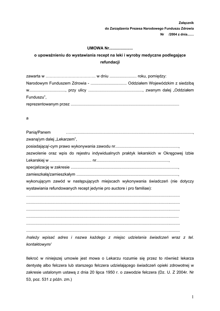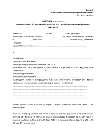 Załącznik do Zarządzenia Prezesa Narodowego Funduszu Zdrowia Nr /2004 z dnia....... UMOWA Nr..................... o upoważnieniu do wystawiania recept na leki i wyroby medyczne podlegające refundacji zawarta w ………………………………. w dniu ........................ roku, pomiędzy: Narodowym Funduszem Zdrowia - ................................ Oddziałem Wojewódzkim z siedzibą w................................, przy ulicy ................................................, zwanym dalej „Oddziałem Funduszu”, reprezentowanym przez ................................................................................................ a Panią/Panem ……........................................................................................................., zwaną/ym dalej „Lekarzem”, posiadającą/-cym prawo wykonywania zawodu nr........................................................, zezwolenie oraz wpis do rejestru indywidualnych praktyk lekarskich w Okręgowej Izbie Lekarskiej w ..................................... nr................................................................, specjalizację w zakresie ..............................................................................................., zamieszkałą/zamieszkałym .........................................................................................., wykonującym zawód w następujących miejscach wykonywania świadczeń (nie dotyczy wystawiania refundowanych recept jedynie pro auctore i pro familiae): ........................................................................................................................................ ........................................................................................................................................ ........................................................................................................................................ ....................................................................................................................................... ........................................................................................................................................ ........................................................................................................................................ /należy wpisać adres i nazwa każdego z miejsc udzielania świadczeń wraz z tel. kontaktowym/ Ilekroć w niniejszej umowie jest mowa o Lekarzu rozumie się przez to również lekarza dentystę albo felczera lub starszego felczera udzielającego świadczeń opieki zdrowotnej w zakresie ustalonym ustawą z dnia 20 lipca 1950 r. o zawodzie felczera (Dz. U. Z 2004r. Nr 53, poz. 531 z późn. zm.) 1 Na podstawie art. 34 ust. 2 i 3 ustawy z dnia 27 sierpnia 2004r. o świadczeniach opieki zdrowotnej finansowanych ze środków publicznych (Dz. U. Nr 210, poz. 2135), zwanej dalej „ustawą”, strony postanawiają, co następuje. § 1. 1. Oddział Funduszu upoważnia Lekarza do wystawiania recept na refundowane przez Narodowy Fundusz Zdrowia leki i wyroby medyczne, na rzecz: 1) Lekarza; 2) ubezpieczonych członków rodziny Lekarza: a) współmałżonka, b) wstępnych i zstępnych w linii prostej; 3) świadczeniobiorców oraz osób uprawnionych do świadczeń opieki zdrowotnej na podstawie przepisów o koordynacji, objętych opieką Lekarza. 2. Opiekę, o której mowa w ust. 1 pkt 3, sprawuje Lekarz: a) prowadzący indywidualną/specjalistyczną praktykę lekarską: ............................................................................................................................. ............................................................................................................................. w ......................................................................................................................... ul. ....................................................................................................................... wpisaną do rejestru Rady Okręgowej Izby Lekarskiej pod nr.................................................................................................................., b) wykonujący świadczenia zdrowotne w zakładzie opieki zdrowotnej/poza zakładem ............................................................................................................................. ............................................................................................................................. w ......................................................................................................................... ul. ……............................................................................................................... . § 2. 1. Lekarz zobowiązany jest przepisywać leki i wyroby medyczne, kierując się indywidualną potrzebą leczenia chorego, zgodnie z aktualnym stanem wiedzy medycznej w sposób nie przekraczający granic koniecznej potrzeby, zgodnie z obowiązującymi w tym zakresie przepisami prawa. 2. Lekarz zobowiązany jest przepisywać leki zgodnie ze wskazaniami i dawkami, określonymi w zatwierdzonych, na podstawie ustawy - Prawo farmaceutyczne, Charakterystykach Produktów Leczniczych. 3. Lekarz zobowiązany jest przepisywać wyroby medyczne, zgodnie z przewidzianym zastosowaniem na podstawie ustawy o wyrobach medycznych. 2 § 3. Oddział Funduszu zobowiązany jest refundować recepty wystawiane przez Lekarza na rzecz osób, o których mowa w § 1, na zasadach określonych w ustawie, do wysokości limitu ceny określonego w odrębnych przepisach. § 4. 1. Lekarz zobowiązany jest wystawiać recepty zgodnie z zasadami określonymi w rozporządzeniu Ministra Zdrowia z dnia 28 września 2004r. w sprawie recept lekarskich (Dz. U Nr 213, poz. 2164) 2. Lekarz przepisuje leki i wyroby medyczne na przeznaczonych do tego celu receptach uprawniających do ich nabycia bezpłatnie, za opłata ryczałtową lub czę