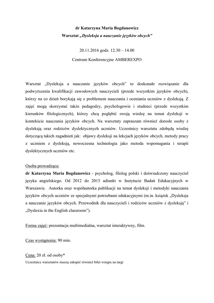 dr Katarzyna Maria Bogdanowicz Warsztat „Dysleksja a nauczanie języków obcych” 20.11.2016 godz. 12.30 – 14.00 Centrum Konferencyjne AMBEREXPO Warsztat „Dysleksja a nauczanie języków obcych” to doskonałe rozwiązanie dla podwyższenia kwalifikacji zawodowych nauczycieli (przede wszystkim języków obcych), którzy na co dzień borykają się z problemem nauczania i oceniania uczniów z dysleksją. Z zajęć mogą skorzystać także pedagodzy, psychologowie i studenci (przede wszystkim kierunków filologicznych), którzy chcą pogłębić swoją wiedzę na temat dysleksji w kontekście nauczania języków obcych. Na warsztaty zapraszam również dorosłe osoby z dysleksją oraz rodziców dyslektycznych uczniów. Uczestnicy warsztatu zdobędą wiedzę dotyczącą takich zagadnień jak: objawy dysleksji na lekcjach języków obcych, metody pracy z uczniem z dysleksją, nowoczesna technologia jako metoda wspomagania i terapii dyslektycznych uczniów etc. Osoba prowadząca: dr Katarzyna Maria Bogdanowicz - psycholog, filolog polski i doświadczony nauczyciel języka angielskiego. Od 2012 do 2015 adiunkt w Instytucie Badań Edukacyjnych w Warszawie. Autorka oraz współautorka publikacji na temat dysleksji i metodyki nauczania języków obcych uczniów ze specjalnymi potrzebami edukacyjnymi (m.in. książek „Dysleksja a nauczanie języków obcych. Przewodnik dla nauczycieli i rodziców uczniów z dysleksją” i „Dyslexia in the English classroom”). Forma zajęć: prezentacja multimedialna, warsztat interaktywny, film. Czas wystąpienia: 90 min. Cena: 20 zł. od osoby* Uczestnicy warsztatów muszą zakupić również bilet wstępu na targi Maksymalna liczba uczestników: 30 Rejestracja: [email protected]