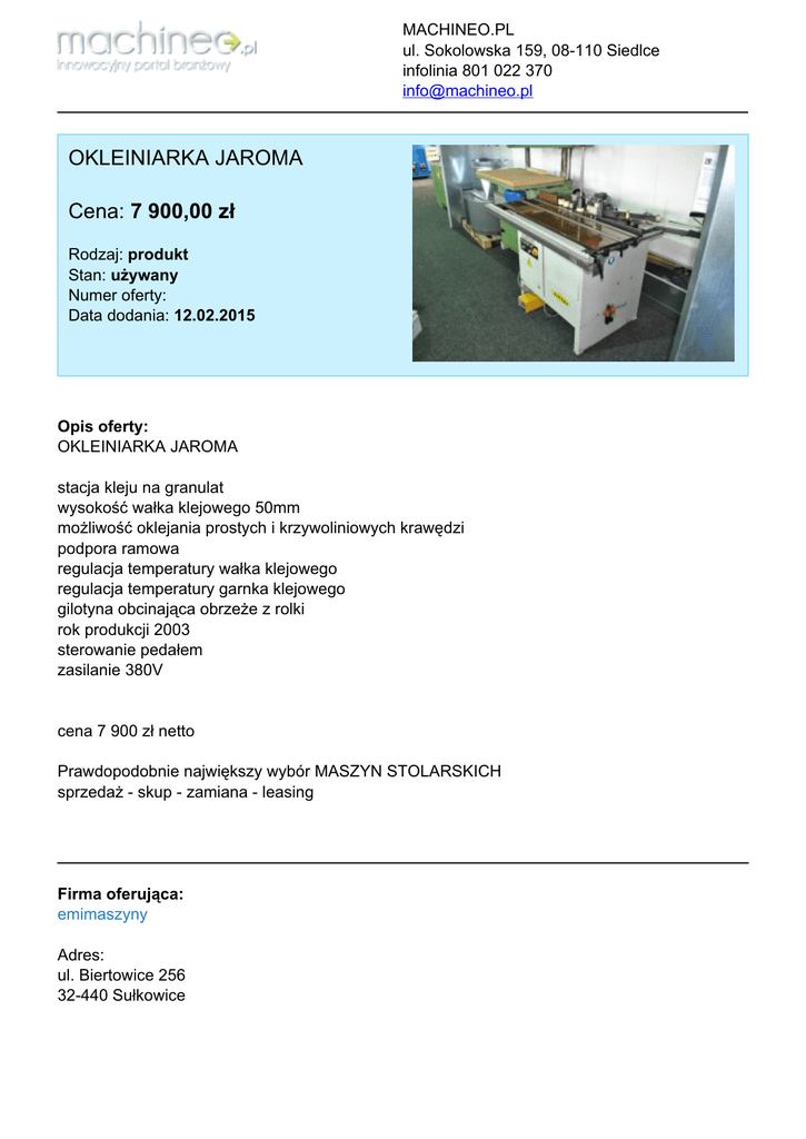 MACHINEO.PL ul. Sokolowska 159, 08-110 Siedlce infolinia 801 022 370 [email protected] OKLEINIARKA JAROMA Cena: 7 900,00 zł Rodzaj: produkt Stan: używany Numer oferty: Data dodania: 12.02.2015 Opis oferty: OKLEINIARKA JAROMA stacja kleju na granulat wysokość wałka klejowego 50mm możliwość oklejania prostych i krzywoliniowych krawędzi podpora ramowa regulacja temperatury wałka klejowego regulacja temperatury garnka klejowego gilotyna obcinająca obrzeże z rolki rok produkcji 2003 sterowanie pedałem zasilanie 380V cena 7 900 zł netto Prawdopodobnie największy wybór MASZYN STOLARSKICH sprzedaż - skup - zamiana - leasing Firma oferująca: emimaszyny Adres: ul. Biertowice 256 32-440 Sułkowice