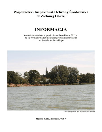 Wojewódzki Inspektorat Ochrony Środowiska w Zielonej Górze INFORMACJA o stanie środowiska w powiecie wschowskim w 2012 r. na tle wyników badań monitoringowych i kontrolnych województwa lubuskiego Jezioro Lgińsko (fot. Przemysław Susek) Zielona Góra, listopad 2013 r. Wprowadzenie Informację opracowano na podstawie wyników badań monitoringowych i kontrolnych stanu środowiska wykonanych w 2012 r. i w latach poprzednich przez Wojewódzki Inspektorat Ochrony Środowiska w Zielonej Górze. I Ocena stanu środowiska na terenie powiatu wschowskiego na tle województwa lubuskiego – według badań monitoringowych 1. Wody powierzchniowe Monitoring wód powierzchniowych w latach w 2012 r. prowadzony był zgodnie z zapisami: Ramowej Dyrektywy Wodnej (RDW), rozporządzenia Ministra Środowiska z 15 listopada 2011 r. w sprawie form i sposobu prowadzenia monitoringu jednolitych części wód powierzchniowych i podziemnych (Dz. U. Nr 258, poz. 1550) oraz Wojewódzkiego Programu Monitoringu Środowiska (WPMŚ). Badania jakości wód powierzchniowych prowadzone były w sieciach monitoringu: diagnostycznego, który ustanawia się w celu oceny stanu jcw, jak również w celu określenia rodzajów oraz oszacowania wielkości znacznych oddziaływań wynikających z działalności człowieka, na które narażone są określone części wód. Umożliwia także dokonanie oceny długoterminowych zmian stanu jcw w warunkach naturalnych oraz w warunkach szeroko rozumianych oddziaływań antropogenicznych. Zakres pomiarowy oprócz elementów biologicznych, hydromorfologicznych i fizykochemicznych z grup 3.1-3.5 oraz z grupy 3.6 (specyficzne zanieczyszczenia syntetyczne i niesyntetyczne), obejmuje także badania substancji chemicznych szczególnie szkodliwych dla środowiska wodnego – substancje priorytetowe (np. kadm, nikiel, ołów, rtęć, wielopierścieniowe węglowodory aromatyczne, pestycydy). operacyjnego, który prowadzi się na jcw, które są zagrożone nieosiągnięciem celów środowiskowych i służy do oceny stanu wód i zmian krótkoterminowych. Prowadzony jest na podstawie badań elementów biologicznych wspomaganych elementami fizykochemicznymi oraz, jeżeli jest to uzasadnione, pomiarami niektórych wskaźników chemicznych, obszarów chronionych będących jednolitymi częściami wód: - przeznaczonymi do poboru wody na potrzeby zaopatrzenia ludności w wodę przeznaczoną do spożycia, - przeznaczonymi do ochrony gatunków zwierząt wodnych o znaczeniu gospodarczym i obszary chronione przeznaczone do ochrony siedlisk lub gatunków, - wrażliwymi na eutrofizację wywołaną zanieczyszczeniami pochodzącymi ze źródeł komunalnych oraz narażone na zanieczyszczenia związkami azotu ze źródeł rolniczych. W jednym punkcie pomiarowo – kontrolnym mogło być realizowanych kilka programów badań. Częstotliwość tych badań była zróżnicowana i zależała od celu, dla którego dany punkt pomiarowo-kontrolny został wyznaczony. Ocenę stanu wód powierzchniowych wykonuje się w odniesieniu do jednolitych części wód, na podstawie wyników państwowego monitoringu środowiska i prezentuje poprzez ocenę stanu ekologicznego (w przypadku wód, których charakter został w znacznym stopniu 2 zmieniony w następstwie fizycznych przeobrażeń, będących wynikiem działalności człowieka – poprzez ocenę potencjału ekologicznego), ocenę stanu chemicznego i ocenę stanu. Stan/potencjał ekologiczny jest określeniem jakości struktury i funkcjonowania ekosystemu wód powierzchniowych, sklasyfikowanej na podstawie wyników badań elementów biologicznych oraz wspierających je wskaźników fizykochemicznych i hydromorfologicznych. Stan ekologiczny jednolitych części wód powierzchniowych klasyfikuje się poprzez nadanie jednolitej części wód jednej z pięciu klas jakości, przy czym klasa pierwsza oznacza bardzo dobry stan ekologiczny, klasa druga – dobry stan ekologiczny, zaś klasy trzecia, czwarta i piąta odpowiednio – stan ekologiczny umiarkowany, słaby i zły. W przypadku potencjału ekologicznego, klasa pierwsza i druga tworzą wspólnie potencjał „dobry i powyżej dobrego”. O przypisaniu ocenianej jednolitej części wód decydują wyniki klasyfikacji poszczególnych elementów biologicznych, przy czym obowiązuje zasada, że klasa stanu/potencjału ekologicznego odpowiada klasie najgorszego elementu biologicznego (rys. 1) Rys. 1. Schemat klasyfikacji stanu ekologicznego (źródło: Poradnik REFCOND, CIS-WFD, Guidance No 10) Klasyfikacji stanu chemicznego jednolitych części wód powierzchniowych dokonuje się na podstawie analizy wyników pomiarów zanieczyszczeń chemicznych, w tym tzw. substancji priorytetowych. Podstawą analizy jest porównanie uzyskanych wyników ze środowiskowymi normami jakości. Przyjmuje się, że jednolita część wód jest w dobrym stanie chemicznym, jeżeli żadna z obliczonych wartości stężeń nie przekracza dopuszczalnych stężeń 3 maksymalnych i średniorocznych. Jeżeli woda nie spełnia tych wymagań, stan chemiczny ocenianej jednolitej części wód określa się jako „poniżej dobrego”. Stan jednolitej części wód ocenia się poprzez porównanie wyników klasyfikacji stanu/potencjału ekologicznego i stanu chemicznego. Jednolita część wód może być oceniona jako będąca w „dobrym stanie”, jeśli jednocześnie jej stan/potencjał ekologiczny jest sklasyfikowany przynajmniej jako dobry, a stan chemiczny sklasyfikowany jest jako „dobry”. W pozostałych przypadkach, tj. gdy stan chemiczny jest sklasyfikowany jako „poniżej dobrego” lub stan/potencjał ekologiczny sklasyfikowano jako „umiarkowany”, „słaby”, bądź „zły”, jednolitą część wód ocenia się jako będącą w stanie złym (tab. 1.) Tab. 1. Schemat oceny stanu jednolitych części wód powierzchniowych Stan chemiczny Stan wód Stan ekologiczny / potencjał ekologiczny Dobry stan chemiczny Stan chemiczny poniżej dobr