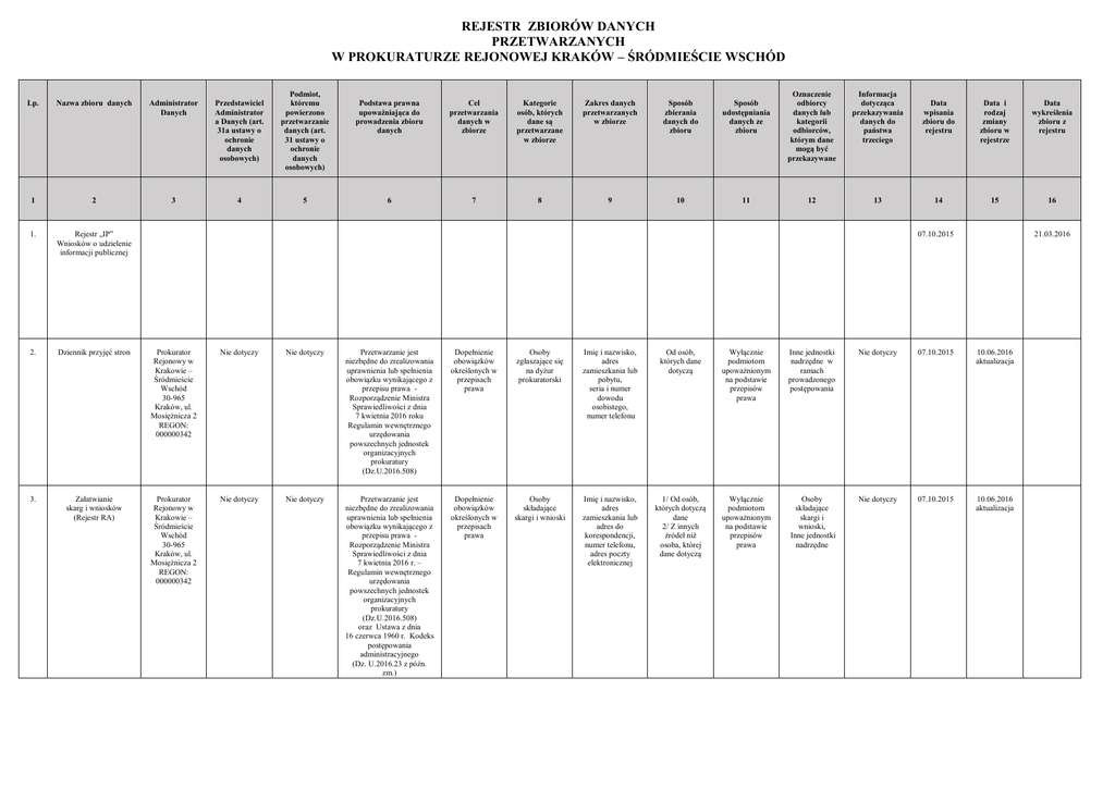 REJESTR ZBIORÓW DANYCH PRZETWARZANYCH W PROKURATURZE REJONOWEJ KRAKÓW – ŚRÓDMIEŚCIE WSCHÓD Lp. Nazwa zbioru danych Administrator Danych Przedstawiciel Administrator a Danych (art. 31a ustawy o ochronie danych osobowych) Podmiot, któremu powierzono przetwarzanie danych (art. 31 ustawy o ochronie danych osobowych) 1 2 3 4 5 1. Rejestr „IP” Wniosków o udzielenie informacji publicznej 2. Dziennik przyjęć stron Prokurator Rejonowy w Krakowie – Śródmieście Wschód 30-965 Kraków, ul. Mosiężnicza 2 REGON: 000000342 Nie dotyczy Nie dotyczy Przetwarzanie jest niezbędne do zrealizowania uprawnienia lub spełnienia obowiązku wynikającego z przepisu prawa Rozporządzenie Ministra Sprawiedliwości z dnia 7 kwietnia 2016 roku Regulamin wewnętrznego urzędowania powszechnych jednostek organizacyjnych prokuratury (Dz.U.2016.508) Dopełnienie obowiązków określonych w przepisach prawa Osoby zgłaszające się na dyżur prokuratorski Imię i nazwisko, adres zamieszkania lub pobytu, seria i numer dowodu osobistego, numer telefonu Od osób, których dane dotyczą Wyłącznie podmiotom upoważnionym na podstawie przepisów prawa Inne jednostki nadrzędne w ramach prowadzonego postępowania Nie dotyczy 07.10.2015 10.06.2016 aktualizacja 3. Załatwianie skarg i wniosków (Rejestr RA) Prokurator Rejonowy w Krakowie – Śródmieście Wschód 30-965 Kraków, ul. Mosiężnicza 2 REGON: 000000342 Nie dotyczy Nie dotyczy Przetwarzanie jest niezbędne do zrealizowania uprawnienia lub spełnienia obowiązku wynikającego z przepisu prawa Rozporządzenie Ministra Sprawiedliwości z dnia 7 kwietnia 2016 r. – Regulamin wewnętrznego urzędowania powszechnych jednostek organizacyjnych prokuratury (Dz.U.2016.508) oraz Ustawa z dnia 16 czerwca 1960 r. Kodeks postępowania administracyjnego (Dz. U.2016.23 z późn. zm.) Dopełnienie obowiązków określonych w przepisach prawa Osoby składające skargi i wnioski Imię i nazwisko, adres zamieszkania lub adres do korespondencji, numer telefonu, adres poczty elektronicznej 1/ Od osób, których dotyczą dane 2/ Z innych źródeł niż osoba, której dane dotyczą Wyłącznie podmiotom upoważnionym na podstawie przepisów prawa Osoby składające skargi i wnioski, Inne jednostki nadrzędne Nie dotyczy 07.10.2015 10.06.2016 aktualizacja Podstawa prawna upoważniająca do prowadzenia zbioru danych Cel przetwarzania danych w zbiorze Kategorie osób, których dane są przetwarzane w zbiorze Zakres danych przetwarzanych w zbiorze Sposób zbierania danych do zbioru Sposób udostępniania danych ze zbioru 6 7 8 9 10 11 Oznaczenie odbiorcy danych lub kategorii odbiorców, którym dane mogą być przekazywane Informacja dotycząca przekazywania danych do państwa trzeciego Data wpisania zbioru do rejestru Data i rodzaj zmiany zbioru w rejestrze Data wykreślenia zbioru z rejestru 12 13 14 15 16 07.10.2015 21.03.2016 Lp. Nazwa zbioru danych Administrator Danych Przedstawiciel Administrator a Danych (art. 31a ustawy o ochronie danych osobowych) Podmiot, któremu powierzono przetwarzanie danych (art. 31 ustawy o ochronie danych osobowych) 1 2 3 4 4. Rejestr samodzielny „Ip” – dla spraw o udostępnienie informacji publicznej, a także środków odwoławczych od decyzji w przedmiocie udostępniania informacji publicznej oraz udziału przed sądami administracyjnymi Prokurator Rejonowy w Krakowie – Śródmieście Wschód 30-965 Kraków, ul. Mosiężnicza 2 REGON: 000000342 Nie dotyczy Oznaczenie odbiorcy danych lub kategorii odbiorców, którym dane mogą być przekazywane Informacja dotycząca przekazywania danych do państwa trzeciego Data wpisania zbioru do rejestru Data i rodzaj zmiany zbioru w rejestrze Data wykreślenia zbioru z rejestru 11 12 13 14 15 16 Wyłącznie podmiotom upoważnionym na podstawie przepisów prawa Osoby wnioskujące o udostępnienie informacji publicznej Nie dotyczy Podstawa prawna upoważniająca do prowadzenia zbioru danych Cel przetwarzania danych w zbiorze Kategorie osób, których dane są przetwarzane w zbiorze Zakres danych przetwarzanych w zbiorze Sposób zbierania danych do zbioru Sposób udostępniania danych ze zbioru 5 6 7 8 9 10 Nie dotyczy Przetwarzanie jest niezbędne do zrealizowania uprawnienia lub spełnienia obowiązku wynikającego z przepisu prawa - Ustawa z dnia 6 września 2001 r. o dostępie do informacji publicznej (tj. Dz. U.2015.2058 z późn. zm.) Dopełnienie obowiązków określonych w przepisach prawa Osoby wnioskujące o dostęp do informacji publicznej Imię i nazwisko, adres zamieszkania, numer telefonu, adres poczty elektronicznej 1/ Od osób, których dotyczą dane 2/ Z innych źródeł niż osoba, której dane dotyczą 21.03.2016