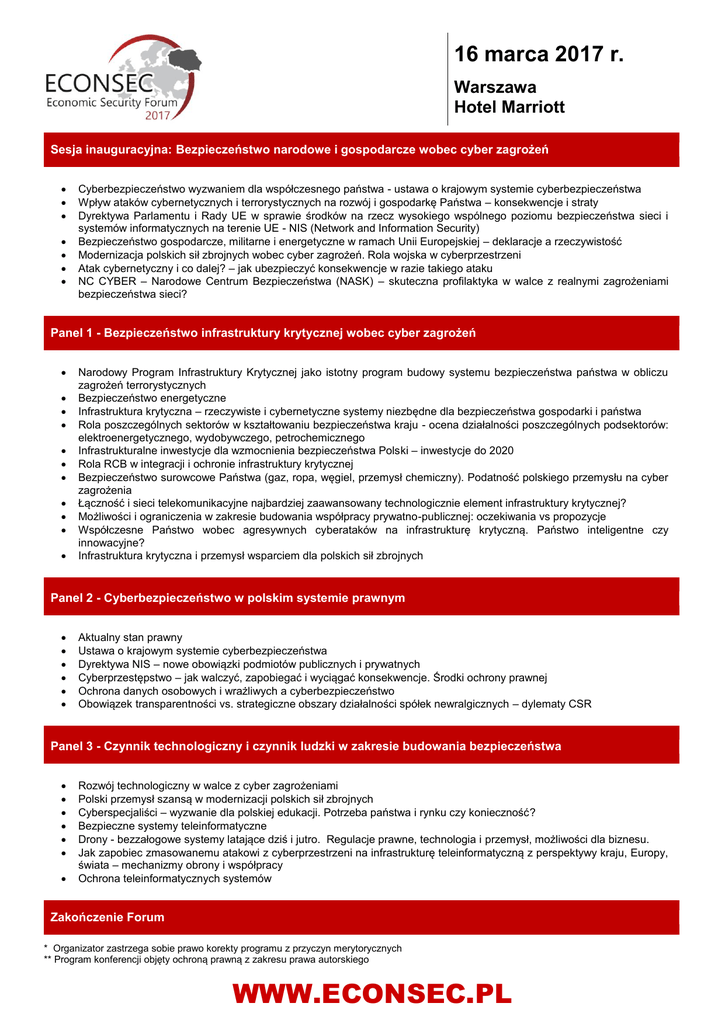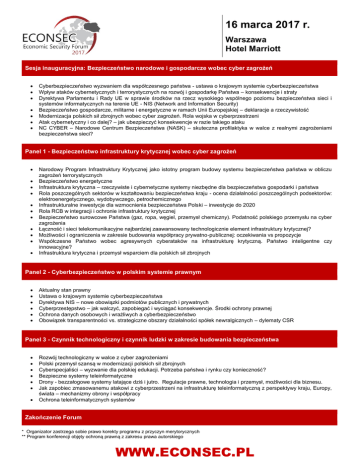 16 marca 2017 r. Warszawa Hotel Marriott Sesja inauguracyjna: Bezpieczeństwo narodowe i gospodarcze wobec cyber zagrożeń Cyberbezpieczeństwo wyzwaniem dla współczesnego państwa - ustawa o krajowym systemie cyberbezpieczeństwa Wpływ ataków cybernetycznych i terrorystycznych na rozwój i gospodarkę Państwa – konsekwencje i straty Dyrektywa Parlamentu i Rady UE w sprawie środków na rzecz wysokiego wspólnego poziomu bezpieczeństwa sieci i systemów informatycznych na terenie UE - NIS (Network and Information Security) Bezpieczeństwo gospodarcze, militarne i energetyczne w ramach Unii Europejskiej – deklaracje a rzeczywistość Modernizacja polskich sił zbrojnych wobec cyber zagrożeń. Rola wojska w cyberprzestrzeni Atak cybernetyczny i co dalej? – jak ubezpieczyć konsekwencje w razie takiego ataku NC CYBER – Narodowe Centrum Bezpieczeństwa (NASK) – skuteczna profilaktyka w walce z realnymi zagrożeniami bezpieczeństwa sieci? Panel 1 - Bezpieczeństwo infrastruktury krytycznej wobec cyber zagrożeń Narodowy Program Infrastruktury Krytycznej jako istotny program budowy systemu bezpieczeństwa państwa w obliczu zagrożeń terrorystycznych Bezpieczeństwo energetyczne Infrastruktura krytyczna – rzeczywiste i cybernetyczne systemy niezbędne dla bezpieczeństwa gospodarki i państwa Rola poszczególnych sektorów w kształtowaniu bezpieczeństwa kraju - ocena działalności poszczególnych podsektorów: elektroenergetycznego, wydobywczego, petrochemicznego Infrastrukturalne inwestycje dla wzmocnienia bezpieczeństwa Polski – inwestycje do 2020 Rola RCB w integracji i ochronie infrastruktury krytycznej Bezpieczeństwo surowcowe Państwa (gaz, ropa, węgiel, przemysł chemiczny). Podatność polskiego przemysłu na cyber zagrożenia Łączność i sieci telekomunikacyjne najbardziej zaawansowany technologicznie element infrastruktury krytycznej? Możliwości i ograniczenia w zakresie budowania współpracy prywatno-publicznej: oczekiwania vs propozycje Współczesne Państwo wobec agresywnych cyberataków na infrastrukturę krytyczną. Państwo inteligentne czy innowacyjne? Infrastruktura krytyczna i przemysł wsparciem dla polskich sił zbrojnych Panel 2 - Cyberbezpieczeństwo w polskim systemie prawnym Aktualny stan prawny Ustawa o krajowym systemie cyberbezpieczeństwa Dyrektywa NIS – nowe obowiązki podmiotów publicznych i prywatnych Cyberprzestępstwo – jak walczyć, zapobiegać i wyciągać konsekwencje. Środki ochrony prawnej Ochrona danych osobowych i wrażliwych a cyberbezpieczeństwo Obowiązek transparentności vs. strategiczne obszary działalności spółek newralgicznych – dylematy CSR Panel 3 - Czynnik technologiczny i czynnik ludzki w zakresie budowania bezpieczeństwa Rozwój technologiczny w walce z cyber zagrożeniami Polski przemysł szansą w modernizacji polskich sił zbrojnych Cyberspecjaliści – wyzwanie dla polskiej edukacji. Potrzeba państwa i rynku czy konieczność? Bezpieczne systemy teleinformatyczne Drony - bezzałogowe systemy latające dziś i jutro. Regulacje prawne, technologia i przemysł, możliwości dla biznesu. Jak zapobiec zmasowanemu atakowi z cyberprzestrzeni na infrastrukturę teleinformatyczną z perspektywy kraju, Europy, świata – mechanizmy obrony i współpracy Ochrona teleinformatycznych systemów Zakończenie Forum * Organizator zastrzega sobie prawo korekty programu z przyczyn merytorycznych ** Program konferencji objęty ochroną prawną z zakresu prawa autorskiego WWW.ECONSEC.PL