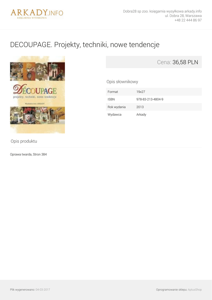 Dobra28 sp zoo. księgarnia wysyłkowa arkady.info ul. Dobra 28, Warszawa +48 22 444 86 97 DECOUPAGE. Projekty, techniki, nowe tendencje Cena: 36,58 PLN Opis słownikowy Format 19x27 ISBN 978-83-213-4804-9 Rok wydania 2013 Wydawca Arkady Opis produktu Oprawa twarda, Stron 384 Plik wygenerowano: 04-03-2017 Powered by TCPDF (www.tcpdf.org) Oprogramowanie sklepu: AptusShop