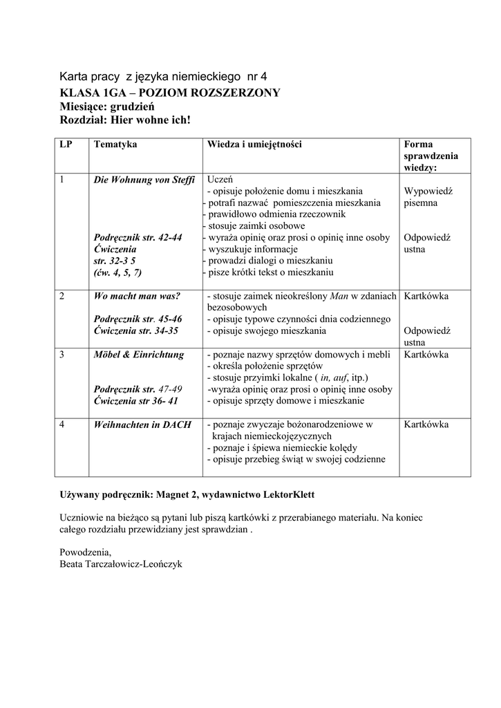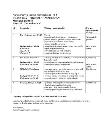 Karta pracy z języka niemieckiego nr 4 KLASA 1GA – POZIOM ROZSZERZONY Miesiące: grudzień Rozdział: Hier wohne ich! LP Tematyka 1 Die Wohnung von Steffi Podręcznik str. 42-44 Ćwiczenia str. 32-3 5 (ćw. 4, 5, 7) 2 Wo macht man was? Podręcznik str. 45-46 Ćwiczenia str. 34-35 3 Möbel & Einrichtung Podręcznik str. 47-49 Ćwiczenia str 36- 41 4 Weihnachten in DACH Wiedza i umiejętności Uczeń - opisuje położenie domu i mieszkania - potrafi nazwać pomieszczenia mieszkania - prawidłowo odmienia rzeczownik - stosuje zaimki osobowe - wyraża opinię oraz prosi o opinię inne osoby - wyszukuje informacje - prowadzi dialogi o mieszkaniu - pisze krótki tekst o mieszkaniu Forma sprawdzenia wiedzy: Wypowiedź pisemna Odpowiedź ustna - stosuje zaimek nieokreślony Man w zdaniach Kartkówka bezosobowych - opisuje typowe czynności dnia codziennego - opisuje swojego mieszkania Odpowiedź ustna - poznaje nazwy sprzętów domowych i mebli Kartkówka - określa położenie sprzętów - stosuje przyimki lokalne ( in, auf, itp.) -wyraża opinię oraz prosi o opinię inne osoby - opisuje sprzęty domowe i mieszkanie - poznaje zwyczaje bożonarodzeniowe w krajach niemieckojęzycznych - poznaje i śpiewa niemieckie kolędy - opisuje przebieg świąt w swojej codzienne Kartkówka Używany podręcznik: Magnet 2, wydawnictwo LektorKlett Uczniowie na bieżąco są pytani lub piszą kartkówki z przerabianego materiału. Na koniec całego rozdziału przewidziany jest sprawdzian . Powodzenia, Beata Tarczałowicz-Leończyk