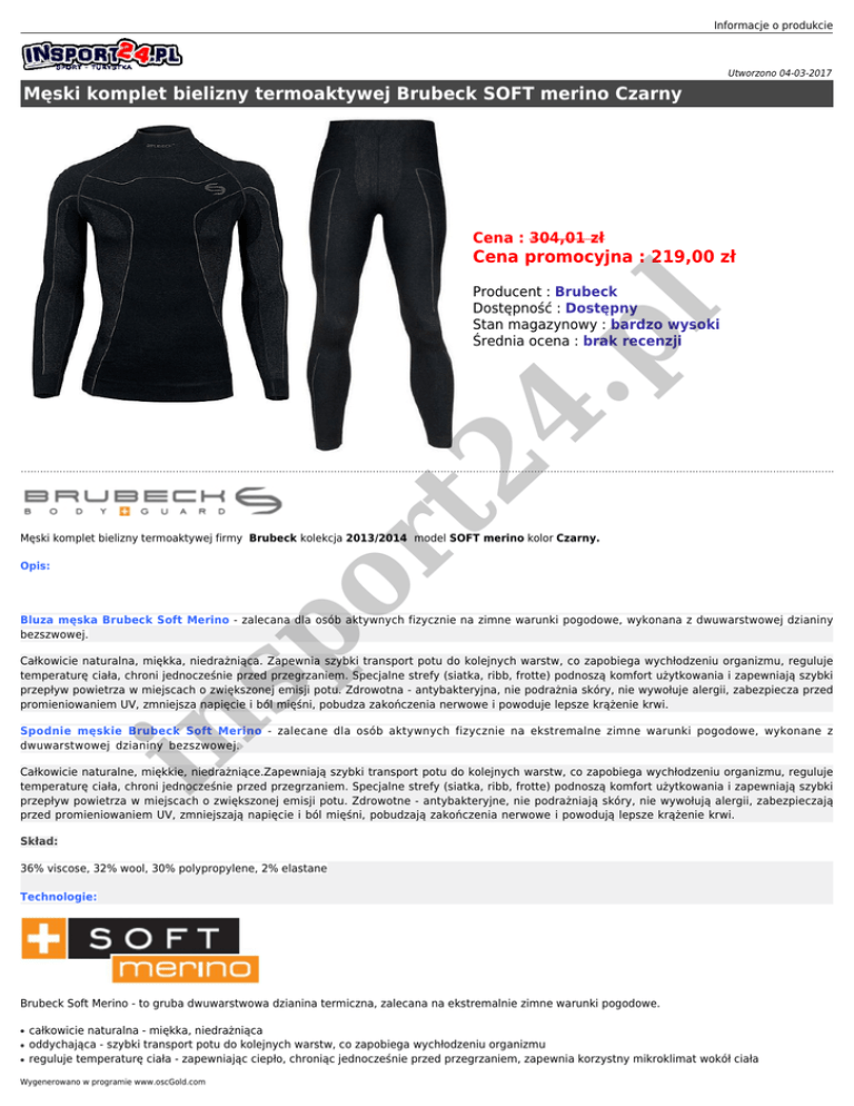 Informacje o produkcie Utworzono 04-03-2017 Męski komplet bielizny termoaktywej Brubeck SOFT merino Czarny Cena : 304,01 zł Cena promocyjna : 219,00 zł sp or t2 4. p l Producent : Brubeck Dostępność : Dostępny Stan magazynowy : bardzo wysoki Średnia ocena : brak recenzji Męski komplet bielizny termoaktywej firmy Brubeck kolekcja 2013/2014 model SOFT merino kolor Czarny. Opis: Bluza męska Brubeck Soft Merino - zalecana dla osób aktywnych fizycznie na zimne warunki pogodowe, wykonana z dwuwarstwowej dzianiny bezszwowej. in Całkowicie naturalna, miękka, niedrażniąca. Zapewnia szybki transport potu do kolejnych warstw, co zapobiega wychłodzeniu organizmu, reguluje temperaturę ciała, chroni jednocześnie przed przegrzaniem. Specjalne strefy (siatka, ribb, frotte) podnoszą komfort użytkowania i zapewniają szybki przepływ powietrza w miejscach o zwiększonej emisji potu. Zdrowotna - antybakteryjna, nie podrażnia skóry, nie wywołuje alergii, zabezpiecza przed promieniowaniem UV, zmniejsza napięcie i ból mięśni, pobudza zakończenia nerwowe i powoduje lepsze krążenie krwi. Spodnie męskie Brubeck Soft Merino - zalecane dla osób aktywnych fizycznie na ekstremalne zimne warunki pogodowe, wykonane z dwuwarstwowej dzianiny bezszwowej. Całkowicie naturalne, miękkie, niedrażniące.Zapewniają szybki transport potu do kolejnych warstw, co zapobiega wychłodzeniu organizmu, reguluje temperaturę ciała, chroni jednocześnie przed przegrzaniem. Specjalne strefy (siatka, ribb, frotte) podnoszą komfort użytkowania i zapewniają szybki przepływ powietrza w miejscach o zwiększonej emisji potu. Zdrowotne - antybakteryjne, nie podrażniają skóry, nie wywołują alergii, zabezpieczają przed promieniowaniem UV, zmniejszają napięcie i ból mięśni, pobudzają zakończenia nerwowe i powodują lepsze krążenie krwi. Skład: 36% viscose, 32% wool, 30% polypropylene, 2% elastane Technologie: Brubeck Soft Merino - to gruba dwuwarstwowa dzianina termiczna, zalecana na ekstremalnie zimne warunki pogodowe. ● ● ● całkowicie naturalna - miękka, niedrażniąca oddychająca - szybki transport potu do kolejnych warstw, co zapobiega wychłodzeniu organizmu reguluje temperaturę ciała - zapewniając ciepło, chroniąc jednocześnie przed przegrzaniem, zapewnia korzystny mikroklimat wokół ciała Wygenerowano w programie www.oscGold.com ● ● ● dla osób aktywnych fizycznie - pochłania i stopniowo odprowadza na zewnątrz nadmiar wilgoci wytworzonej przez organizm, specjalne strefy (siatka, ribb, frotte) podnoszą komfort użytkowania i zapewniają szybki przepływ powietrza w miejscach o zwiększonej emisji potu zdrowotna - antybakteryjna i antystatyczna, nie podrażnia skóry, nie wywołuje alergii, zabezpiecza przed promieniowaniem UV, zmniejsza napięcie i ból mięśni, pobudza zakończenia nerwowe i powoduje lepsze krążenie krwi Skład: 36% viscose, 32% wool, 30% polypropylene, 2% elastane sp or t2 4. p l Technologie: Męska rozmiarówka bielizny Brubeck: TABELA KOBIETY | SPORT ROZMIAR/SIZE WZROST/HEIGHT OBWÓD KLATKI PIERSIOWEJ/CHEST OBWÓD BIODER/HIPS XS S M L XL 154-160 158-164 162-168 166-172 170-176 82-88 88-92 92-96 96-102 102-108 88-92 92-96 96-100 100-104 104-108 Dostępne opcje Męski komplet bielizny termoaktywej Brubeck SOFT merino Czarny in rozmiar: XXL, M.