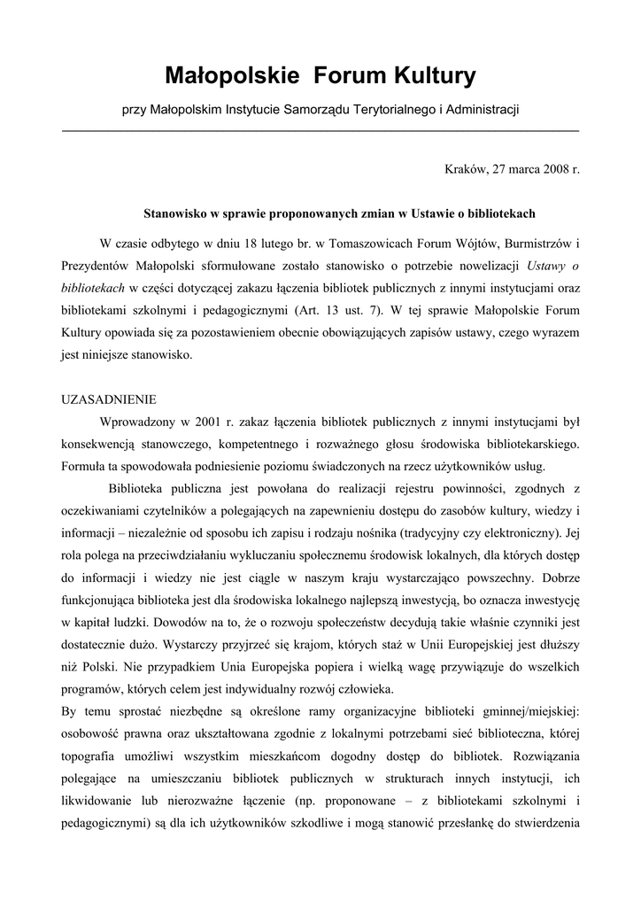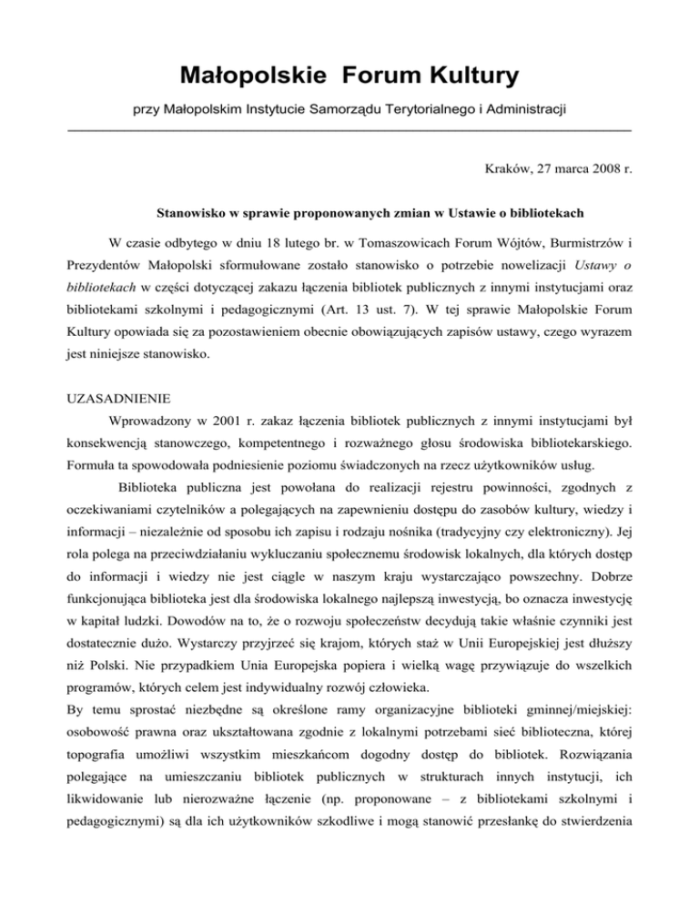Małopolskie Forum Kultury przy Małopolskim Instytucie Samorządu Terytorialnego i Administracji ________________________________________________________________________________ Kraków, 27 marca 2008 r. Stanowisko w sprawie proponowanych zmian w Ustawie o bibliotekach W czasie odbytego w dniu 18 lutego br. w Tomaszowicach Forum Wójtów, Burmistrzów i Prezydentów Małopolski sformułowane zostało stanowisko o potrzebie nowelizacji Ustawy o bibliotekach w części dotyczącej zakazu łączenia bibliotek publicznych z innymi instytucjami oraz bibliotekami szkolnymi i pedagogicznymi (Art. 13 ust. 7). W tej sprawie Małopolskie Forum Kultury opowiada się za pozostawieniem obecnie obowiązujących zapisów ustawy, czego wyrazem jest niniejsze stanowisko. UZASADNIENIE Wprowadzony w 2001 r. zakaz łączenia bibliotek publicznych z innymi instytucjami był konsekwencją stanowczego, kompetentnego i rozważnego głosu środowiska bibliotekarskiego. Formuła ta spowodowała podniesienie poziomu świadczonych na rzecz użytkowników usług. Biblioteka publiczna jest powołana do realizacji rejestru powinności, zgodnych z oczekiwaniami czytelników a polegających na zapewnieniu dostępu do zasobów kultury, wiedzy i informacji – niezależnie od sposobu ich zapisu i rodzaju nośnika (tradycyjny czy elektroniczny). Jej rola polega na przeciwdziałaniu wykluczaniu społecznemu środowisk lokalnych, dla których dostęp do informacji i wiedzy nie jest ciągle w naszym kraju wystarczająco powszechny. Dobrze funkcjonująca biblioteka jest dla środowiska lokalnego najlepszą inwestycją, bo oznacza inwestycję w kapitał ludzki. Dowodów na to, że o rozwoju społeczeństw decydują takie właśnie czynniki jest dostatecznie dużo. Wystarczy przyjrzeć się krajom, których staż w Unii Europejskiej jest dłuższy niż Polski. Nie przypadkiem Unia Europejska popiera i wielką wagę przywiązuje do wszelkich programów, których celem jest indywidualny rozwój człowieka. By temu sprostać niezbędne są określone ramy organizacyjne biblioteki gminnej/miejskiej: osobowość prawna oraz ukształtowana zgodnie z lokalnymi potrzebami sieć biblioteczna, której topografia umożliwi wszystkim mieszkańcom dogodny dostęp do bibliotek. Rozwiązania polegające na umieszczaniu bibliotek publicznych w strukturach innych instytucji, ich likwidowanie lub nierozważne łączenie (np. proponowane – z bibliotekami szkolnymi i pedagogicznymi) są dla ich użytkowników szkodliwe i mogą stanowić przesłankę do stwierdzenia naruszenia konstytucyjnego prawa do wolności korzystania z dóbr kultury. Doświadczenie mówi, że w takich sytuacjach stroną poszkodowaną – merytorycznie i finansowo – jest biblioteka i jej użytkownicy, co często ma związek z nakładaniem na bibliotekarzy, pracujących w strukturach innych instytucji, licznych obowiązków niebibliotecznych. W konsekwencji prowadzi to również do marnowania zawodowych kwalifikacji bibliotekarzy. Prawo jest wyrazem priorytetów i troski państwa o właściwe funkcjonowanie podmiotów służących jego obywatelom. Nie zawsze – jak ostatnie analizy wskazują – porządek prawny jest dla obywateli korzystny, jednak przeprowadzanie zmian pochopnych, i to pod pozorem korzyści finansowych, stoi w sprzeczności z tą podstawową zasadą. Straci na tym zwykły obywatel – czytelnik (i wyborca!). Zamiast dokonywać nieustannych zmian, należy przyjrzeć się uważnie funkcjonowaniu bibliotek publicznych według obecnego porządku prawnego, zastanowić się nad ewentualnymi przyczynami niedostatków i podjąć działania naprawcze. Silne i sprawnie funkcjonujące biblioteki publiczne są najlepszym gwarantem skutecznej budowy nowoczesnego społeczeństwa. Do tego powinna aspirować każda światła władza samorządowa. Zarząd Małopolskiego Forum Kultury