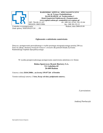 RADOMSKI SZPITAL SPECJALISTYCZNY im. dr Tytusa Chałubińskiego 26-610 RADOM ul. Tochtermana 1 Dział Zamówień Publicznych i Zaopatrzenia www.szpital.radom.pl; [email protected] NIP: 796-00-12-187 tel.: 048 361-52-85, 361-52-84 REGON: 000315086 fax.: 048 361-52-13 Centralny nr postępowania: ……….. Radom, dnia 2008.05.09 Znak sprawy: RSS/ZPiZ/P-26/…../08 Ogłoszenie o udzieleniu zamówienia Dotyczy: postępowania prowadzonego w trybie przetargu nieograniczonego poniżej 206 tys. Euro na zakup i dostawę świeżych warzyw i owoców dla potrzeb Działu Żywienia Radomskiego Szpitala Specjalistycznego. W wyniku przeprowadzonego postępowania zamówienia udzielono n/w firmie: Rolno-Spożywczy Rynek Hurtowy S.A. Ul. Lubelska 65 26-600 Radom Umowa z dnia 28.04.2008r., na kwotę 159.077,84 zł brutto Termin realizacji umowy: 2 lata, licząc od daty podpisania umowy. Z poważaniem: Andrzej Pawluczyk Sporządziła-Justyna Kapusta