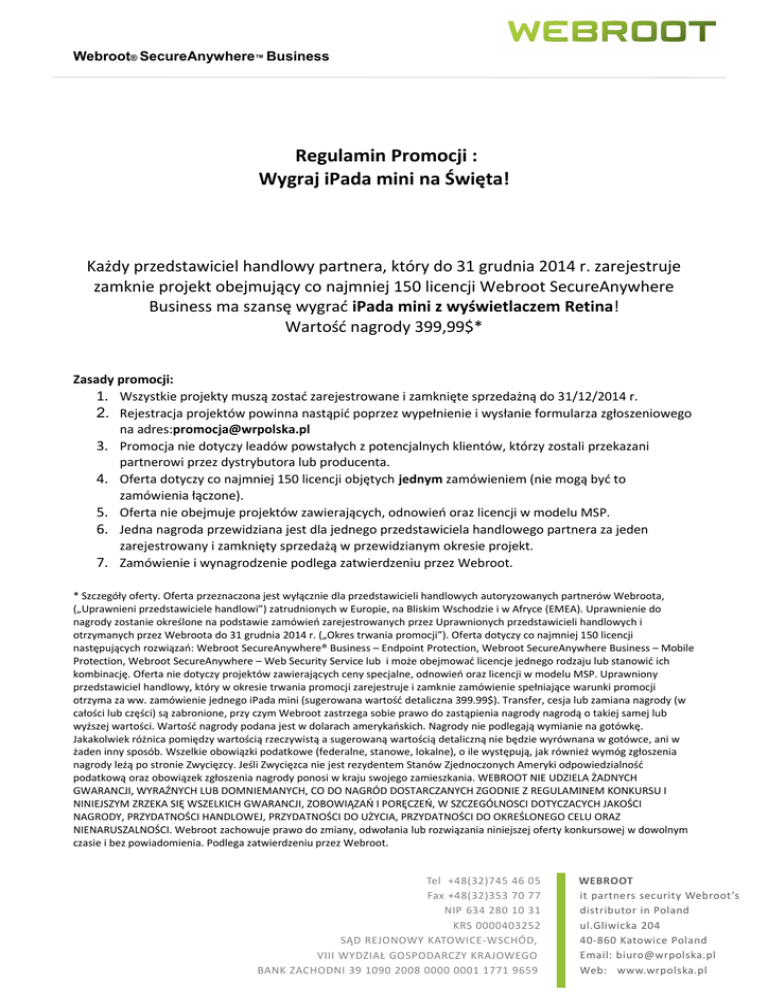 Webroot® SecureAnywhere™ Business Regulamin Promocji : Wygraj iPada mini na Święta! Każdy przedstawiciel handlowy partnera, który do 31 grudnia 2014 r. zarejestruje zamknie projekt obejmujący co najmniej 150 licencji Webroot SecureAnywhere Business ma szansę wygrać iPada mini z wyświetlaczem Retina! Wartość nagrody 399,99$* Zasady promocji: 1. Wszystkie projekty muszą zostać zarejestrowane i zamknięte sprzedażną do 31/12/2014 r. 2. Rejestracja projektów powinna nastąpić poprzez wypełnienie i wysłanie formularza zgłoszeniowego na adres:[email protected] 3. Promocja nie dotyczy leadów powstałych z potencjalnych klientów, którzy zostali przekazani partnerowi przez dystrybutora lub producenta. 4. Oferta dotyczy co najmniej 150 licencji objętych jednym zamówieniem (nie mogą być to zamówienia łączone). 5. Oferta nie obejmuje projektów zawierających, odnowień oraz licencji w modelu MSP. 6. Jedna nagroda przewidziana jest dla jednego przedstawiciela handlowego partnera za jeden zarejestrowany i zamknięty sprzedażą w przewidzianym okresie projekt. 7. Zamówienie i wynagrodzenie podlega zatwierdzeniu przez Webroot. * Szczegóły oferty. Oferta przeznaczona jest wyłącznie dla przedstawicieli handlowych autoryzowanych partnerów Webroota, („Uprawnieni przedstawiciele handlowi”) zatrudnionych w Europie, na Bliskim Wschodzie i w Afryce (EMEA). Uprawnienie do nagrody zostanie określone na podstawie zamówień zarejestrowanych przez Uprawnionych przedstawicieli handlowych i otrzymanych przez Webroota do 31 grudnia 2014 r. („Okres trwania promocji”). Oferta dotyczy co najmniej 150 licencji następujących rozwiązań: Webroot SecureAnywhere® Business – Endpoint Protection, Webroot SecureAnywhere Business – Mobile Protection, Webroot SecureAnywhere – Web Security Service lub i może obejmować licencje jednego rodzaju lub stanowić ich kombinację. Oferta nie dotyczy projektów zawierających ceny specjalne, odnowień oraz licencji w modelu MSP. Uprawniony przedstawiciel handlowy, który w okresie trwania promocji zarejestruje i zamknie zamówienie spełniające warunki promocji otrzyma za ww. zamówienie jednego iPada mini (sugerowana wartość detaliczna 399.99$). Transfer, cesja lub zamiana nagrody (w całości lub części) są zabronione, przy czym Webroot zastrzega sobie prawo do zastąpienia nagrody nagrodą o takiej samej lub wyższej wartości. Wartość nagrody podana jest w dolarach amerykańskich. Nagrody nie podlegają wymianie na gotówkę. Jakakolwiek różnica pomiędzy wartością rzeczywistą a sugerowaną wartością detaliczną nie będzie wyrównana w gotówce, ani w żaden inny sposób. Wszelkie obowiązki podatkowe (federalne, stanowe, lokalne), o ile występują, jak również wymóg zgłoszenia nagrody leżą po stronie Zwycięzcy. Jeśli Zwycięzca nie jest rezydentem Stanów Zjednoczonych Ameryki odpowiedzialność podatkową oraz obowiązek zgłoszenia nagrody ponosi w kraju swojego zamieszkania. WEBROOT NIE UDZIELA ŻADNYCH GWARANCJI, WYRAŹNYCH LUB DOMNIEMANYCH, CO DO NAGRÓD DOSTARCZANYCH ZGODNIE Z REGULAMINEM KONKURSU I NINIEJSZYM ZRZEKA SIĘ WSZELKICH GWARANCJI, ZOBOWIĄZAŃ I PORĘCZEŃ, W SZCZEGÓLNOSCI DOTYCZACYCH JAKOŚCI NAGRODY, PRZYDATNOŚCI HANDLOWEJ, PRZYDATNOŚCI DO UŻYCIA, PRZYDATNOŚCI DO OKREŚLONEGO CELU ORAZ NIENARUSZALNOŚCI. Webroot zachowuje prawo do zmiany, odwołania lub rozwiązania niniejszej oferty konkursowej w dowolnym czasie i bez powiadomienia. Podlega zatwierdzeniu przez Webroot. Tel +48(32)745 46 05 Fax +48(32)353 70 77 NIP 634 280 10 31 KRS 0000403252 SĄD REJONOWY KATOWICE-WSCHÓD, VIII WYDZIAŁ GOSPODARCZY KRAJOWEGO BANK ZACHODNI 39 1090 2008 0000 0001 1771 9659 WEBROOT it partners security Webroot’s distributor in Poland ul.Gliwicka 204 40-860 Katowice Poland Email: [email protected] Web: www.wrpolska.pl