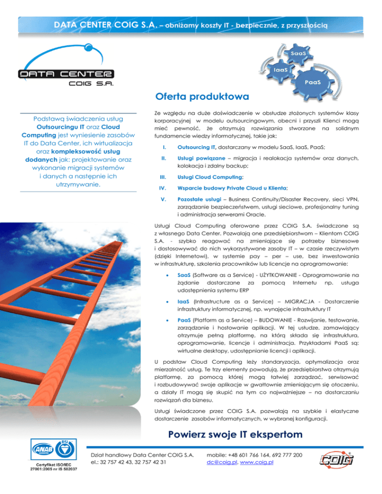 DATA CENTER COIG S.A. – obniżamy koszty IT - bezpiecznie, z przyszłością Oferta produktowa Podstawą świadczenia usług Outsourcingu IT oraz Cloud Computing jest wyniesienie zasobów IT do Data Center, ich wirtualizacja oraz kompleksowość usług dodanych jak: projektowanie oraz wykonanie migracji systemów i danych a następnie ich utrzymywanie. Ze względu na duże doświadczenie w obsłudze złożonych systemów klasy korporacyjnej mieć w modelu outsourcingowym, obecni i przyszli Klienci mogą pewność, że otrzymują rozwiązania stworzone na solidnym fundamencie wiedzy informatycznej, takie jak: I. Outsourcing IT, dostarczany w modelu SaaS, IaaS, PaaS; II. Usługi powiązane – migracja i realokacja systemów oraz danych, kolokacja i zdalny backup; III. Usługi Cloud Computing; IV. Wsparcie budowy Private Cloud u Klienta; V. Pozostałe usługi – Business Continuity/Disaster Recovery, sieci VPN, zarządzanie bezpieczeństwem, usługi sieciowe, profesjonalny tuning i administracja serwerami Oracle. Usługi Cloud Computing oferowane przez COIG S.A. świadczone są z własnego Data Center. Pozwalają one przedsiębiorstwom – Klientom COIG S.A. - szybko reagować na zmieniające się potrzeby biznesowe i dostosowywać do nich wykorzystywane zasoby IT – w czasie rzeczywistym (dzięki Internetowi), w systemie pay – per – use, bez inwestowania w infrastrukturę, szkolenia pracowników lub licencje na oprogramowanie: SaaS (Software as a Service) - UŻYTKOWANIE - Oprogramowanie na żądanie dostarczane za pomocą Internetu np. usługa udostępnienia systemu ERP IaaS (Infrastructure as a Service) – MIGRACJA - Dostarczenie infrastruktury informatycznej, np. wynajęcie infrastruktury IT PaaS (Platform as a Service) – BUDOWANIE - Rozwijanie, testowanie, zarządzanie i hostowanie aplikacji. W tej usłudze, zamawiający otrzymuje pełną platformę, na którą składa się infrastruktura, oprogramowanie, licencje i administracja. Przykładami PaaS są: wirtualne desktopy, udostępnianie licencji i aplikacji. U podstaw Cloud Computing leży standaryzacja, optymalizacja oraz mierzalność usług. Te trzy elementy powodują, że przedsiębiorstwa otrzymują platformę, za pomocą której mogą łatwiej zarządzać, serwisować i rozbudowywać swoje aplikacje w gwałtownie zmieniającym się otoczeniu, a działy IT mogą się skupić na tym co najważniejsze – na dostarczaniu rozwiązań dla biznesu. Usługi świadczone przez COIG S.A. pozwalają na szybkie i elastyczne dostarczenie zasobów informatycznych, w wybranej konfiguracji. Powierz swoje IT ekspertom Dział handlowy Data Center COIG S.A. el.: 32 757 42 43, 32 757 42 31 mobile: +48 601 766 164, 692 777 200 [email protected], www.coig.pl