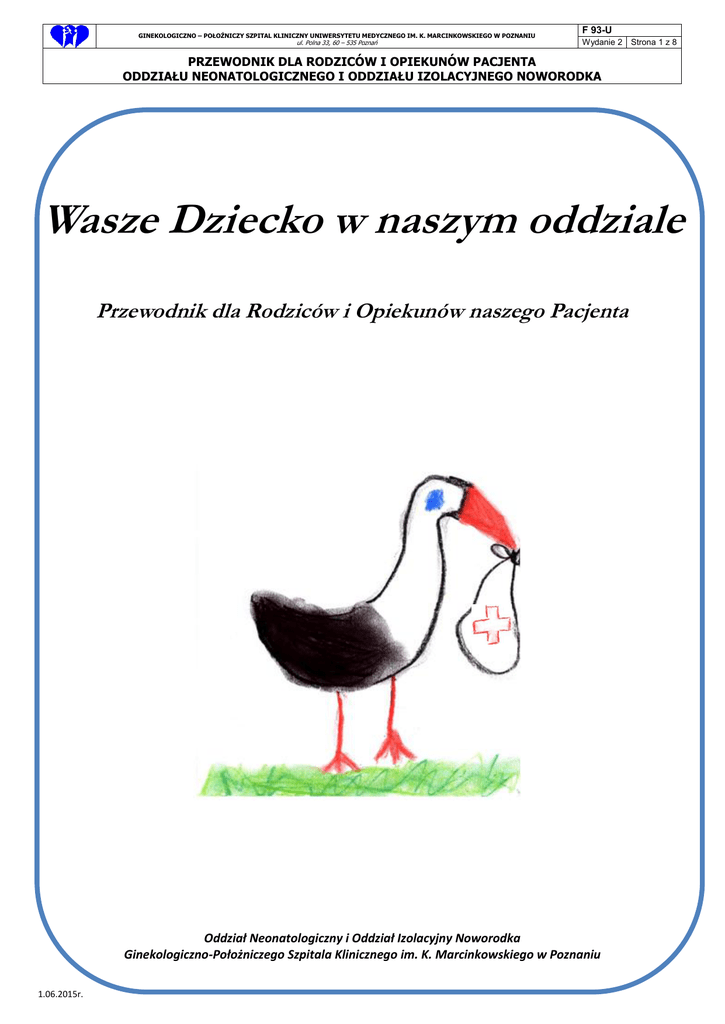 GINEKOLOGICZNO – POŁOŻNICZY SZPITAL KLINICZNY UNIWERSYTETU MEDYCZNEGO IM. K. MARCINKOWSKIEGO W POZNANIU ul. Polna 33, 60 – 535 Poznań F 93-U Wydanie 2 Strona 1 z 8 PRZEWODNIK DLA RODZICÓW I OPIEKUNÓW PACJENTA ODDZIAŁU NEONATOLOGICZNEGO I ODDZIAŁU IZOLACYJNEGO NOWORODKA Wasze Dziecko w naszym oddziale Przewodnik dla Rodziców i Opiekunów naszego Pacjenta Oddział Neonatologiczny i Oddział Izolacyjny Noworodka Ginekologiczno-Położniczego Szpitala Klinicznego im. K. Marcinkowskiego w Poznaniu 1.06.2015r. GINEKOLOGICZNO – POŁOŻNICZY SZPITAL KLINICZNY UNIWERSYTETU MEDYCZNEGO IM. K. MARCINKOWSKIEGO W POZNANIU ul. Polna 33, 60 – 535 Poznań F 93-U Wydanie 2 Strona 2 z 8 PRZEWODNIK DLA RODZICÓW I OPIEKUNÓW PACJENTA ODDZIAŁU NEONATOLOGICZNEGO I ODDZIAŁU IZOLACYJNEGO NOWORODKA Drodzy Rodzice i Opiekunowie, W tej chwili Wasze Dziecko jest naszym pacjentem. Dołożymy wszelkich starań, by wracało do zdrowia i rosło, tak aby Wasza Rodzina wkrótce się połączyła. Mamy nadzieję, że poniższe informacje pozwolą Państwu poznać zasady naszej pracy, oraz wytłumaczą to, co może dziać się z Waszym Dzieckiem. Wasze poczucie bezpieczeństwa pomaga nam lepiej leczyć. Odwiedziny Na początku Państwa dziecko będzie przebywać w oddziale dla chorych noworodków, który nazywany jest Oddziałem Intensywnej Terapii lub Patologii Noworodka. Gdy stanie się rekonwalescentem – będzie przekazane do innego oddziału w naszym szpitalu lub do innego szpitala, zgodnie z adresem zamieszkania. W naszym szpitalu, na wszystkich oddziałach obowiązuje jeden regulamin, który czytacie przy pierwszych odwiedzinach. Lekarz, który będzie opiekował się Waszym Dzieckiem zostaje wyznaczony po przybyciu Waszego Dziecka do oddziału. Jeśli dziecko zmienia oddział – może zmienić się również lekarz leczący. We wszystkich oddziałach prawo do odwiedzin mają wyłącznie Rodzice i Przedstawiciele ustawowi. Oczywiście zdarzają się sytuacje nadzwyczajne (chrzest, dorosłe rodzeństwo) i wtedy lekarz kierujący oddziałem lub lekarz prowadzący może wyrazić zgodę na odwiedziny innych bliskich. Rodzice mogą przebywać z dziećmi bez ograniczeń, przy czym jednorazowo przy dziecku może być obecna tylko jedna osoba. W czasie wizyty lekarskiej, zabiegów bądź konsultacji, odwiedzający proszeni są o opuszczenie oddziału. Na czas odwiedzin odzież wierzchnią i torby zostawiacie Państwo w szpitalnej szatni (koło wejścia dla odwiedzających). Przedmioty osobiste należy ograniczyć tak, by mieściły się w kieszeni. Jeśli wchodzicie Państwo na oddział z telefonem komórkowym, prosimy o włączenie trybu wyciszenia. Prosimy także, o opuszczenie oddziału na czas rozmowy. Staranne mycie rąk jest konieczne dla bezpieczeństwa Waszego Dziecka! Myjcie ręce zgodnie z instrukcją personelu medycznego przed wejściem na oddział i dezynfekujcie przed każdym dotknięciem dziecka! Ustalcie z lekarzem lub pielęgniarką, kiedy i jak możecie dotknąć Wasze Dziecko. Prosimy, abyście przestrzegali w/w zasad. Stworzyliśmy je, aby wszystkim rodzicom i dzieciom dać szansę na bliski kontakt, a jednocześnie by zachować standard zapobiegania zakażeniom, utrzymania bezpieczeństwa oraz by uszanować intymność każdej Rodziny. Informacje o stanie dzieci przekazywane są wyłącznie Rodzicom lub Przedstawicielom ustawowym. W czasie normalnego tygodnia pracy, w godzinach 12.00-14.00, udzielają ich osobiście lekarze nadzorujący i lekarze leczący. Informacje udzielane są telefoniczne tylko w wyjątkowych sytuacjach. W godzinach popołudniowych oraz w dni wolne od pracy informacje udzielane są wyłącznie o nowych pacjentach i dzieciach w stanie zagrożenia życia. Udzielają ich lekarze dyżurni. 1.06.2015r. GINEKOLOGICZNO – POŁOŻNICZY SZPITAL KLINICZNY UNIWERSYTETU MEDYCZNEGO IM. K. MARCINKOWSKIEGO W POZNANIU ul. Polna 33, 60 – 535 Poznań F 93-U Wydanie 2 Strona 3 z 8 PRZEWODNIK DLA RODZICÓW I OPIEKUNÓW PACJENTA ODDZIAŁU NEONATOLOGICZNEGO I ODDZIAŁU IZOLACYJNEGO NOWORODKA Opieka nad chorym noworodkiem O inkubatorach i monitorach... Wszystkim noworodkom, a w szczególności wcześniakom musimy zapewnić ciepło i wygodę. Wasze Dziecko zostanie umieszczone w inkubatorze, w którym łatwo prowadzi się obserwacje i pielęgnację pacjenta. Panuje tam stała temperatura oraz wilgotność, a Wasze Dziecko jest odizolowane od nadmiernego hałasu i światła. Łóżeczko jest przeznaczone dla rekonwalescentów i dzieci ważących przynajmniej 1700 gramów. Nad bezpieczeństwem Waszego Dziecka pomaga nam czuwać kilka urządzeń. Są to rozmieszczone wokół inkubatora monitory, które stale informują nas o oddychaniu, pracy serca, ciśnieniu krwi, temperaturze ciała. Jeśli chcecie wiedzieć, czemu służą konkretne urządzenia - spytajcie personel medyczny. O respiratorze, tlenoterapii, chorobach płuc... Samodzielne oddychanie jest warunkiem życia. Warunkiem oddychania są rozwinięte i zdrowe płuca. Płuca wcześniaków są bardzo niedojrzałe (my nazywamy to ZZO - zespół zaburzeń oddychania), a wielu naszych pacjentów ma także ciężkie zapalenie płuc. Wtedy precyzyjna maszyna zwana respiratorem lub CPAP-em pomaga dziecku oddychać metodą inwazyjną lub nieinwazyjną. W metodzie inwazyjnej dodatkowe oddechy podawane są przez położoną w buzi rurkę intubacyjną prosto do tchawicy i płuc (metoda inwazyjna), lub przez specjalne "noski" lub "maski" wprost do noska (metoda nieinwazyjna). Czasem respirator wprowadza podawane powietrze w drżenie (oscylacja) lub podajemy dziecku dodatkowe mieszaniny gazów. Nazw i sposobów wentylacji jest tyle, ile pacjentów, gdyż każde dziecko ma indywidualnie dobraną metodę. Najmniej dojrzałe dzieci otrzymują w pierwszych godzinach życia surfaktant – jest to wyjątkowy lek podawany prosto do płuc. Wspomaganie oddychania poprzez respirator może trwać kilka dni lub kilka tygodni, a niektóre dzieci nawet gdy
