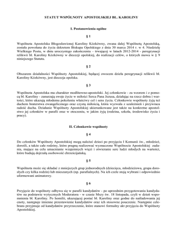 STATUT WSPÓLNOTY APOSTOLSKIEJ BŁ. KAROLINY I. Postanowienia ogólne §1 Wspólnota Apostolska Błogosławionej Karoliny Kózkówny, zwana dalej Wspólnotą Apostolską, została powołana do życia dekretem Biskupa Opolskiego z dnia 30 marca 2014 r. w 4. Niedzielę Wielkiego Postu, w dniu uroczystego zakończenia – trwającej w latach 2012-2014 - peregrynacji relikwii bł. Karoliny Kózkówny w diecezji opolskiej, do realizacji celów, o których mowa w § 9 niniejszego Statutu. §2 Obszarem działalności Wspólnoty Apostolskiej, będącej owocem dzieła peregrynacji relikwii bł. Karoliny Kózkówny, jest diecezja opolska. §3 Wspólnota Apostolska ma charakter modlitewno-apostolski. Jej członkowie - za wzorem i z pomocą bł. Karoliny - zanurzają swoje życie w miłości Serca Pana Jezusa, działając na rzecz dobra i wartości, które ukazują młodemu pokoleniu właściwy cel i sens życia. Członkowie wspólnoty żyją też duchem braterstwa ewangelicznego oraz czystą miłością, która wyzwala z uzależnień i przywraca radość ducha. Działanie Wspólnoty Apostolskiej ukierunkowane jest także na konkretne apostolstwo jej członków w parafii oraz w otoczeniu, w jakim żyją (rodzina, szkoła, środowisko życia i pracy). II. Członkowie wspólnoty §4 Do członków Wspólnoty Apostolskiej mogą należeć dzieci po przyjęciu I Komunii św., młodzież, dorośli, a także całe rodziny, które pragną realizować wyznaczone Wspólnocie Apostolskiej zadania, mające na celu umacnianie wzajemnych więzi i otwieranie serc ludzi młodych na wartości, które budują dojrzałą osobowość chrześcijańską. §5 Wspólnota może się składać z mniejszych grup jednorodnych (dziecięca, młodzieżowa, grupa dorosłych czy kilka rodzin) lub mieszanych (np. parafialnych). Na ich czele stoją wybrani i odpowiednio uformowani animatorzy. §6 Przyjęcie do wspólnoty odbywa się w parafii kandydatów - po uprzednim przygotowaniu kandydatów na podstawie wytycznych Moderatora - w czasie Mszy św. 18 listopada, czyli w dzień wspomnienia bł. Karoliny. Po homilii, ukazującej postać bł. Karoliny oraz godne do naśladowania jej cnoty, następuje imienne przestawienie kandydatów oraz ich stosowne pouczenie. Następnie celebrans przyjmuje od kandydatów przyrzeczenie, które stanowi formalny akt przyjęcia do Wspólnoty Apostolskiej. §7 Każdy nowo przyjęty członek Wspólnoty Apostolskiej zostaje wpisany do Księgi Wspólnoty Apostolskiej przechowywanej w jej siedzibie w Jełowej, otrzymuje legitymację oraz niniejszy Statut. §8 Przynależność do Wspólnoty Apostolskiej ustaje na skutek: 1. dobrowolnego wystąpienia ze Wspólnoty Apostolskiej; 2. usunięcia, czyli wydalenia na skutek uporczywego trwania w gorszącej postawie moralnej; decyzję o usunięciu podejmuje Proboszcz parafii członka w porozumieniu z Moderatorem Wspólnoty Apostolskiej; 3. rozwiązania Wspólnoty Apostolskiej. Cele działania Wspólnoty Apostolskiej oraz obowiązki jego członków. §9 Wspólnota Apostolska stawia sobie za cel: 1. duchowy i osobowy rozwój swoich członków przez praktykowanie życia sakramentalnego i modlitwy, tak indywidualnej jak i wspólnotowej; 2. ożywianie poczucia godności dziecka Bożego, zwłaszcza u dzieci i ludzi młodych; 3. inspirowanie do życia w czystości serca, duszy i ciała i budzenie szacunku wobec tajemnicy i daru życia; 4. przygotowanie do przyjęcia i odpowiedzialnego przeżycia daru miłości, a także podejmowania odpowiedzialności za wspólnotę rodzinną, szkolną i parafialną. § 10 W nawiązaniu do celów wymienionych w § 9, Wspólnota Apostolska wyznacza sobie następujący, w symboliczny sposób ujęty, program: 1. Adoracja Pana Jezusa w Jego Najświętszym Sercu, trwanie przed Jezusem Eucharystycznym w każdy I piątek miesiąca, na wzór bł. Karoliny, która mimo wielu zajęć potrafiła znaleźć czas na modlitwę; 2. Bratersko-siostrzana wspólnota gromadząca swoich członków, na wzór bł. Karoliny, która gromadziła swoje koleżanki i kolegów, aby im czytać Pismo św.; 3. Czysta miłość, jako szczególne zadanie wszystkich członków wspólnoty, aby w ten sposób kierować działanie na konkretną służbę Caritas wobec potrzebujących, opuszczonych, chorych; 4. Duch pokuty i pojednania towarzyszący życiu wspólnoty, co najbardziej wyraża się w przystępowaniu do sakramentu pokuty w każdy I piątek miesiąca, a także w podejmowaniu pielgrzymek do szczególnych miejsc; 5. Ewangelizacja we wspólnocie podejmowana na miarę swoich możliwości i sił, jak to czyniła bł. Karolina, ucząc inne dzieci katechezy czy odwiedzając chorych w ich domach; 6. Formacja powołania, czyli odpowiedzialność za kierunek drogi swego życia, który należy odczytać zgodnie z wolą Bożą i pozwolić się prowadzić Duchowi Świętemu, jak to czyniła błogosławiona Patronka. 7. Gotowość na poświęcenie i wzrastanie w przekonaniu, że droga z Jezusem wymaga czasem odwagi, męstwa i samozaparcia, aby nie zranić miłości Jezusa i obronić swoje wartości aż do ofiary życia włącznie, na wzór błogosławionej Męczenniczki. § 11 Dla realizacji ww. celów i zadań, członkowie Wspólnoty Apostolskiej starają się: 1. praktykować spowiedź św. i przyjmować Komunię św. w każdy I piątek miesiąca; 2. przed Mszą św. w I piątek miesiąca adorować przez kilka minut Pana Jezusa w Najświętszym Sakramencie; 3. uczestniczyć we Mszy św. w święto patronalne 18 listopada oraz w inne dni wyznaczone przez Moderatora Wspólnoty Apostolskiej; 4. w dowolnym dniu tygodnia przeczytać wybrany fragment Pisma św. i krótko rozważać przeczytane Słowo Boże; 5. często odmawiać Różaniec św. i propagować tę modlitwę wśród innych; 6. często odmawiać Litanię do bł. Karoliny, aby przez jej wstawiennictwo wypraszać u Boga dla siebie i dla wspólnoty potrzebne łaski; 7. sprzeciwić się złu, tworząc w ten sposób w swoim środo
