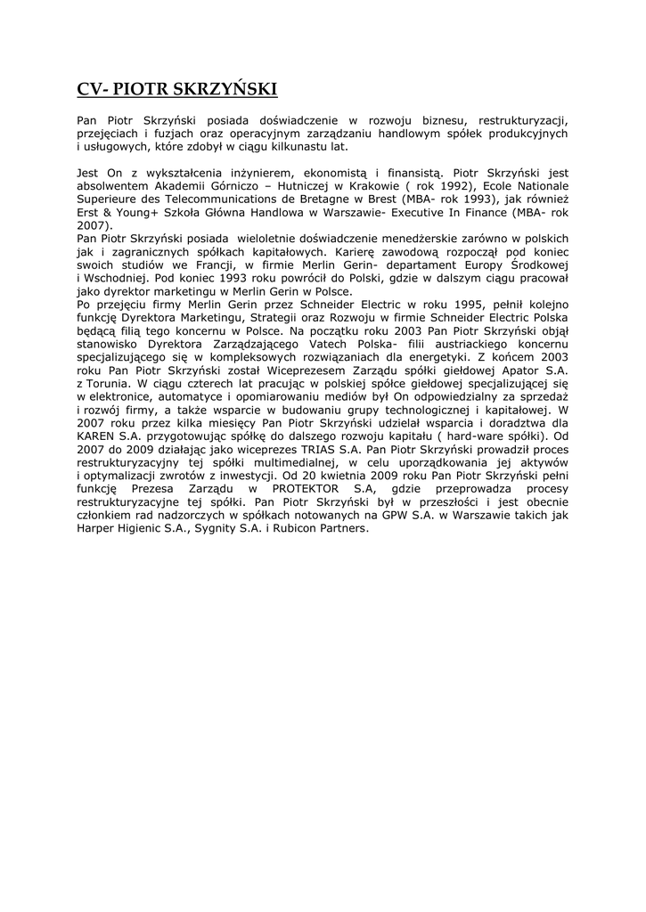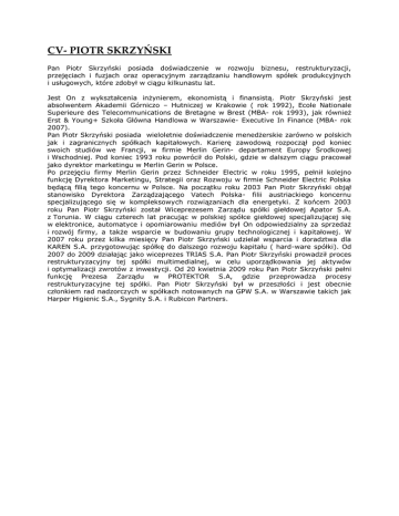 CV- PIOTR SKRZYŃSKI Pan Piotr Skrzyński posiada doświadczenie w rozwoju biznesu, restrukturyzacji, przejęciach i fuzjach oraz operacyjnym zarządzaniu handlowym spółek produkcyjnych i usługowych, które zdobył w ciągu kilkunastu lat. Jest On z wykształcenia inżynierem, ekonomistą i finansistą. Piotr Skrzyński jest absolwentem Akademii Górniczo – Hutniczej w Krakowie ( rok 1992), Ecole Nationale Superieure des Telecommunications de Bretagne w Brest (MBA- rok 1993), jak również Erst & Young+ Szkoła Główna Handlowa w Warszawie- Executive In Finance (MBA- rok 2007). Pan Piotr Skrzyński posiada wieloletnie doświadczenie menedżerskie zarówno w polskich jak i zagranicznych spółkach kapitałowych. Karierę zawodową rozpoczął pod koniec swoich studiów we Francji, w firmie Merlin Gerin- departament Europy Środkowej i Wschodniej. Pod koniec 1993 roku powrócił do Polski, gdzie w dalszym ciągu pracował jako dyrektor marketingu w Merlin Gerin w Polsce. Po przejęciu firmy Merlin Gerin przez Schneider Electric w roku 1995, pełnił kolejno funkcję Dyrektora Marketingu, Strategii oraz Rozwoju w firmie Schneider Electric Polska będącą filią tego koncernu w Polsce. Na początku roku 2003 Pan Piotr Skrzyński objął stanowisko Dyrektora Zarządzającego Vatech Polska- filii austriackiego koncernu specjalizującego się w kompleksowych rozwiązaniach dla energetyki. Z końcem 2003 roku Pan Piotr Skrzyński został Wiceprezesem Zarządu spółki giełdowej Apator S.A. z Torunia. W ciągu czterech lat pracując w polskiej spółce giełdowej specjalizującej się w elektronice, automatyce i opomiarowaniu mediów był On odpowiedzialny za sprzedaż i rozwój firmy, a także wsparcie w budowaniu grupy technologicznej i kapitałowej. W 2007 roku przez kilka miesięcy Pan Piotr Skrzyński udzielał wsparcia i doradztwa dla KAREN S.A. przygotowując spółkę do dalszego rozwoju kapitału ( hard-ware spółki). Od 2007 do 2009 działając jako wiceprezes TRIAS S.A. Pan Piotr Skrzyński prowadził proces restrukturyzacyjny tej spółki multimedialnej, w celu uporządkowania jej aktywów i optymalizacji zwrotów z inwestycji. Od 20 kwietnia 2009 roku Pan Piotr Skrzyński pełni funkcję Prezesa Zarządu w PROTEKTOR S.A, gdzie przeprowadza procesy restrukturyzacyjne tej spółki. Pan Piotr Skrzyński był w przeszłości i jest obecnie członkiem rad nadzorczych w spółkach notowanych na GPW S.A. w Warszawie takich jak Harper Higienic S.A., Sygnity S.A. i Rubicon Partners.