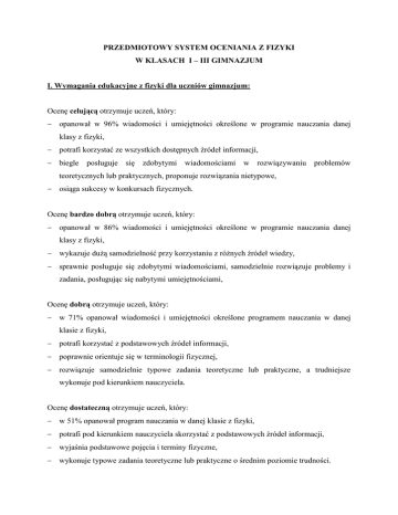 PRZEDMIOTOWY SYSTEM OCENIANIA Z FIZYKI W KLASACH I – III GIMNAZJUM I. Wymagania edukacyjne z fizyki dla uczniów gimnazjum: Ocenę celującą otrzymuje uczeń, który: − opanował w 96% wiadomości i umiejętności określone w programie nauczania danej klasy z fizyki, − potrafi korzystać ze wszystkich dostępnych źródeł informacji, − biegle posługuje się zdobytymi wiadomościami w rozwiązywaniu problemów teoretycznych lub praktycznych, proponuje rozwiązania nietypowe, − osiąga sukcesy w konkursach fizycznych. Ocenę bardzo dobrą otrzymuje uczeń, który: − opanował w 86% wiadomości i umiejętności określone w programie nauczania danej klasy z fizyki, − wykazuje dużą samodzielność przy korzystaniu z różnych źródeł wiedzy, − sprawnie posługuje się zdobytymi wiadomościami, samodzielnie rozwiązuje problemy i zadania, posługując się nabytymi umiejętnościami, Ocenę dobrą otrzymuje uczeń, który: − w 71% opanował wiadomości i umiejętności określone programem nauczania w danej klasie z fizyki, − potrafi korzystać z podstawowych źródeł informacji, − poprawnie orientuje się w terminologii fizycznej, − rozwiązuje samodzielnie typowe zadania teoretyczne lub praktyczne, a trudniejsze wykonuje pod kierunkiem nauczyciela. Ocenę dostateczną otrzymuje uczeń, który: − w 51% opanował program nauczania w danej klasie z fizyki, − potrafi pod kierunkiem nauczyciela skorzystać z podstawowych źródeł informacji, − wyjaśnia podstawowe pojęcia i terminy fizyczne, − wykonuje typowe zadania teoretyczne lub praktyczne o średnim poziomie trudności. Ocenę dopuszczającą otrzymuje uczeń, który: − w 31% opanował program nauczania w danej klasie z fizyki, − zna podstawowe pojęcia i definicje w stopniu umożliwiającym dalsze zdobywanie wiedzy, − rozwiązuje typowe zadania teoretyczne i praktyczne o niewielkim stopniu trudności, przy wyraźnej pomocy nauczyciela. Ocenę niedostateczną otrzymuje uczeń, który: − nie posiada podstawowej wiedzy określonej w programie nauczania danej klasy z fizyki, co uniemożliwia kontynuację nauki, − nie potrafi korzystać ze źródeł informacji fizycznej, − nie potrafi rozwiązać podstawowych problemów nawet przy pomocy nauczyciela. II. Sposobami sprawdzenia osiągnięć edukacyjnych ucznia z fizyki są: 1. Prace klasowe (sprawdziany) kończące każdy dział nauczania: • sprawdzanie opanowania wiedzy teoretycznej, • sprawdzanie umiejętności stosowania poznanej wiedzy w sytuacjach typowych, • sprawdzanie umiejętności stosowania poznanej wiedzy w sytuacjach problemowych, • rozwiązywanie zadań testowych. W ciągu semestru przewidywane są całogodzinne sprawdziany pisemne po zakończeniu działu, które nauczyciel zapowiada z tygodniowym wyprzedzeniem. Sprawdziany są obowiązkowe, w razie nieobecności ucznia z przyczyn losowych na sprawdzianie nauczyciel wyznacza dodatkowy termin w ciągu dwóch tygodni od rozdania prac. Nieobecność na sprawdzianie wynikająca z celowego unikania przez ucznia jest równoznaczna z otrzymaniem oceny niedostatecznej. 2. Kartkówki: • kartkówki obejmujące swym zakresem trzy ostatnie lekcje, • kartkówki sprawdzające zadania domowe. Prace klasowe, kartkówki są oceniane zgodnie z wymaganą ilością punktów na daną ocenę. Progi procentowe poszczególnych ocen wg skali punktowej: celujący powyżej 95% punktów, bardzo dobry od 86% do 95% punktów, dobry od 71% do 85% punktów, dostateczny od 51% do 70% punktów, dopuszczający od 31% do50 % punktów, niedostateczny od 0% do 30% punktów. 3. Wypowiedzi ustne: • odpowiedzi, • zabieranie głosu na lekcji. Przy odpowiedzi ustnej obowiązuje znajomość materiału z trzech ostatnich lekcji, w przypadku lekcji powtórzeniowych - całego rozdziału. 4. Prace domowe: • zadania domowe obserwacyjne, • zadania domowe obliczeniowe, • zadania domowe polegające na napisaniu krótkiej informacji na zadany temat. Prace domowe (pisemne i ustne) - ocenie podlegają: pomysłowość rozwiązania, poprawność rzeczowa, umiejętność prezentacji, zgodność z poziomem wymagań. 5. Aktywność na lekcji: • wypowiedzi w czasie lekcji, • wyciąganie wniosków z przeprowadzanych doświadczeń, • rozwiązywanie zadań, • umiejętność pracy w grupie. 6. Prace doświadczalne: • wykonywanie doświadczeń na lekcji pod kierunkiem nauczyciela, • wykonywanie doświadczeń domowych i przedstawianie na lekcji sprawozdań z tych doświadczeń. 7. Udział w konkursach fizycznych - szkolnych i pozaszkolnych. 8. Zeszyt przedmiotowy: • kompletność zeszytu, • przejrzystość, • systematyczność zapisów, • walory estetyczne. 9. Systematyczne i poprawne prowadzenie zeszytu ćwiczeń. 10. Przygotowywanie innych prac, np. referatów, projektów itp. Wagi ocen: Sprawdzian/Praca klasowa 100% Test wiadomości/Test online 90% Konkurs 30% Kartkówka 60% Odpowiedź ustna 80% Ćwiczenia praktyczne 60% Praca domowa/zadanie domowe 20% Referat 30% Prezentacja multimedialna 60% Praca w grupie/praca na lekcji 40% Aktywność 60% Projekt edukacyjny 80% Prowadzenie zeszytu 10% W przypadku stwierdzenia niesamodzielności pracy pisemnej, zadania domowego, odpowiedzi ustnej lub innych, nauczyciel ma prawo obniżyć uzyskaną ocenę, nawet do stopnia „niedostateczny”. Ocena prac długoterminowych i zadań domowych oddanych po wyznaczonym terminie również będzie obniżona. IV. Uczeń może zgłosić jedno (dwa – 2h tyg. fizyki) nieprzygotowanie w semestrze (nie dotyczy zapowiedzianych sprawdzianów, kartkówek, lekcji powtórzeniowych). Nieprzygotowanie do zajęć uczeń zgłasza na początku lekcji (podczas ustalania obecnych i nieobecnych), zwalnia ucznia z przyniesienia pomocy potrzebnych do lekcji, odpowiedzi ustnej, kontroli zadania domowego (którego termin realizacji przypada w tym dniu) i pisania kartkówki, natomiast nie zwalnia ucznia z pracy na bieżącej lekcji i z oceny 