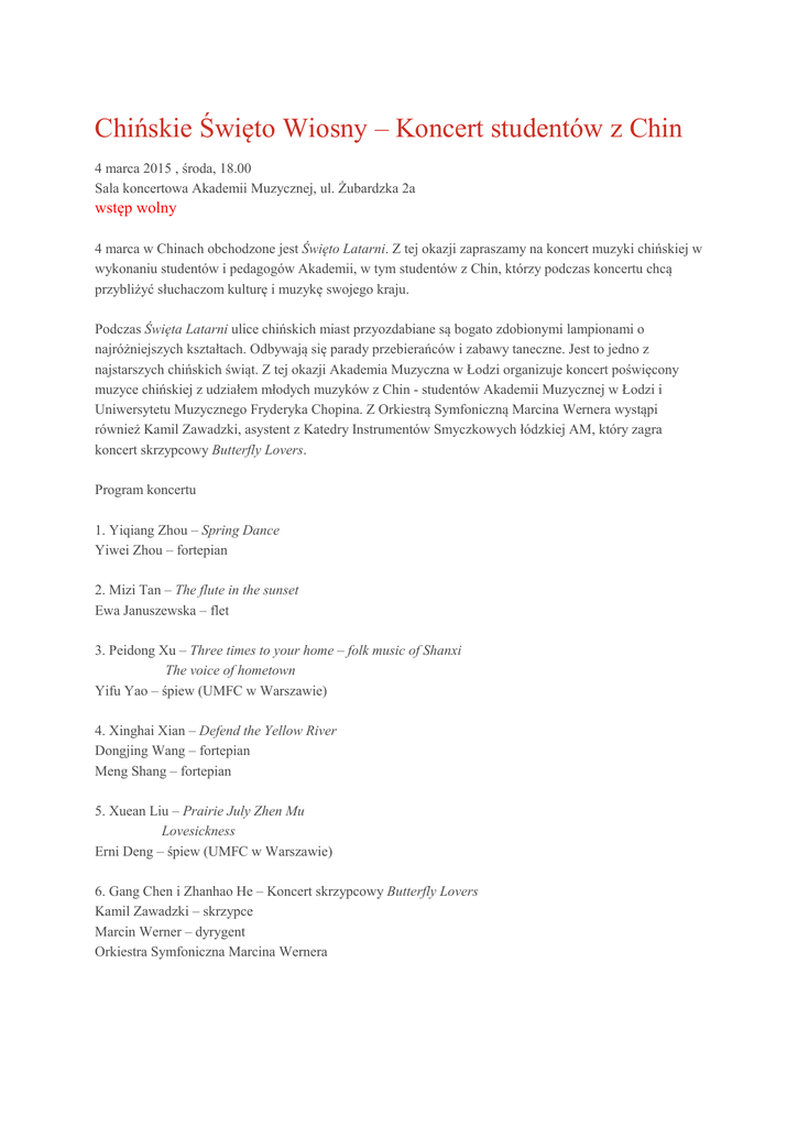 Chińskie Święto Wiosny – Koncert studentów z Chin 4 marca 2015 , środa, 18.00 Sala koncertowa Akademii Muzycznej, ul. Żubardzka 2a wstęp wolny 4 marca w Chinach obchodzone jest Święto Latarni. Z tej okazji zapraszamy na koncert muzyki chińskiej w wykonaniu studentów i pedagogów Akademii, w tym studentów z Chin, którzy podczas koncertu chcą przybliżyć słuchaczom kulturę i muzykę swojego kraju. Podczas Święta Latarni ulice chińskich miast przyozdabiane są bogato zdobionymi lampionami o najróżniejszych kształtach. Odbywają się parady przebierańców i zabawy taneczne. Jest to jedno z najstarszych chińskich świąt. Z tej okazji Akademia Muzyczna w Łodzi organizuje koncert poświęcony muzyce chińskiej z udziałem młodych muzyków z Chin - studentów Akademii Muzycznej w Łodzi i Uniwersytetu Muzycznego Fryderyka Chopina. Z Orkiestrą Symfoniczną Marcina Wernera wystąpi również Kamil Zawadzki, asystent z Katedry Instrumentów Smyczkowych łódzkiej AM, który zagra koncert skrzypcowy Butterfly Lovers. Program koncertu 1. Yiqiang Zhou – Spring Dance Yiwei Zhou – fortepian 2. Mizi Tan – The flute in the sunset Ewa Januszewska – flet 3. Peidong Xu – Three times to your home – folk music of Shanxi The voice of hometown Yifu Yao – śpiew (UMFC w Warszawie) 4. Xinghai Xian – Defend the Yellow River Dongjing Wang – fortepian Meng Shang – fortepian 5. Xuean Liu – Prairie July Zhen Mu Lovesickness Erni Deng – śpiew (UMFC w Warszawie) 6. Gang Chen i Zhanhao He – Koncert skrzypcowy Butterfly Lovers Kamil Zawadzki – skrzypce Marcin Werner – dyrygent Orkiestra Symfoniczna Marcina Wernera