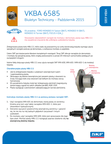 VKBA 6585 VKBA 6585 Biuletyn Techniczny - Październik 2015 Oś przednia: FORD MONDEO IV Saloon (BA7), MONDEO IV (BA7), MONDEO IV Turnier (BA7), FOCUS II (DA_) Stosowanie odpowiednich narzędzi do montażu i demontażu piasty typu HBU 2.1 ma zasadnicze znaczenie dla uniknięcia uszkodzenia łożyska. Zintegrowana piasta koła HBU 2.1, która stała się powszechną na rynku konstrukcją łożyska wymaga użycia specjalnych narzędzi podczas jej demontażu, a zwłaszcza montażu w pojeździe. Celem SKF jest dostarczenie klientom kompletnych rozwiązań. Teraz SKF oferuje narzędzia do demontażu i montażu tej specjalnej piasty, które znajdą zastosowanie w ponad 20 milionach samochodów jeżdżących po europejskich drogach. Istotne fakty dotyczące piasty HBU 2.1 oraz użycia narzędzi SKF VKN 600, VKN 601 i VKN 602-1 do instalacji łożyska: Bieżnia Charakterystyka piasty HBU 2.1 • Jest to zintegrowane łożysko z ustalonym wewnętrznym luzem i wyprowadzoną piastą. • Obracająca się bieżnia wewnętrzna jest zarazem piastą z otworami na śruby mocujące koło oraz otworami lub kołkami do montażu tarczy hamulcowej. • W uszczelnieniu łożyska może być zintegrowany pierścień magnetyczny dostarczający sygnał do takich układów jak ABS, ASR i ESP. • Piasta występuje z pierścieniem zabezpieczającym lub bez pierścienia. Instrukcja montażu piasty HBU 2.1 za pomocą zestawu narzędzi SKF: 1. Użyć narzędzia VKN 601 do demontażu starej piasty ze zwrotnicy (można przy tym użyć także narzędzia VKN 602-1, które jest siłownikiem hydraulicznym). 2. Ostrożnie wyczyścić powierzchnię wewnętrzną zwrotnicy i upewnić się, że nie ma na niej żadnych głębokich zarysowań i innych uszkodzeń. 3. Do montażu użyć narzędzia VKN 600, które jest opracowane dla tego typu piast. Montaż piasty HBU 2.1 następuje poprzez działanie siły na zewnętrzną bieżnię łożyska. wewnętrzna Czop piasty Bieżnia zewnętrzna Siła musi działać na zewnętrzną bieżnię aby NIE dopuścić do uszkodzenia piasty. Kierunek montażu Kierunek montażu Etap montażu piasty jest najważniejszą czynnością podczas wymiany a użycie niewłaściwych narzędzi prowadzi do przedwczesnego uszkodzenia łożyska piasty. W czasie montażu za pomocą prasy hydraulicznej często siła przekazywana jest na kołnierz piasty. Z kołnierza poprzez kulki siła jest przekazywana na zewnętrzną bieżnię. Powoduje to uszkodzenie łożyska, przedostawanie się wody do wewnątrz i dalsze zniszczenia. Zdjęcia uszkodzonego łożyska. Zestawy narzędzi SKF HBU 2.1 (VKN 600, VKN 601, VKN 602-1): • Zastosowanie do wszystkich piast typu HBU 2.1. • Posiadają regulowane zaczepy obejmujące piasty o średnicach od 62 do 85 mm. • Możliwość łatwego i szybkiego montażu (VKN 600) oraz demontażu (VKN 601) nie wymagającego demontażu zwrotnicy ani czujnika ABS. • Zawiera link do elektronicznych procedur montażowych. Więcej informacji na temat narzędzi SKF HBU 2.1 można znaleźć na naszej stronie internetowej www.vsm.skf.com VKN 600. Narzędzie do montażu piast typu HBU 2.1 VKN 601. Narzędzie do demontażu piast HBU 2.1. nakrętka piasta zwrotnica przegub Piasta HBU 2.1 wraz ze współpracującymi elementami. Montowanie pewności www.vsm.skf.com ® SKF to zastrzeżony znak handlowy SKF Group. © SKF Group 2015 Treść niniejszej publikacji jest własnością wydawcy i nie może być reprodukowane (nawet częściowo) bez uprzedniego pisemnego pozwolenia. Zapewniono dokładność informacji zawartych w niniejszej publikacji ale wydawca nie przyjmuje żadnej odpowiedzialności za jakiekolwiek szkody lub straty pośrednie, bezpośrednie lub wtórne wynikające z wykorzystania informacji tu zawartych. VKN 602-1. Opcjonalny w użyciu siłownik hydrauliczny.