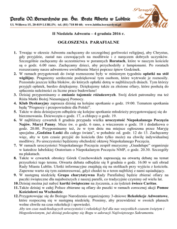 Parafia OO.Bernardynów pw. Św. Brata Alberta w Lublinie Ul. Willowa 15, 20-819 LUBLIN; tel. (81) 718 80 60; www.lublin.bernardyni.pl II Niedziela Adwentu – 4 grudnia 2016 r. OGŁOSZENIA PARAFIALNE 1. Trwając w okresie Adwentu zachęcamy do szczególnej gorliwości religijnej, aby Chrystus, gdy przyjdzie, zastał nas czuwających na modlitwie i z naręczem dobrych uczynków. Szczególnie zachęcamy do uczestnictwa w porannych Roratach, które w naszym kościele są o godz. 6.00 rano. Zachęcamy dzieci, aby przychodziły z lampionami. Po roratach rozszerzamy nasze adwentowe uwielbienie Maryi poprzez śpiew Godzinek. 2. W ramach przygotowań do świąt roznoszone były w minionym tygodniu opłatki na stół wigilijny. Pragniemy serdecznie podziękować tym osobom, które wytrwale je roznosiły. Pozostało jeszcze kilka bloków, do których opłatki dotrą w najbliższych dniach. Tym którzy przyjęli opłatek, bardzo dziękujemy. Dziękujemy także za złożone ofiary, które posłużą do spłacenia należności za liczne prace budowlane! 3. Dzisiaj przypominamy o zmianie tajemnic różańcowych. Swój dzień patronalny ma też Róża Matki Bożej Nieustającej Pomocy. 4. Klub Dyskusyjny zaprasza dzisiaj na kolejne spotkanie o godz. 19:00. Tematem spotkania będą "Prognozy i przepowiednie dla Polski". 5. Także w dniu dzisiejszym odbędzie się kolejne spotkanie młodzieży przygotowującej się do bierzmowania. Dziewczęta o godz. 17, a chłopcy o godz. 19. 6. W najbliższy czwartek 8 grudnia przypada wielka uroczystość Niepokalanego Poczęcia Najśw. Maryi Panny. Msze św. o godz. 6 rano, a wieczorem o godz. 18 i dodatkowa o godz. 20.00. Przypominamy też, że w tym dniu ma miejsce ogłoszona przez Maryję specjalna „Godzina Łaski dla całego świata”, w południe od. godz. 12 do 13. Zachęcamy więc, aby w tym czasie przyjść do kościoła (kto tylko może) na chwilę indywidualnej modlitwy. Po uroczystości będziemy obchodzić oktawę Niepokalanego Poczęcia. 7. W ramach uroczystości Niepokalanego Poczęcia zespół muzyczny „Guadalupe” organizuje w katedrze lubelskiej Oratorium o Niepokalanym Poczęciu NMP, o godz. 20.30. Szczegóły na plakatach. 8. Także w czwartek obrońcy Górek Czechowskich zapraszają na otwartą debatę na temat przyszłości tego terenu. Otwarta debata odbędzie się 8 grudnia o godz. 16.00 w sali obrad Rady Miasta Lublin. Ulotki informacyjne znajdują się na stolikach przy wyjściu z kościoła. Zapewne warto się tym zainteresować, gdyż chodzi tu o teren najbliżej z nami sąsiadujący. 9. W następną niedzielę Grupa charytatywna Rady Parafialnej będzie zbierać ofiary na paczki świąteczne dla najuboższych z naszej parafii, co tradycyjnie czynimy od wielu lat. 10. Dzisiaj można już nabyć kartki świąteczne na życzenia, a za tydzień świece Caritas. 11. Także dzisiaj w całej Polsce zbierane są ofiary do puszki w ramach corocznej akcji Pomoc Kościołowi na Wschodzie. 12. Przygotowując się do Bożego Narodzenia organizujemy 3-dniowe Rekolekcje Adwentowe, które rozpoczną się w następną niedzielę. Prosimy, aby przewidzieć w swoich planach wolne chwile na czas rekolekcji i spowiedzi. Aby ten czas nadchodzących uroczystości i rekolekcji był dla nas wszystkich czasem świętym i błogosławionym, już dzisiaj polecajmy się Bogu w adoracji Najświętszego Sakramentu.